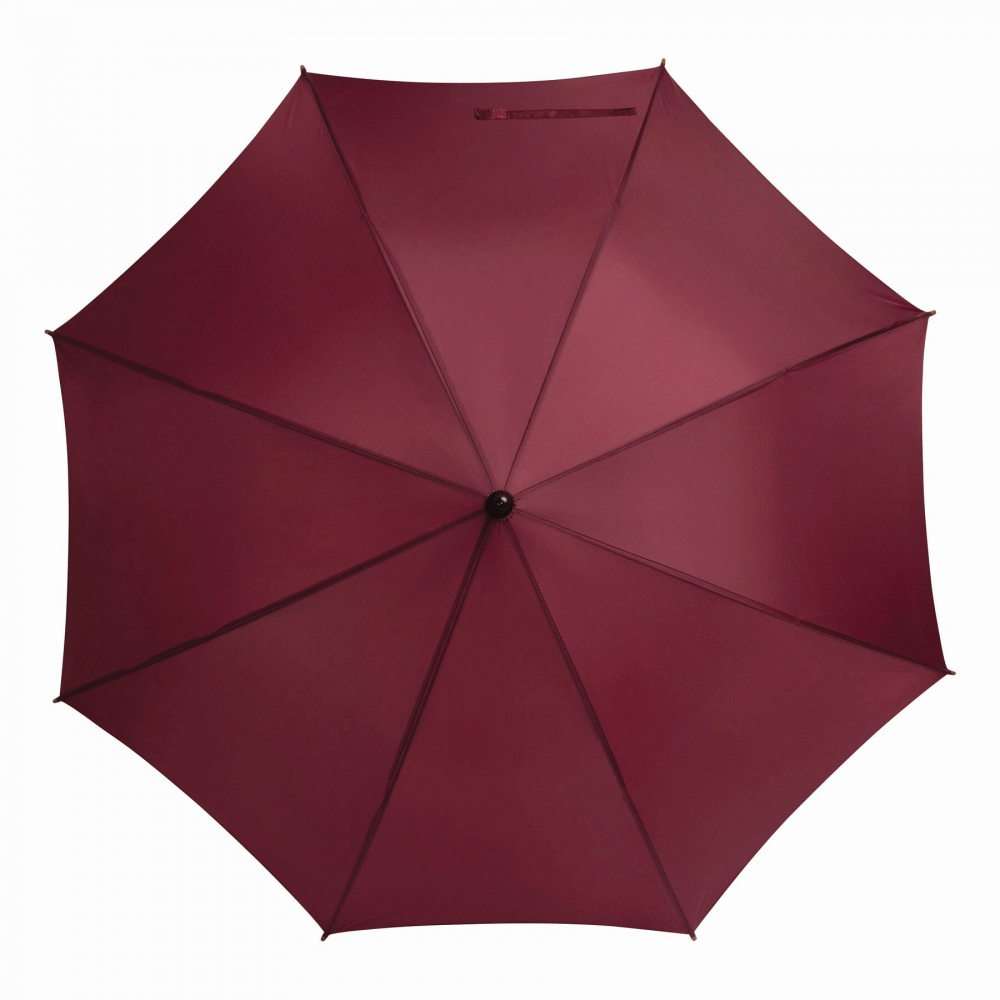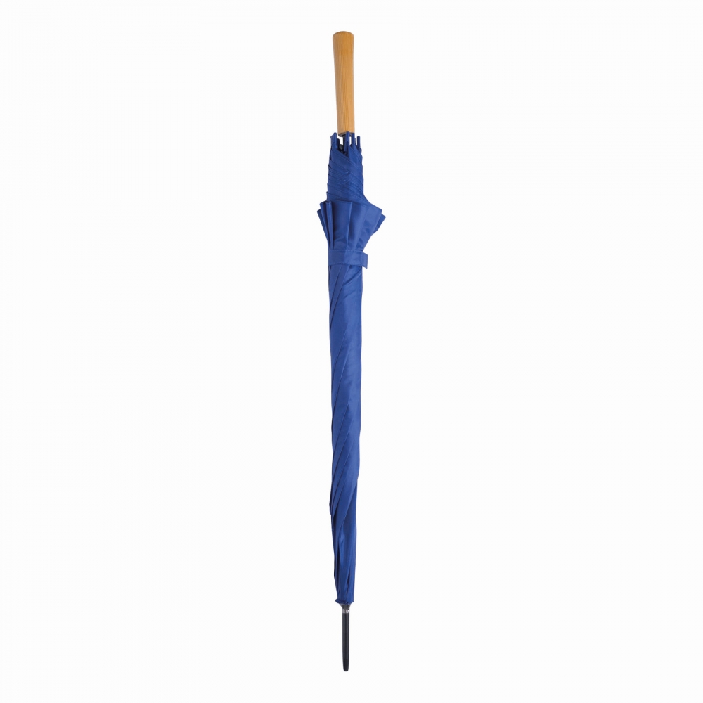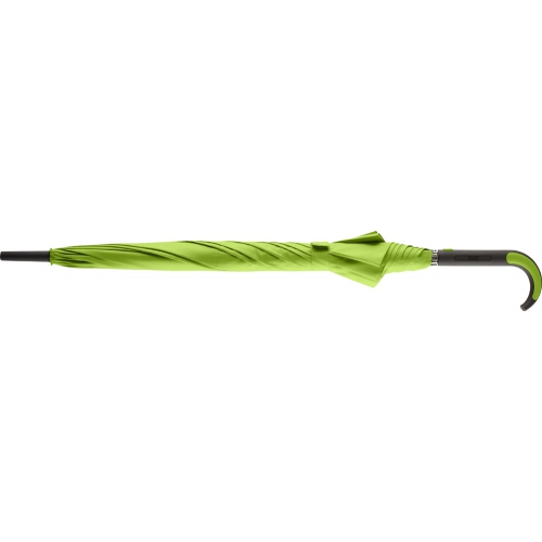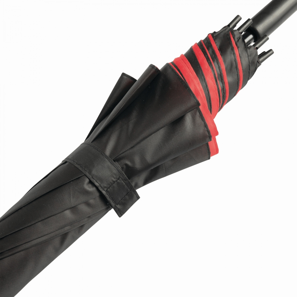 Automatik-Stockschirm LIMBO: Metallstock und -speichen, farblich abgestimmte Kunststofftips, Griff in Holz-Optik, Polyester-Bespannung, Schließband mit Klettverschluss