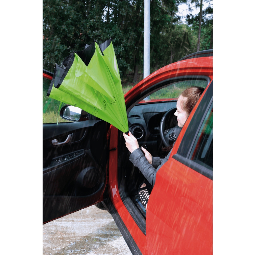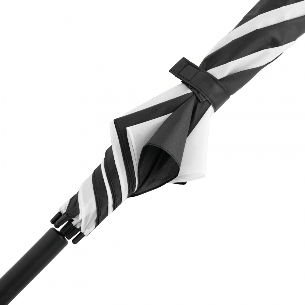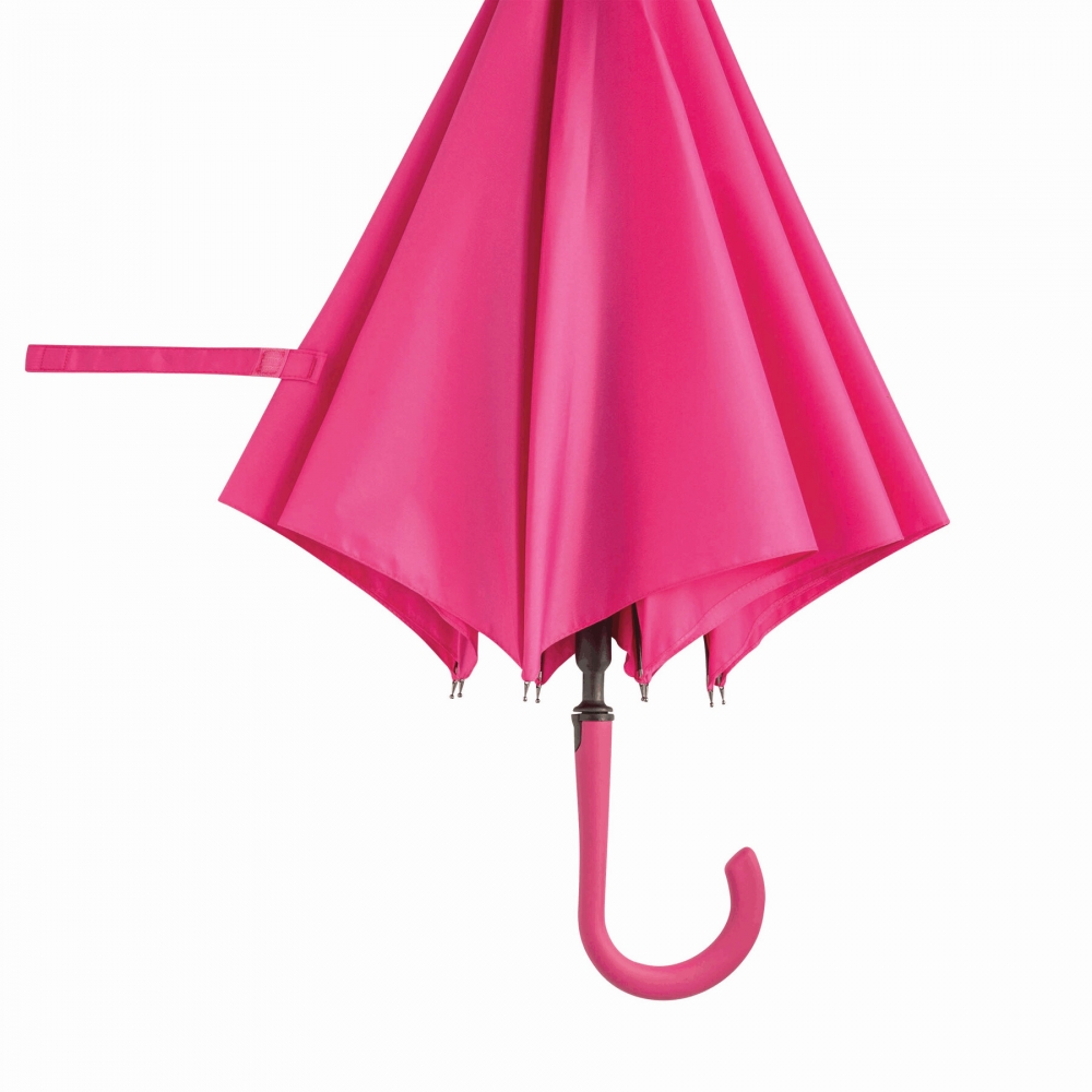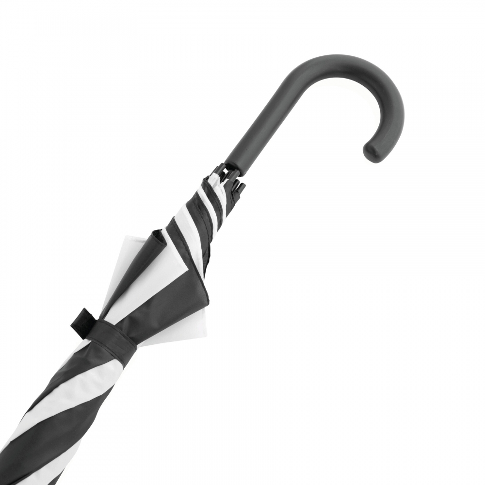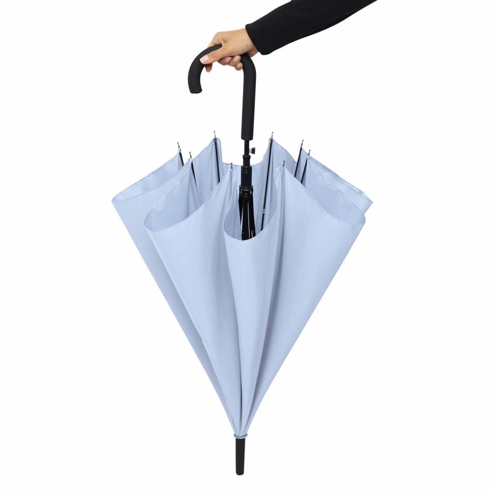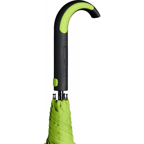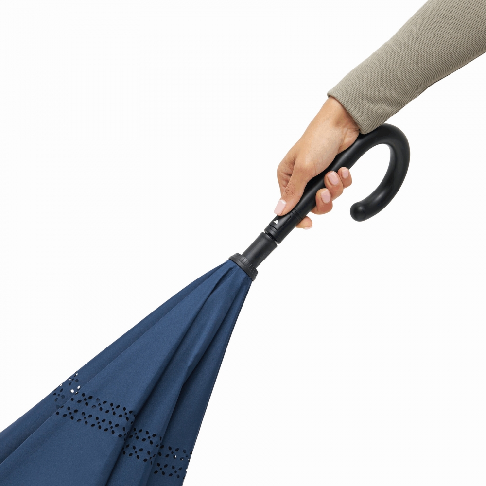 Stockschirm FLIPPED: mit umgekehrtem Öffnungs- und Schließmechanismus, Sicherheitsschieber, freie Hände dank C-Shape-Griff, Doppel-Bezug mit Ventilationsmuster zur Vermeidung von Luftstau, flexibles Gestänge durch Fiberglasspeichen, Metallstock, mit Metalltips, Polyester-Pongee-Bespannung, Schließband mit Klettverschluss