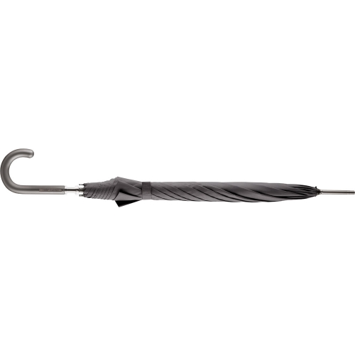 Polyester-Pongee-Bespannung (190T) (hydrophob imprägniert), Glasfiberspeichen-Automatikgestell in schwarz mit Doppeldach - WINDPROOF, AIR-VENT Luft-Zirkulations-System, Glasfiber-Stab (14mm), gerader 'Soft-Touch'-beschichteter Kunststoffgriff in schwarz / silber mit integrierter Automatik-Auslösetase in silberfaben, Kunststoff-Speichentips in schwarz.