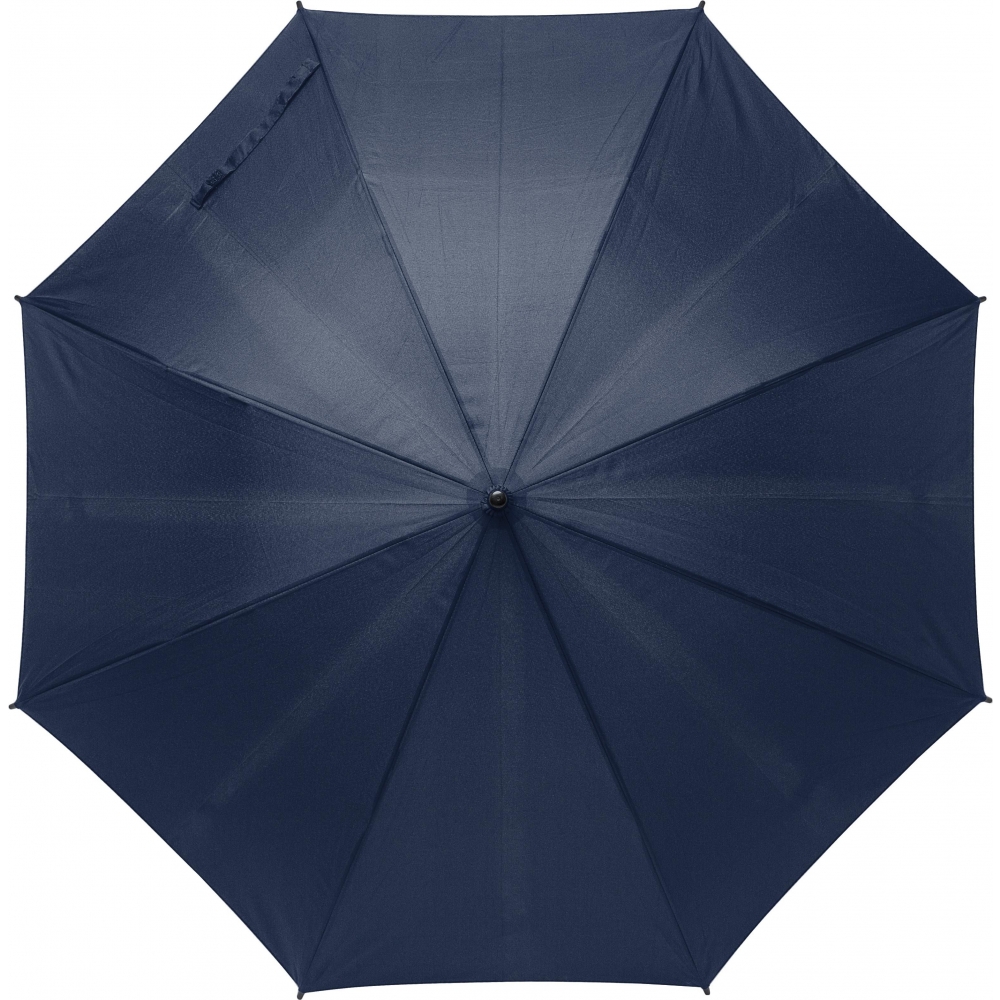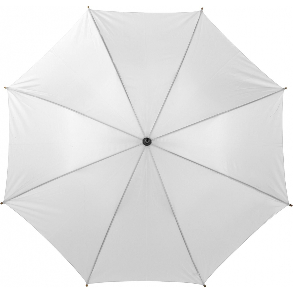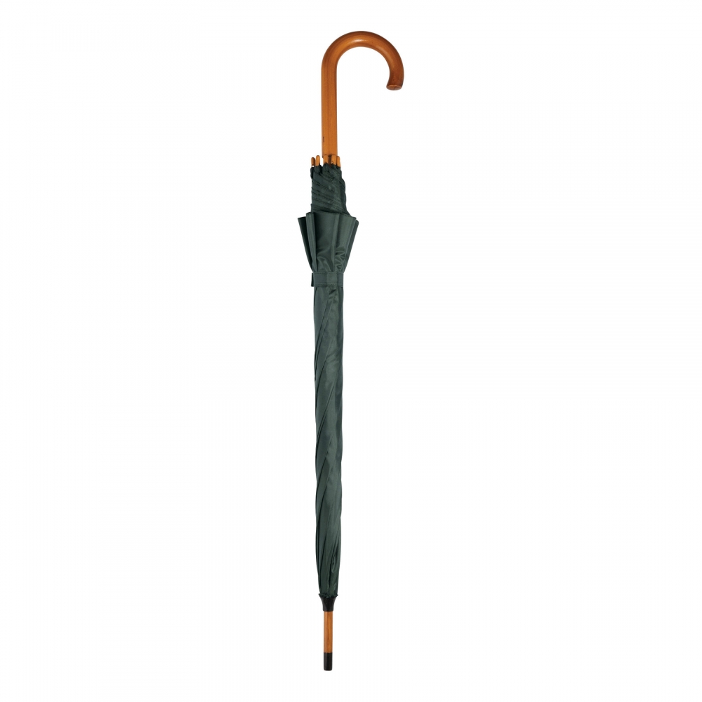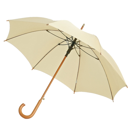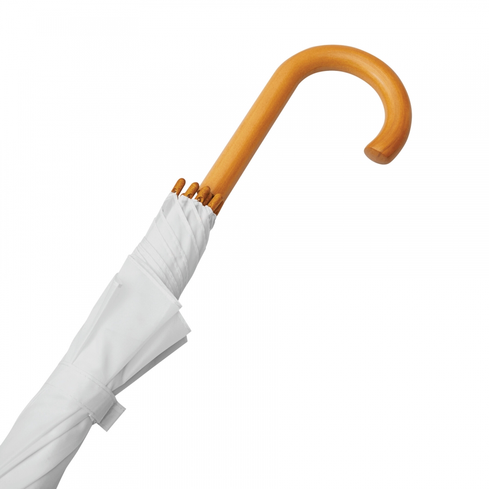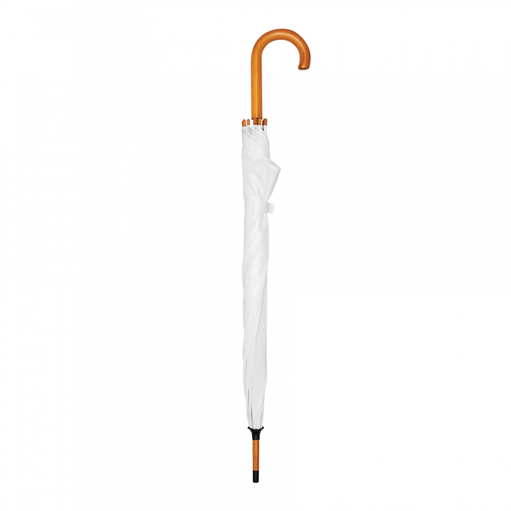 Stockschirm aus Nylon (190T), mit Doppelbespannung, Handöffner, gebogener Krücke und Schaft aus Holz und Tips aus Kunststoff, Gestell und Spitze aus Metall und einem Allover-Druck auf der Innenseite.