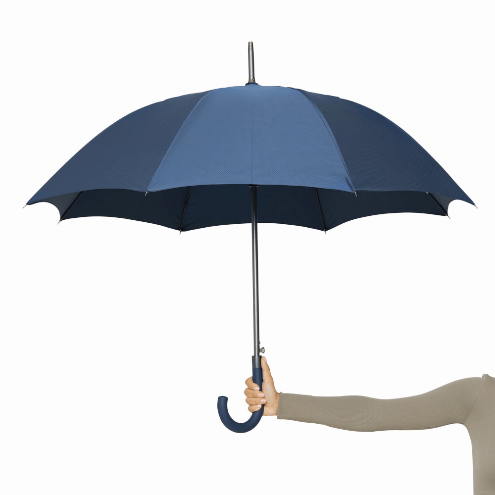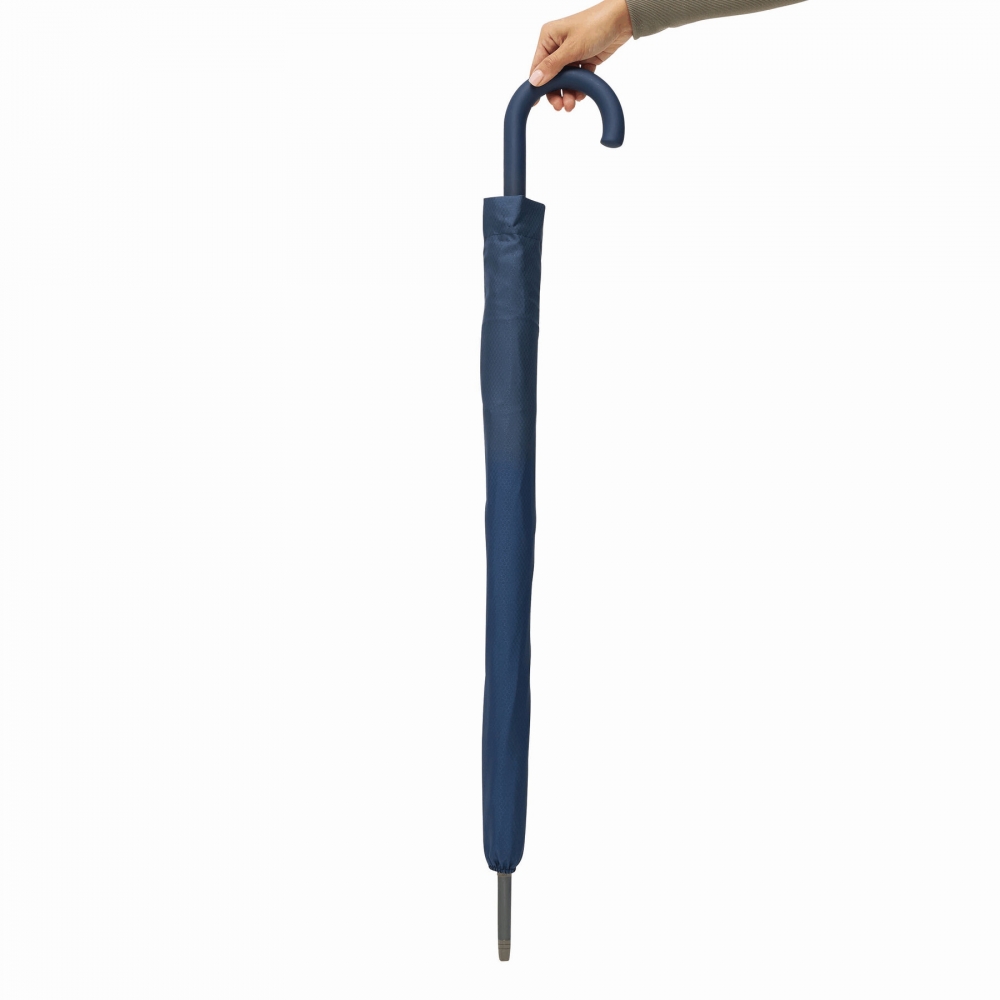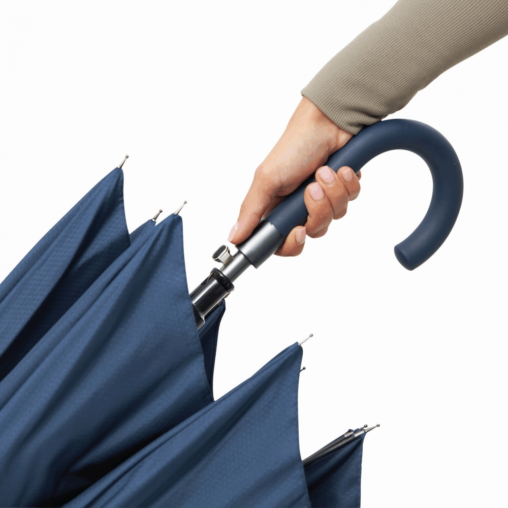 Stockschirm mit Automatik, Polyester-Pongee-Bespannung (190 T) (hydrophob imprägniert), Aluminium-Stab (14 mm) und gerader Griff: Aluminium/Soft-Touch Material-Mix, Metall-Speichentips, GLASFIBER-Speichengestell, WIND-/ÜBERSCHLAGSICHER, ca. 60 cm Speichenlänge, Durchmesser ca. 105 cm, Länge ca. 86 cm, Gewicht 440 g. Erhältlich in den Farben: dunkelgrau und navyblau.