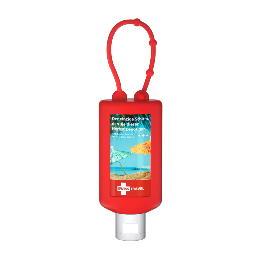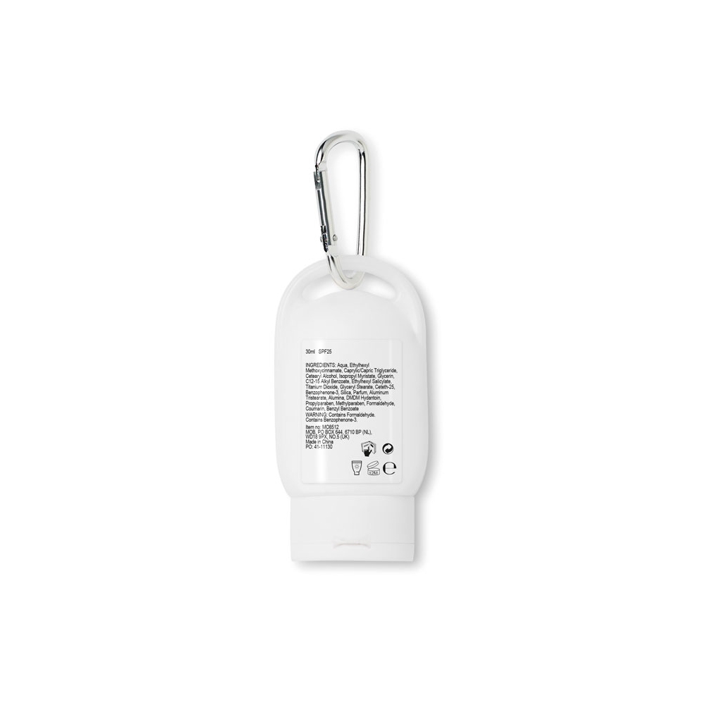 Sonnencreme im Kunststoffbehälter mit farblich abgestimmtem Deckel und Karabiner. SPF: 30. Inhalt: 30 ml