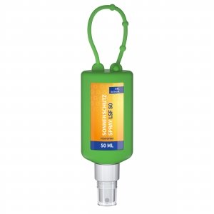 Praktische Kosmetikflasche zum Anhängen! Das Spray mit Silikonhülle ist nicht nur optisch ein echter Hingucker! Raffiniert mit Schlaufe zum an de Strandtasche, den Wander-Rucksack, den Ski-Anorak oder an den Kinderwagen. 50 ml PET Flasche (weiß) mit weißem Pumpaufsatz und transparenter Schutzkappe; Silikonhülle und Schlaufe in Nachfüllbar. Flasche hergestellt aus 100% recyceltem PET, weiß mit leichter R-PET-Färbung. Sonnenschutz-Spray mit LSF 50: Das transparente Sonnenschutz-Spray wirkt sofort, zieht schnell ein, klebt nicht und hinterlässt keine sichtbaren Rückstände auf der Haut. Die wasserfeste Fo ...
