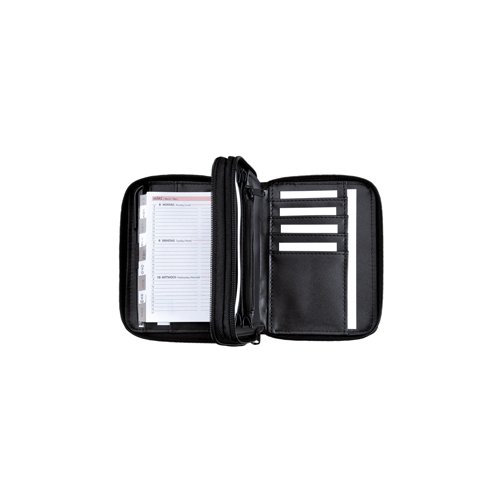Artikel-Nr: 76917500DUO-Systemplaner A7 aus Soft-Nappalederimitat mit zwei Reißverschlüssen, ausgestattet mit: Kalender 1 Woche = 2 Seiten, 3-sprachig D / E / F, Reißverschlussfach, sechs Visitenkartenfächern, Schreibgeräteschlaufe
