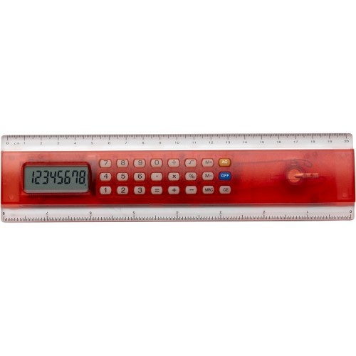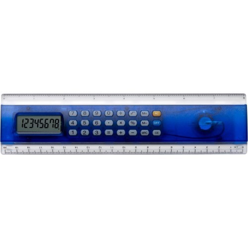 Dual Power Taschenrechner aus Kunststoff mit achtstelligem Display, incl. Knopfbatterie. Rechner ist ausziehbar, unter dem Rechner befinden sich Kugelschreiber mit blauschreibender Mine, Haftnotizen (25 Stk), Haftmarker (125 Stk).