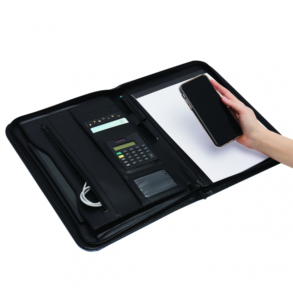 Dokumentenmappe aus Mikrofaser, ca. DIN A4-Format, mit Reißverschluss, integriertem Dual-Power-Taschenrechner mit 8 Ziffern, 7 Einsteckfächern, 3 Stifthaltern (ohne Stifte) und Schreibblock (liniert).