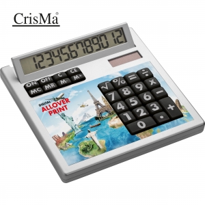 CrisMa Design-Taschenrechner mit 12 Digits und Solar Power aus silbernem Kunststoff. Einzigartig ist die digital bedruckbare Fläche. So einfach kann Ihre Printkampagne auf einem Werbeartikel umgesetzt werden.