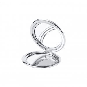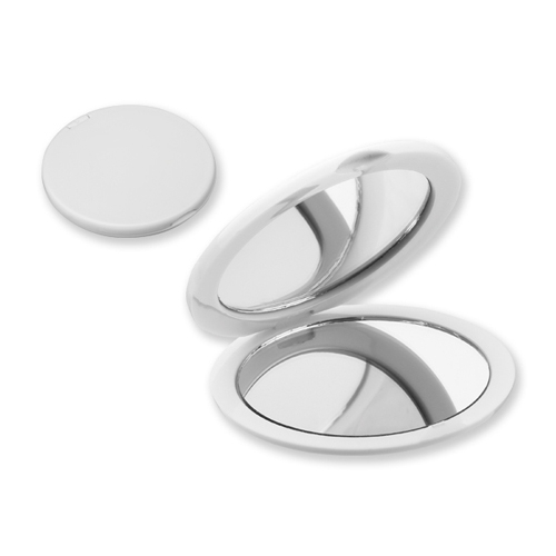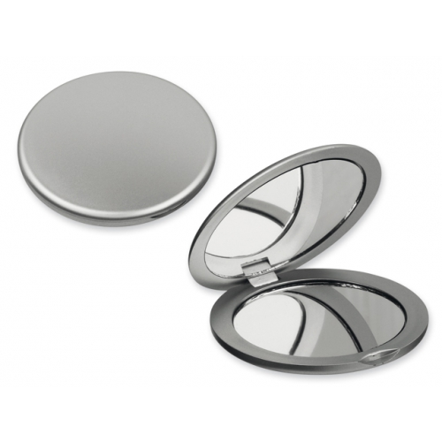 Taschenspiegel aus ABS Kunststoff mit Metallic-Oberfläche, mit einer normalen und einem Vergrößerungsspiegel.