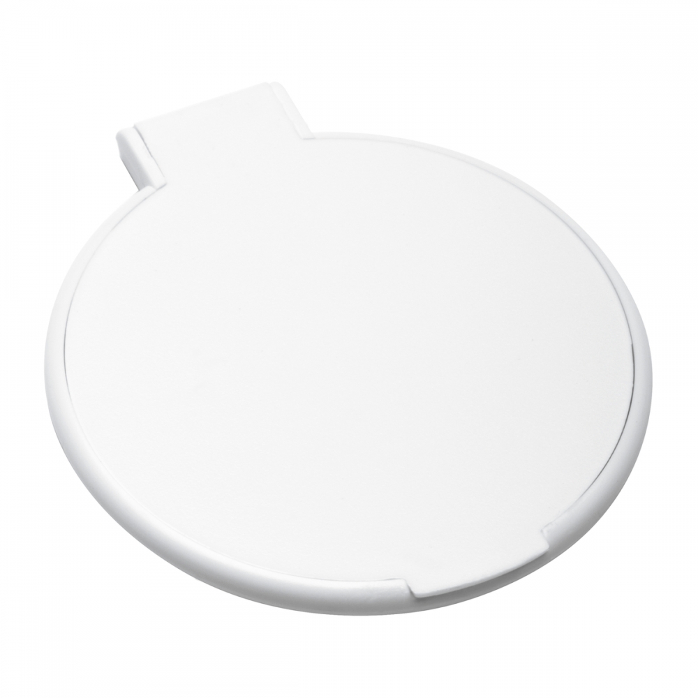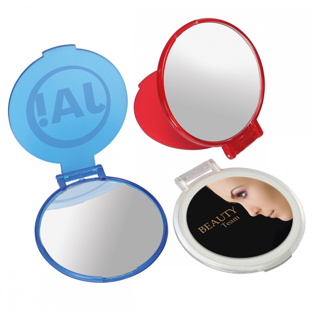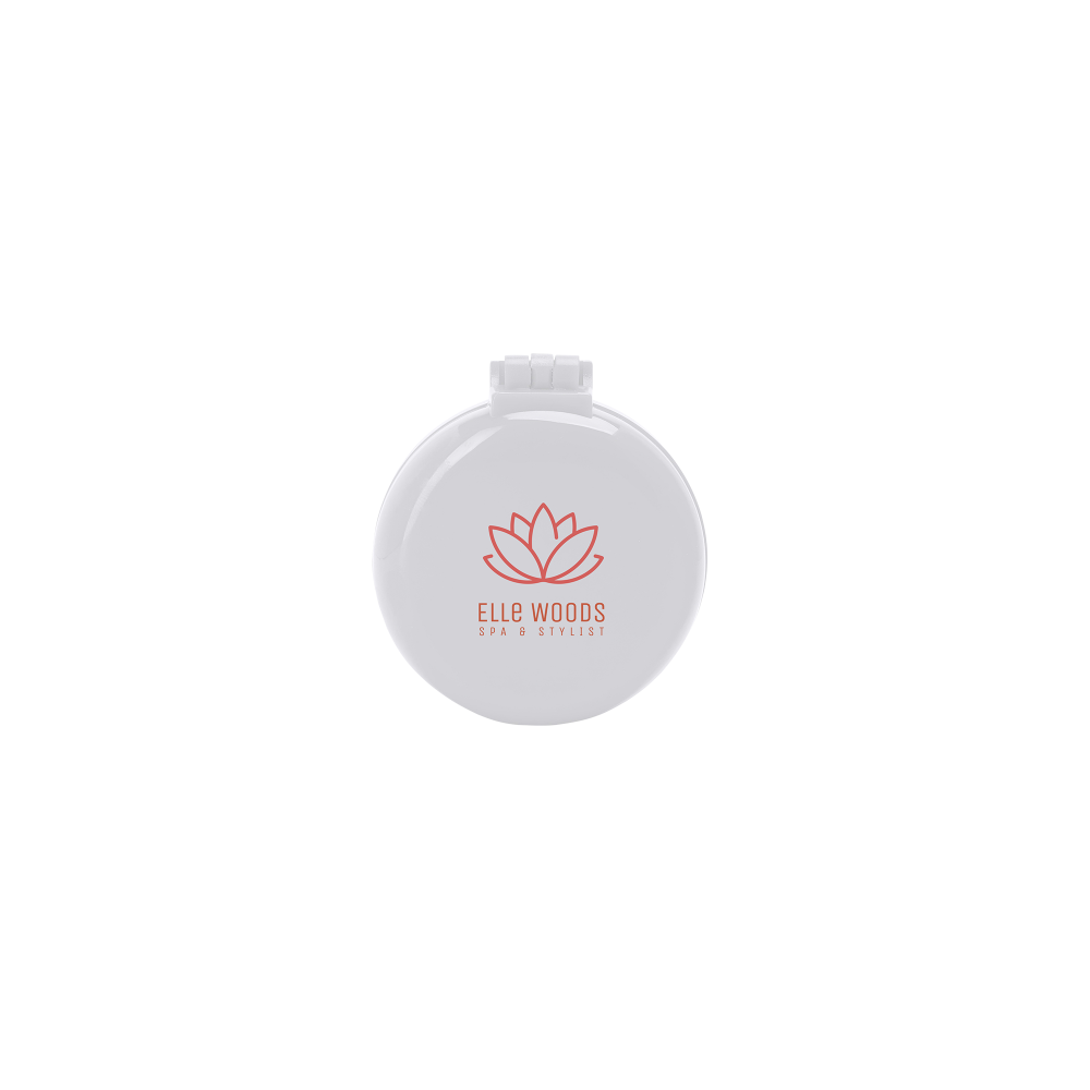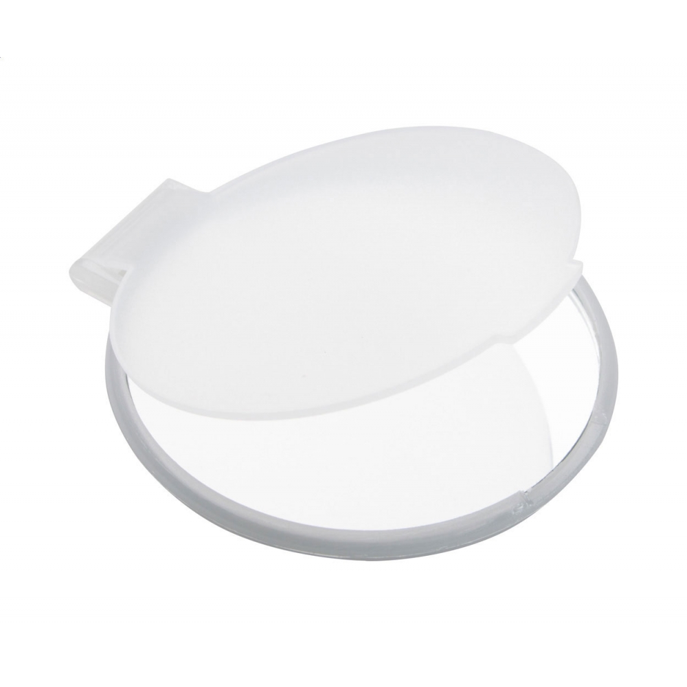 Schminkspiegel aus Kunststoff (PS). Äußerst praktisch, Bedruckung auf der Oberseite. Abmessungen: 70 x 61 x 6 mm. Farbe/n: Gefrostet Rosé, Gefrostet Schwarz, Gefrostet Weiß. Werbeanbringung: Ø 45 mm.