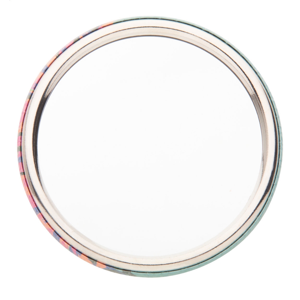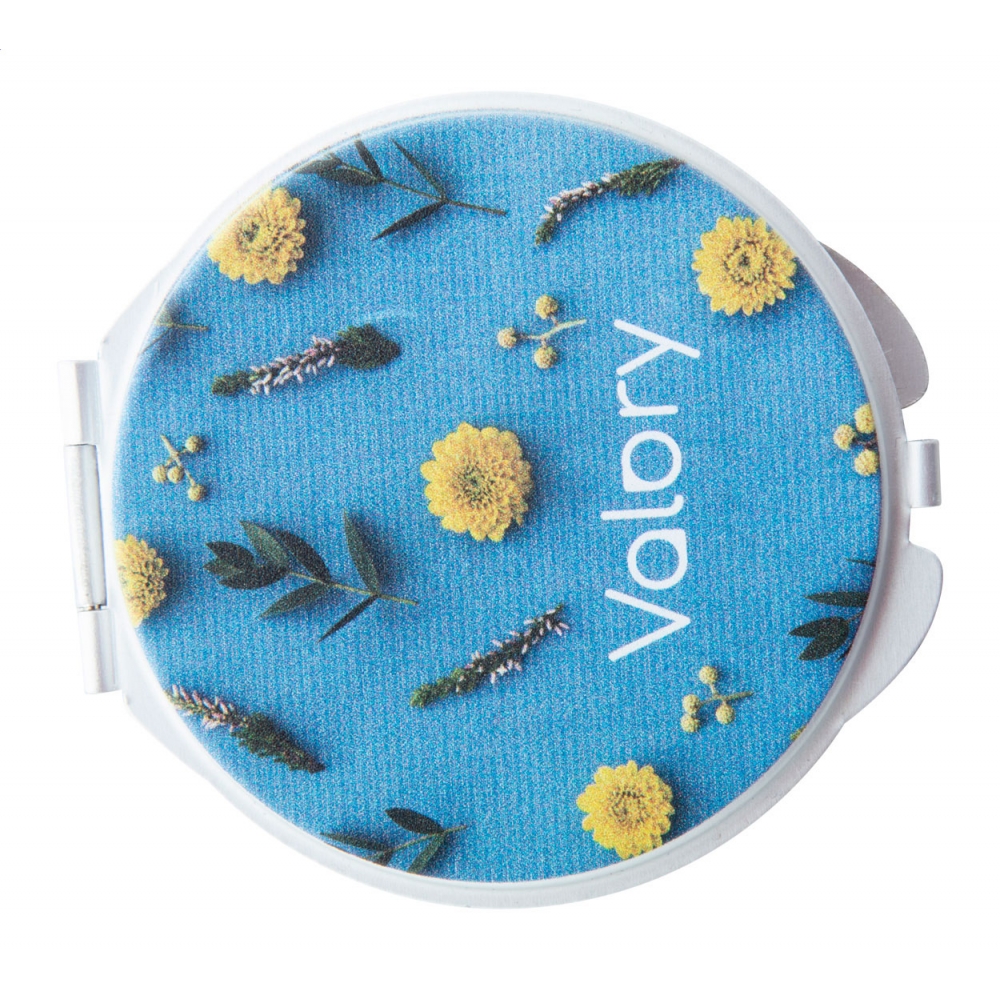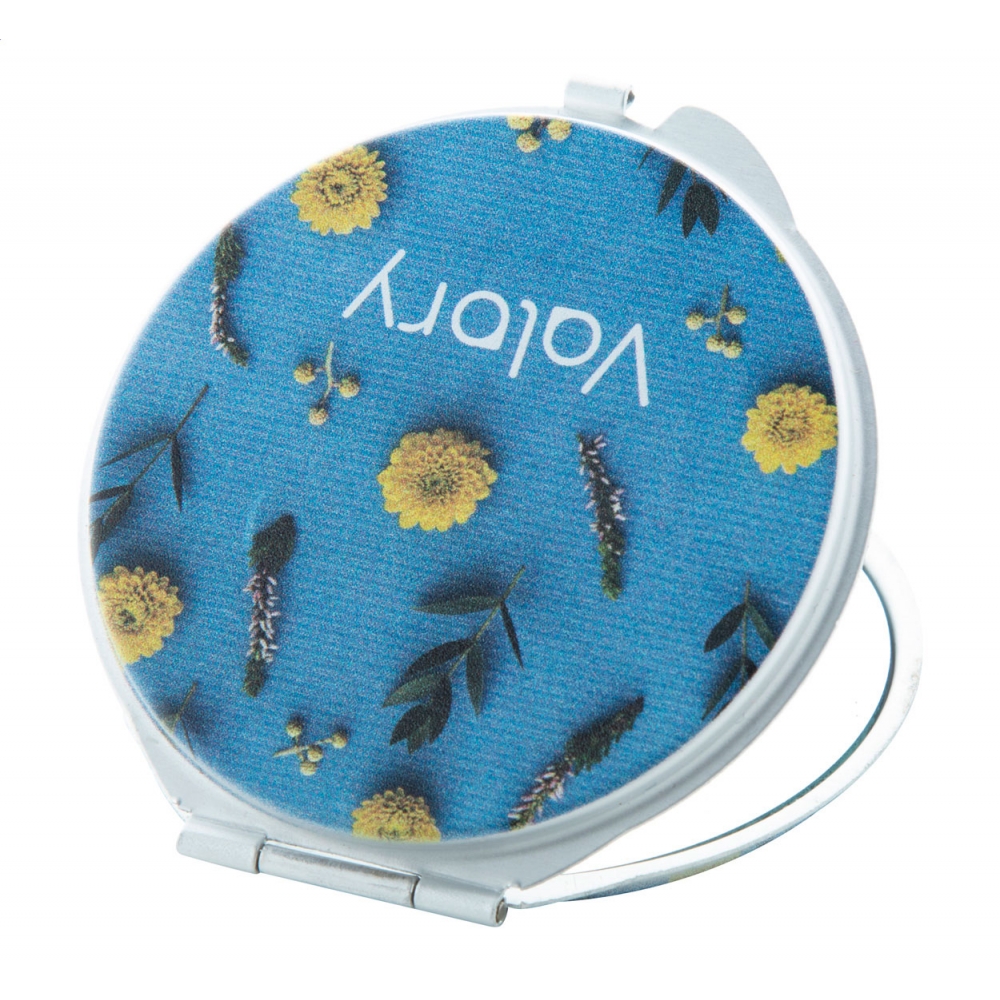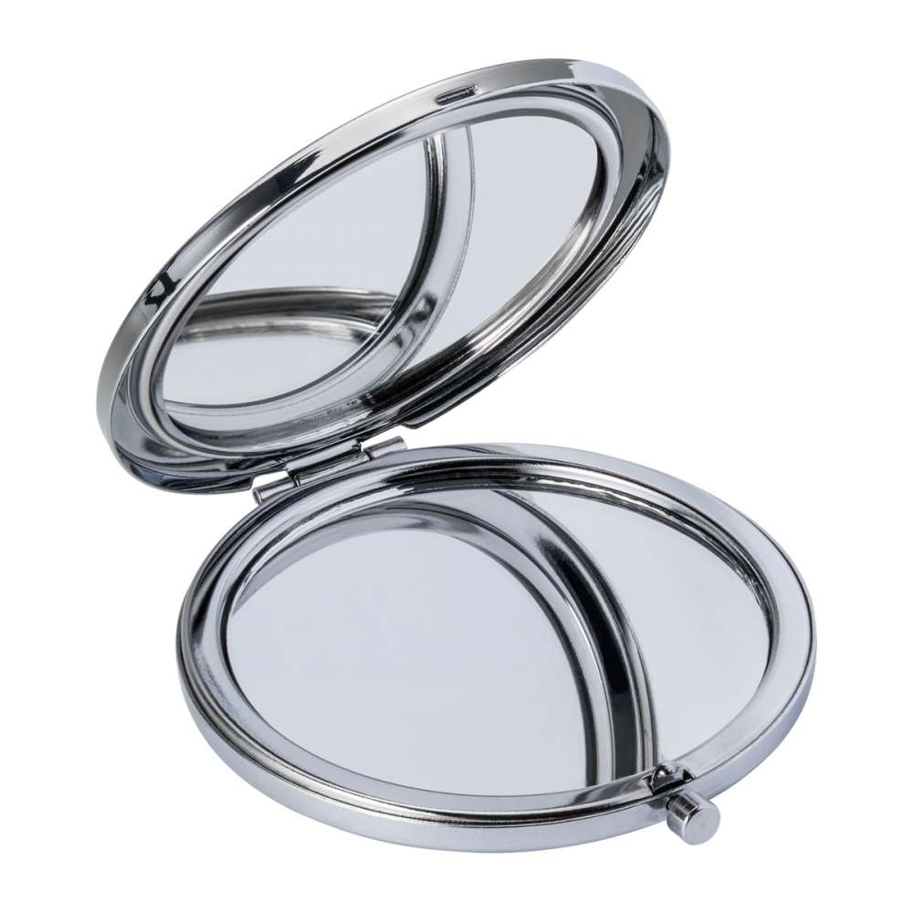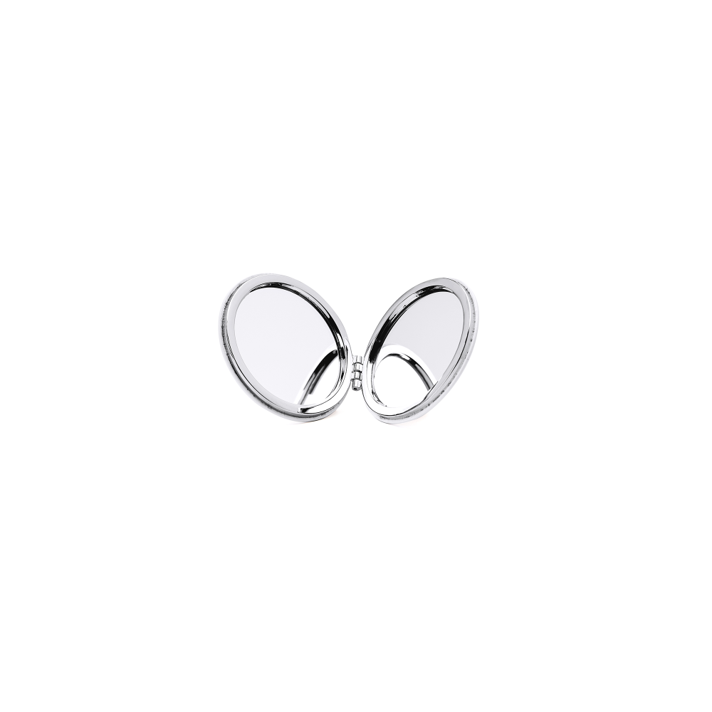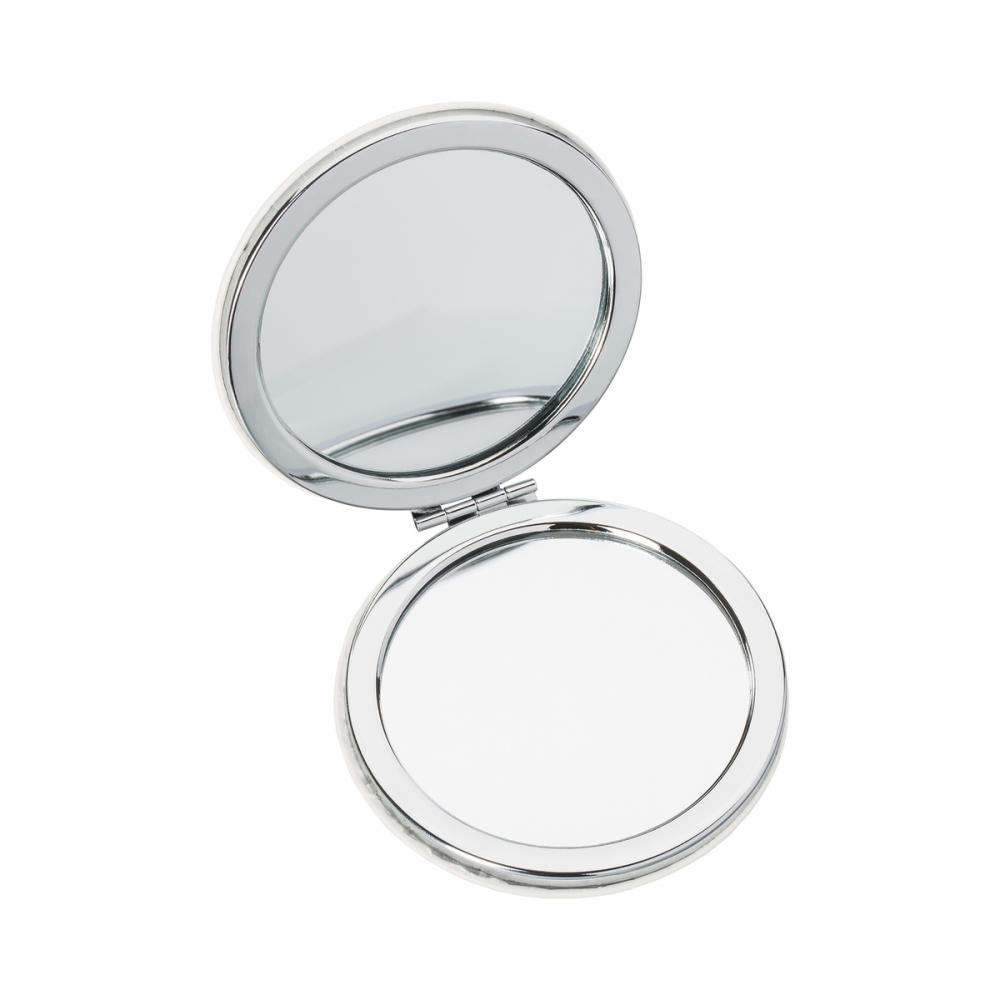 Faltbarer metallischer Spiegel mit Sublimationsfläche (nicht im Produkt integriert, ideal zum Drucken und späteren Aufkleben). Mit zwei Innenspiegeln: 1X und 2X-Vergrößerung.