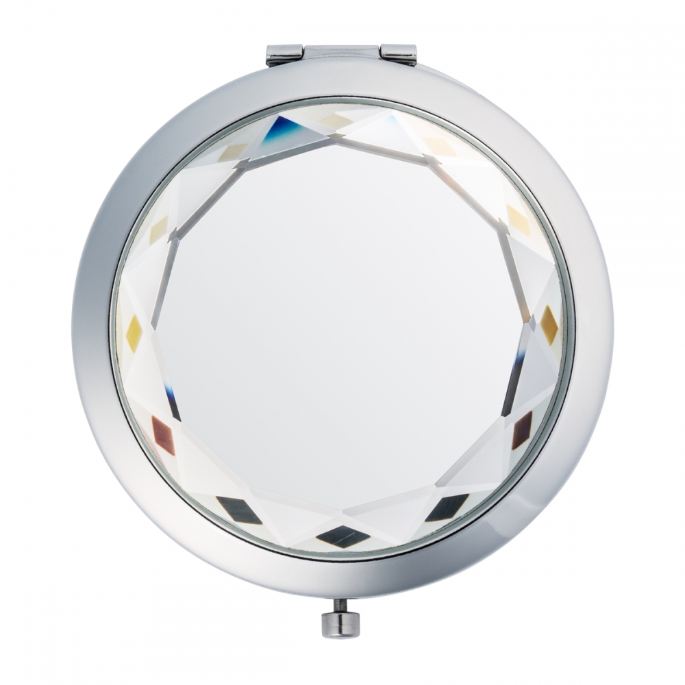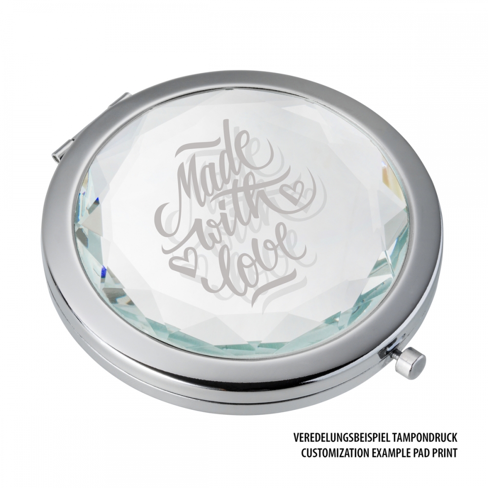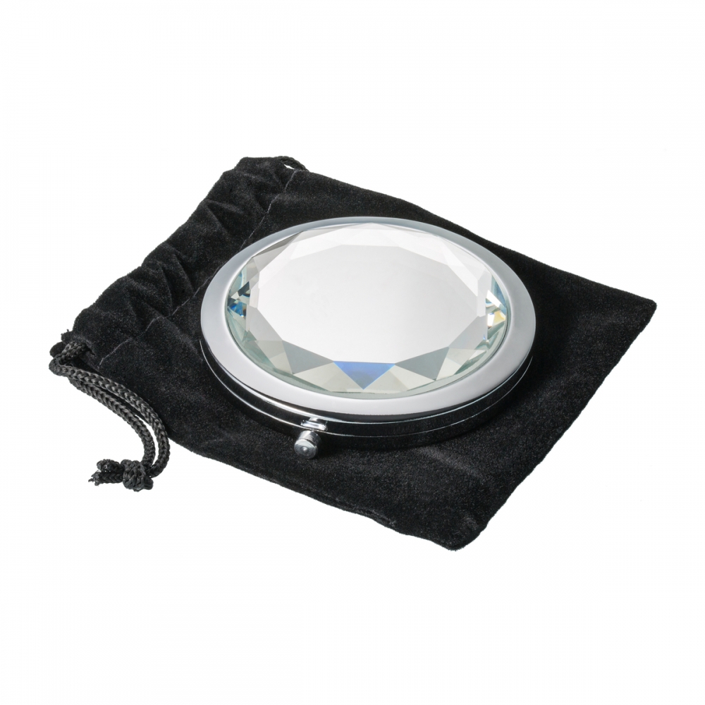 Der luxuriöse Taschenspiegel mit schmuckvoll geschliffenem Glasdeckel ist das passende Accessoire für Damen mit Anspruch an Design und Chic. Die Glasoberfläche kann per Druck mit Ihrem Logo veredelt werden und wirkt durch die Spiegeloptik besonders reizvoll. Der Spiegel wird inklusive eines schützenden Samtsäckchens geliefert.
