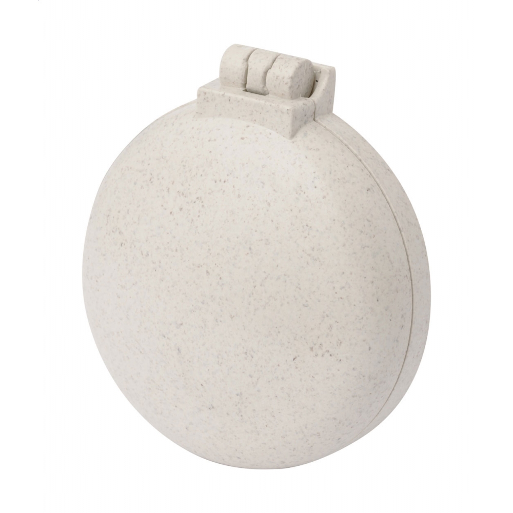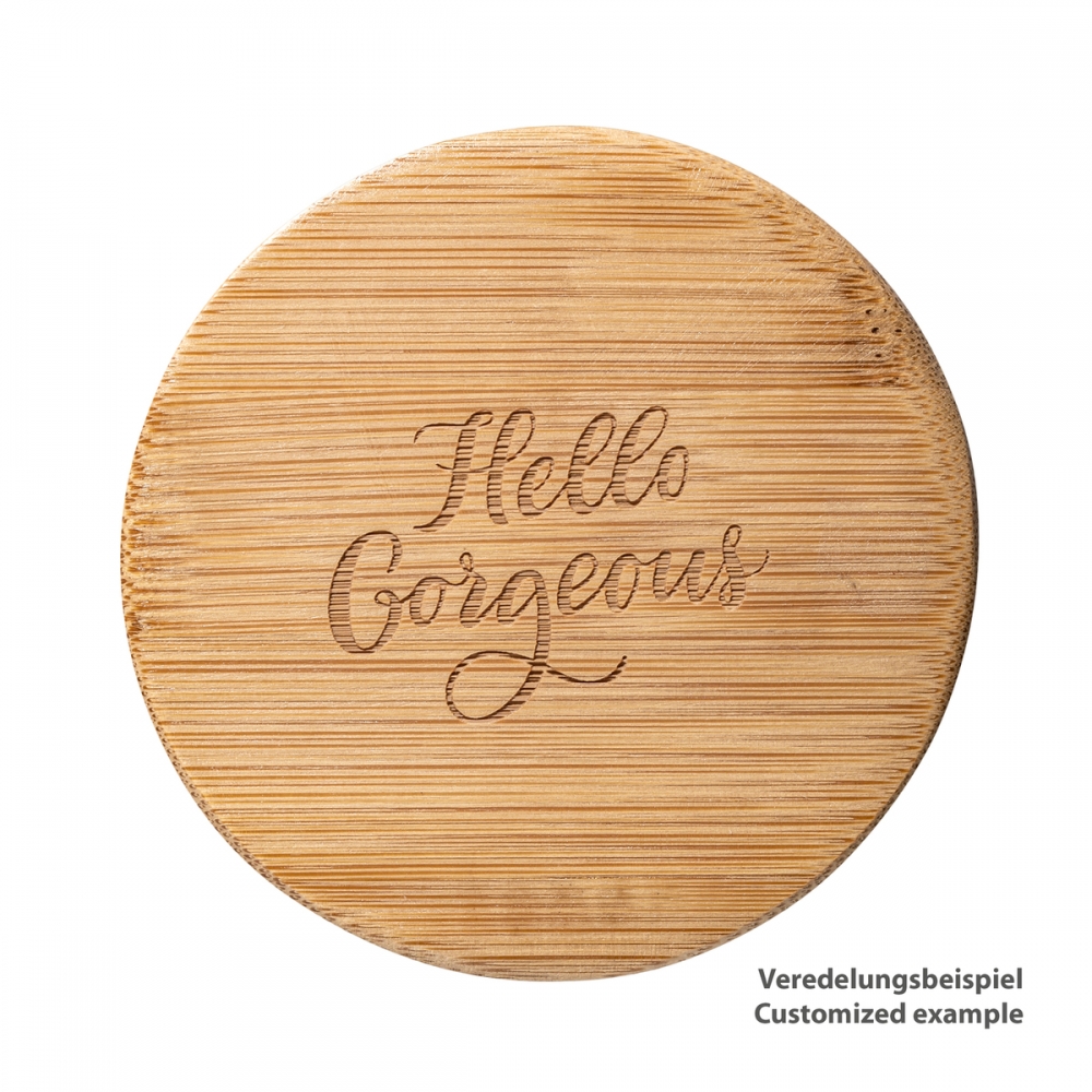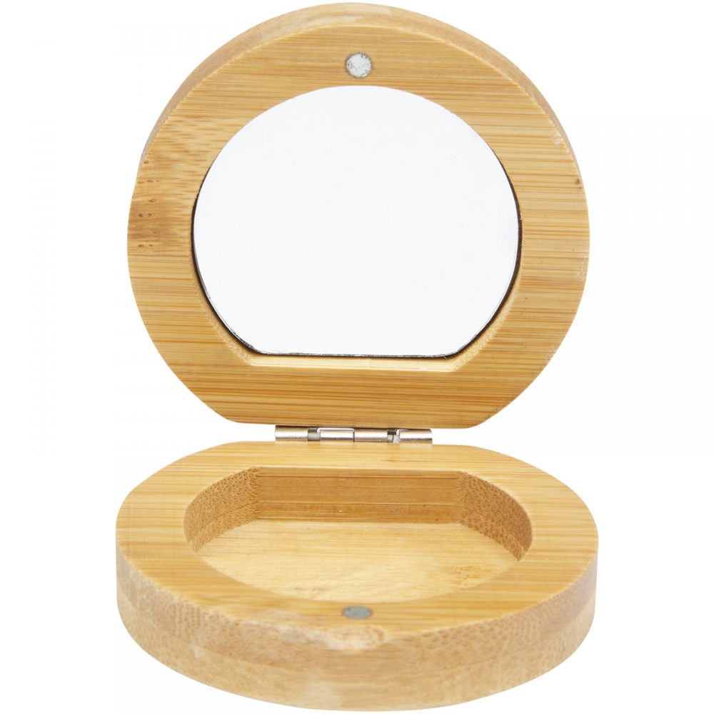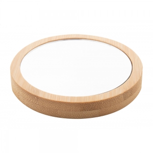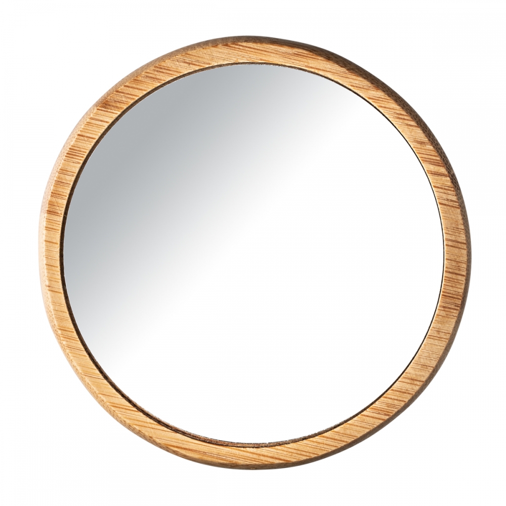 Handlicher, runder Taschenspiegel aus Bambus. Dieser Spiegel darf in keinem Handgepäck oder keiner Handtasche fehlen. Ihre Werbung wird auf die Rückseite graviert.