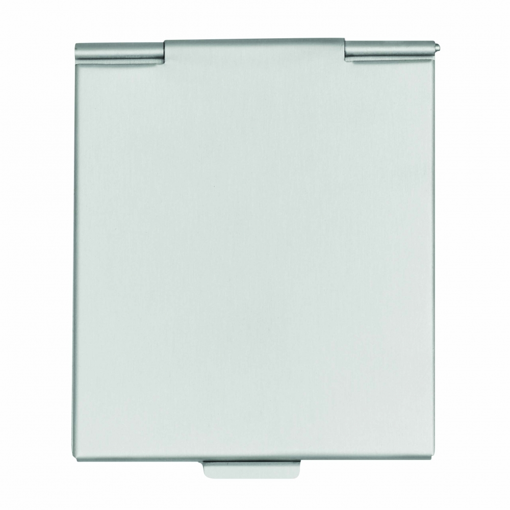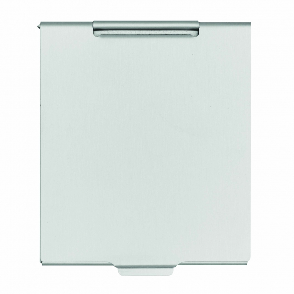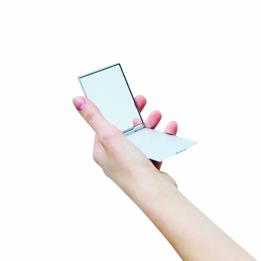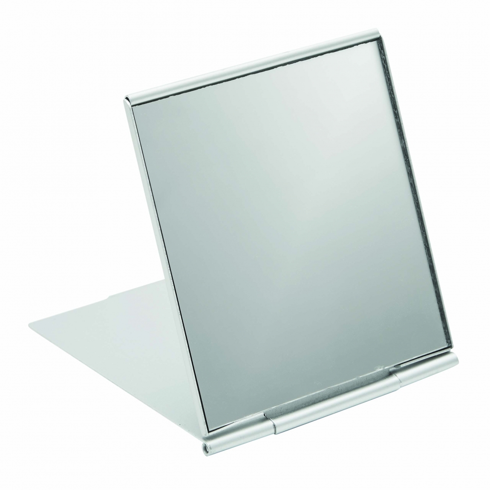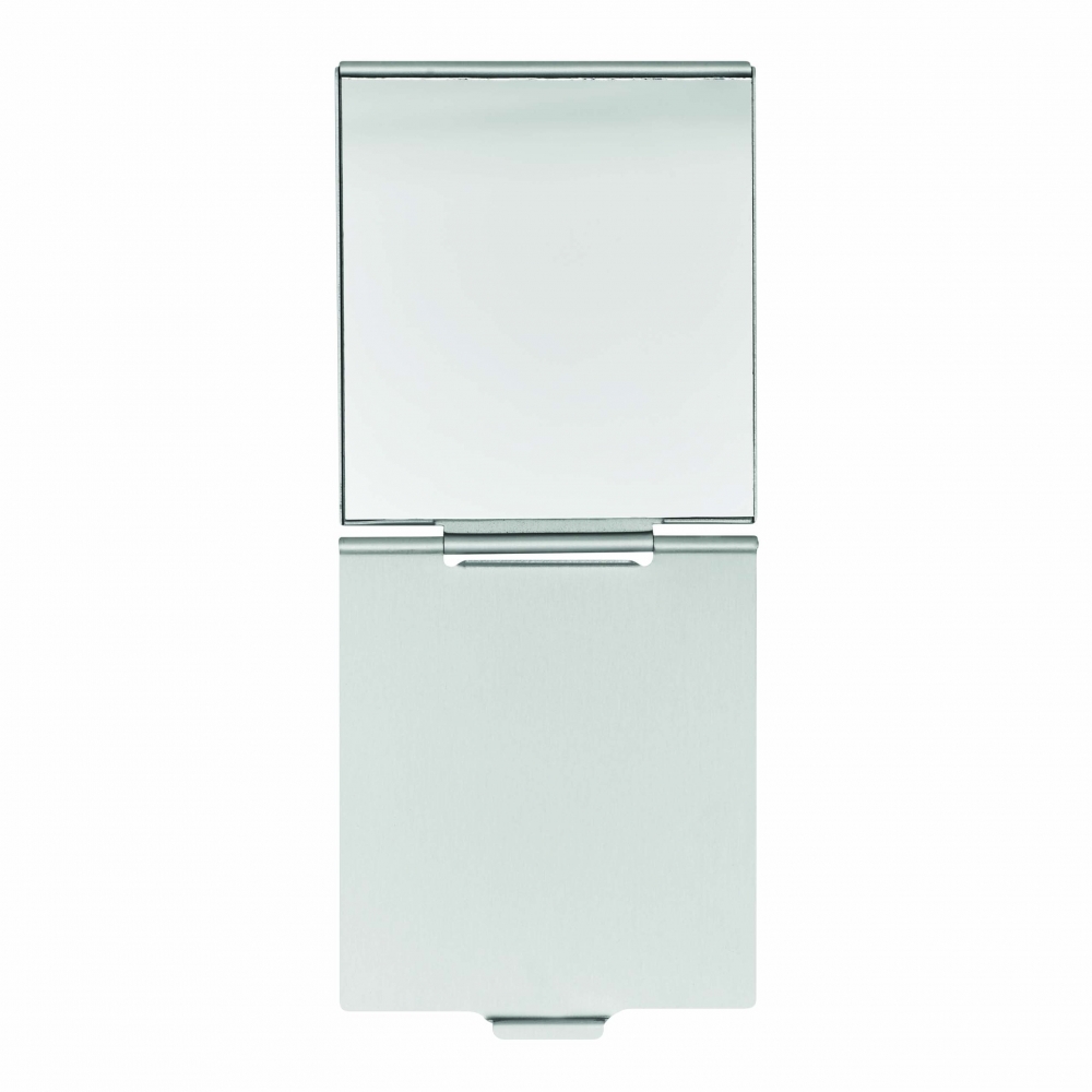 Faltbarer Design-Taschenspiegel - (Import-Artikel) Aluminium matt; Spiegel einseitig. Mögliche Größen: 150x00x3 mm 115x76x3 mm 80x50x3 mm Werbeanbringung: Druck, Gravur oder Prägung Verpackung: Im Polybeutel - alternativ im bedruckten Umkarton - oder im blanko Umkarton.