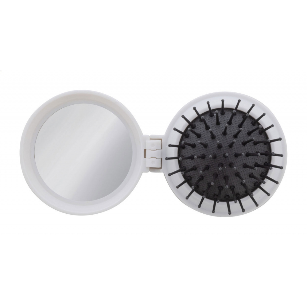Praktische Klappbürste mit rundem Taschenspiegel. Teils Spiegel und teils Bürste, wenn es geöffnet ist, wird es im geschlossenen Zustand zu einem kompakten und leichten Gegenstand.