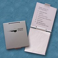 Praktischer Taschenspiegel mit Werbeaufdruck. Dieser praktische aufklappbare Taschenspiegel sollte in keiner Damenhandtasche fehlen. Bei einer Größe von 60x70mm bietet er auf 3 Flächen viel Platz für ihre individuelle Werbung.