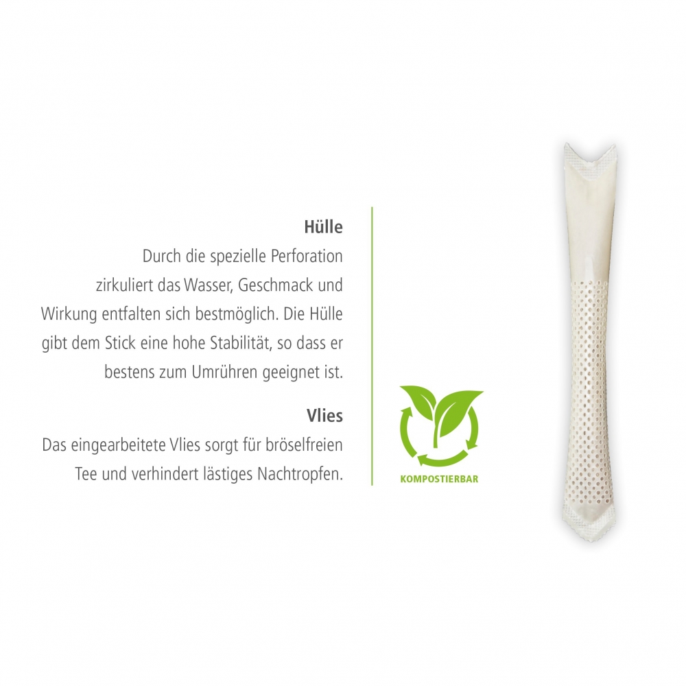 Artikel-Nr: SAN40-400-003-01mit für 1 TeaStick (Individuelles Design). Der, für Material: Karton mit seidenmattem Glanz aus kontrolliert ökologischer und nachhaltig bewirtschafteter Forstwirtschaft. Druck auf Vorder- und Rückseite: 4c (CMYK). Inklusive 1 Bio TeaStick (konfektionierte Lieferung): • hergestellt aus Pflanzenfasern und Stärke • ohne Gentechnik • vegan • nicht erdölbasiert • zu 100% aus nachwachsenden und natürlichen Rohstoffen • Stick biologisch abbaubar (kompostierbar) • Aromaverpackung aus Papier Der innovative TeaStick ist purer Genuss und dabei noch sehr praktisch. Stick direkt in die Tasse mit heißem Wa ...