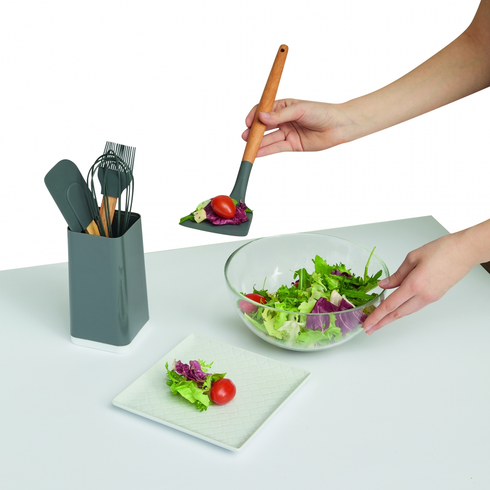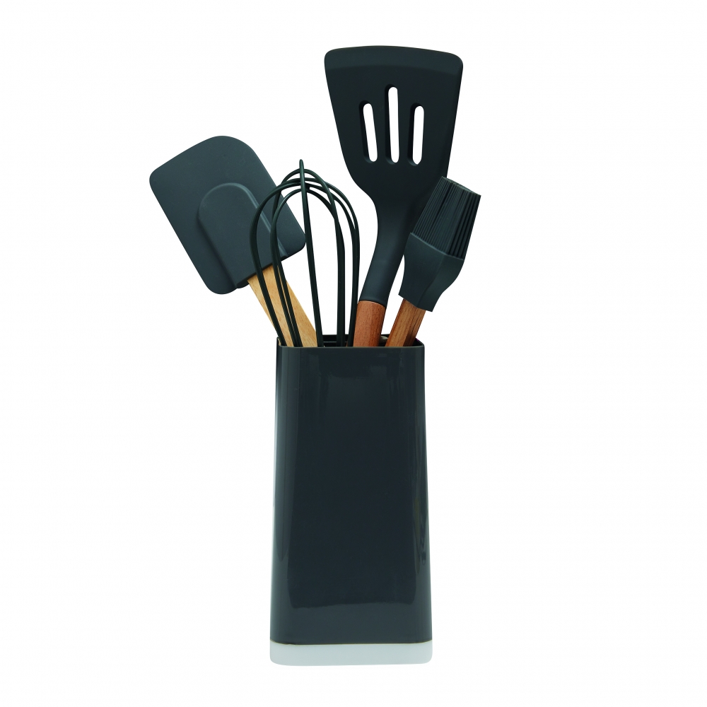 Artikel-Nr: INP56-03070345-teiliges Küchenset COOKING TOOLS: Silikon-Küchenhelfer mit Holzgriffen (Pfannenwender, Teigschaber, Pinsel und Schneebesen) im Halter