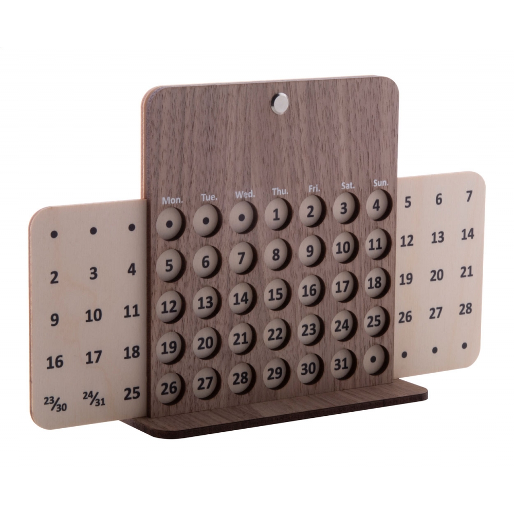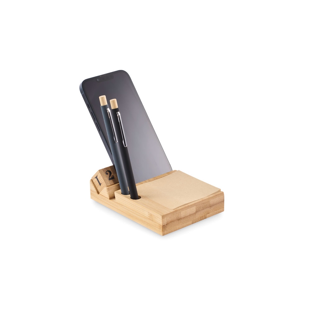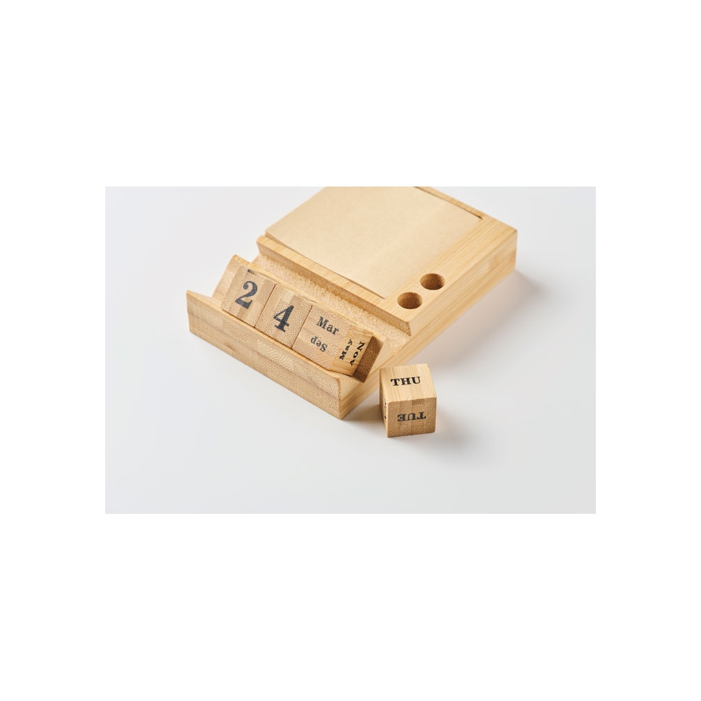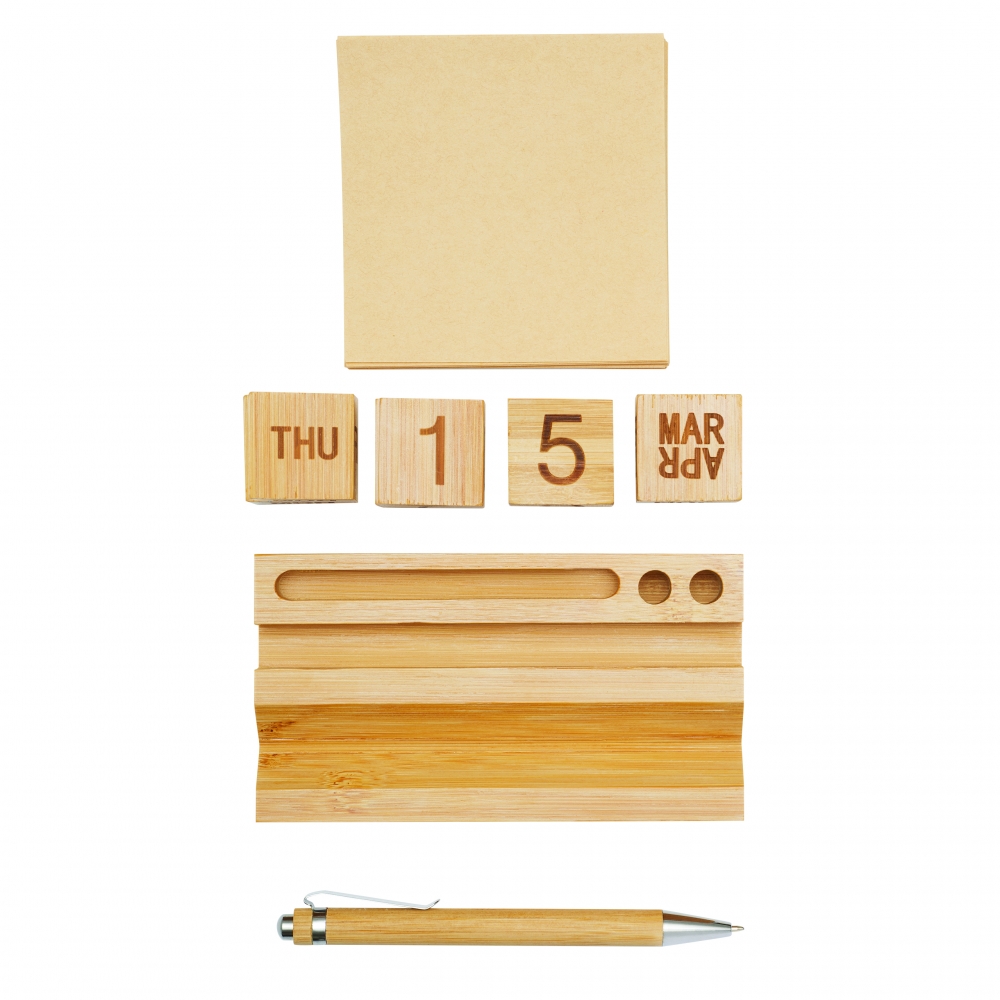 Artikel-Nr: PRM330015_20Unveränderlicher Tischkalender aus Bambus, gebildet aus einem Ständer und vier gravierten Blöcken. Präsentation in einer Ökodesign-Box.