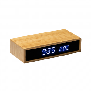 Digitale Schreibtischuhr aus Bambus mit LED Display, Wireless Charging, Weckfunktion und Temperaturanzeige. Ihre Werbung wird auf die Oberseite gelasert.