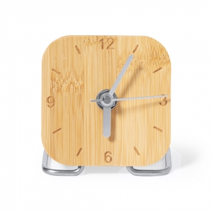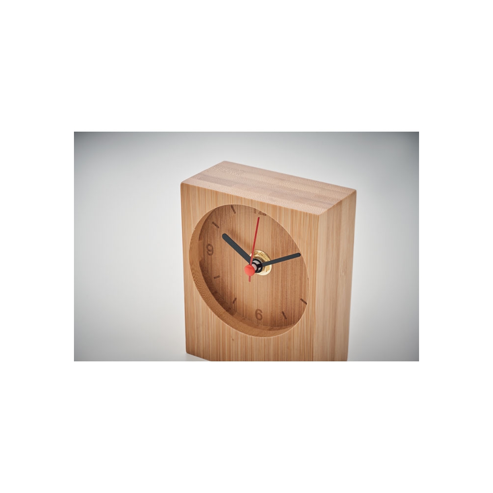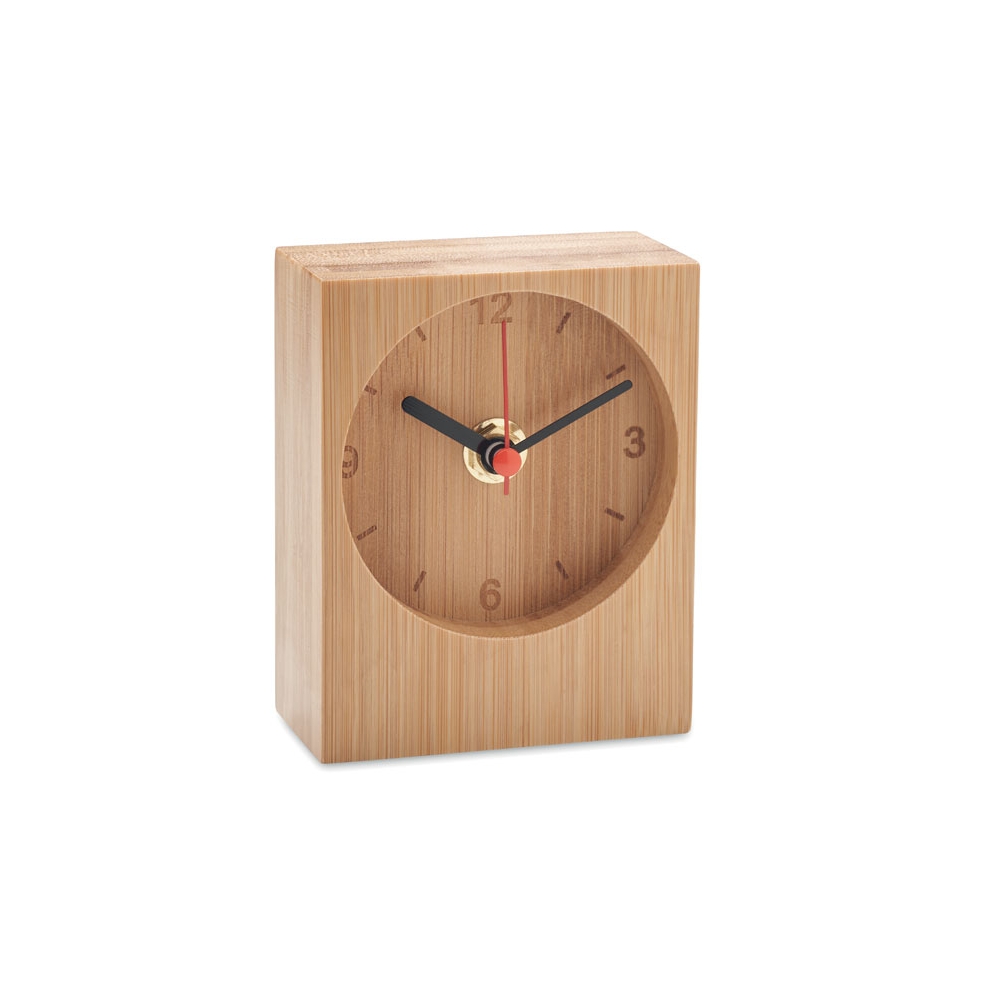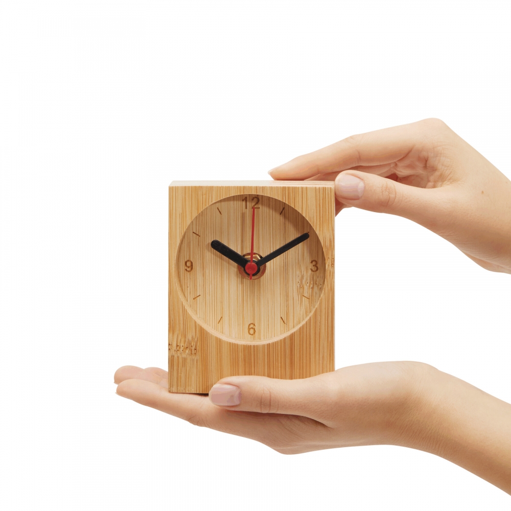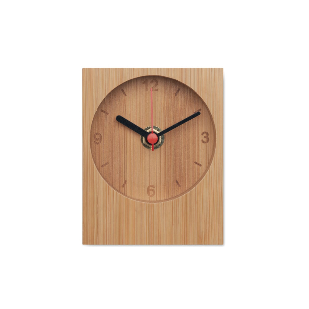 Tischuhr aus HDF-Holz mit Vollfarbdruck. Exkl. Batterie (1x AA). Mindestmenge: 50 Stk.