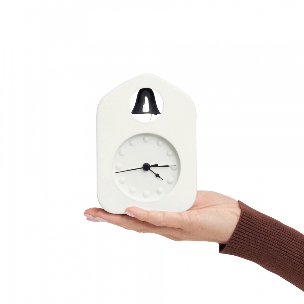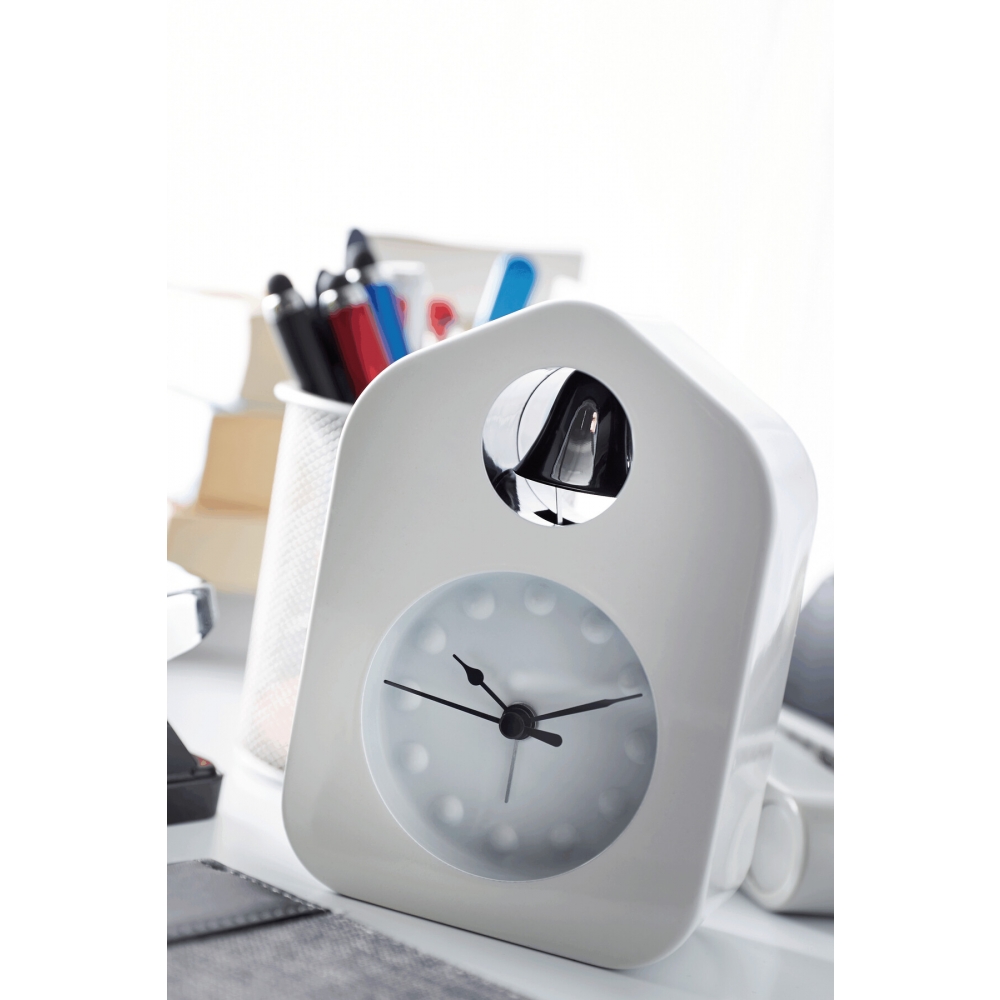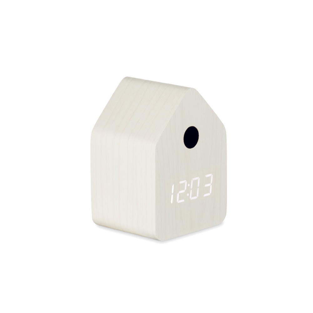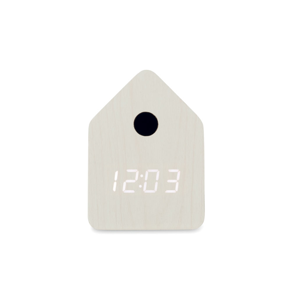 Kleine Tischuhr aus MDF mit Weckfunktion und Temperaturanzeige. Der Kuckucksruf ertönt zur vollen Stunde sowie als Weckruf. Automatische Nachtabschaltung des Stundentons zwischen 22:00 und 06:00 Uhr. Snooze-Funktion. Weiße LED-Anzeige.