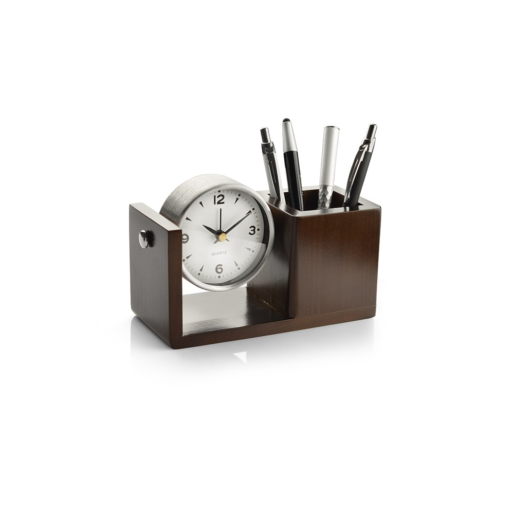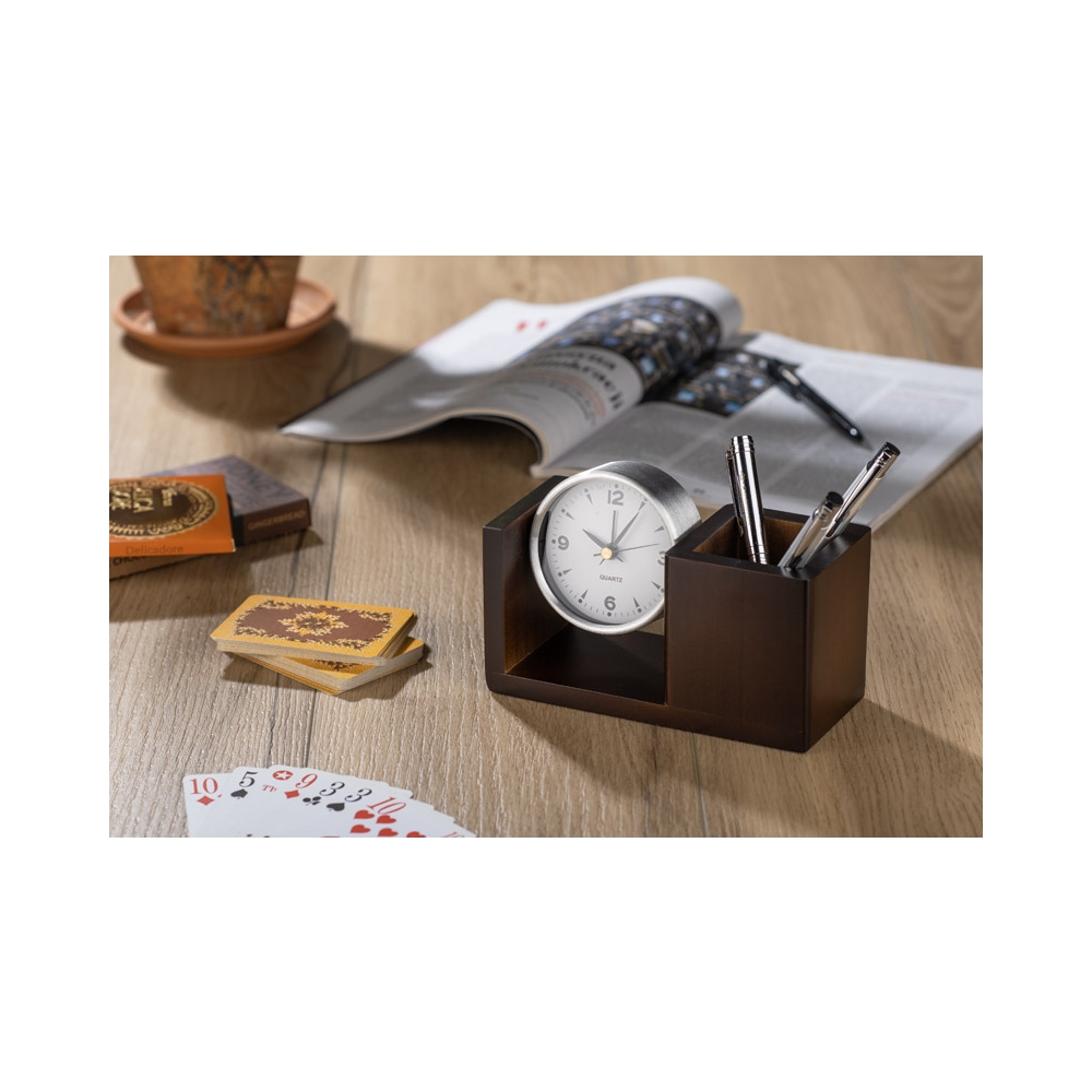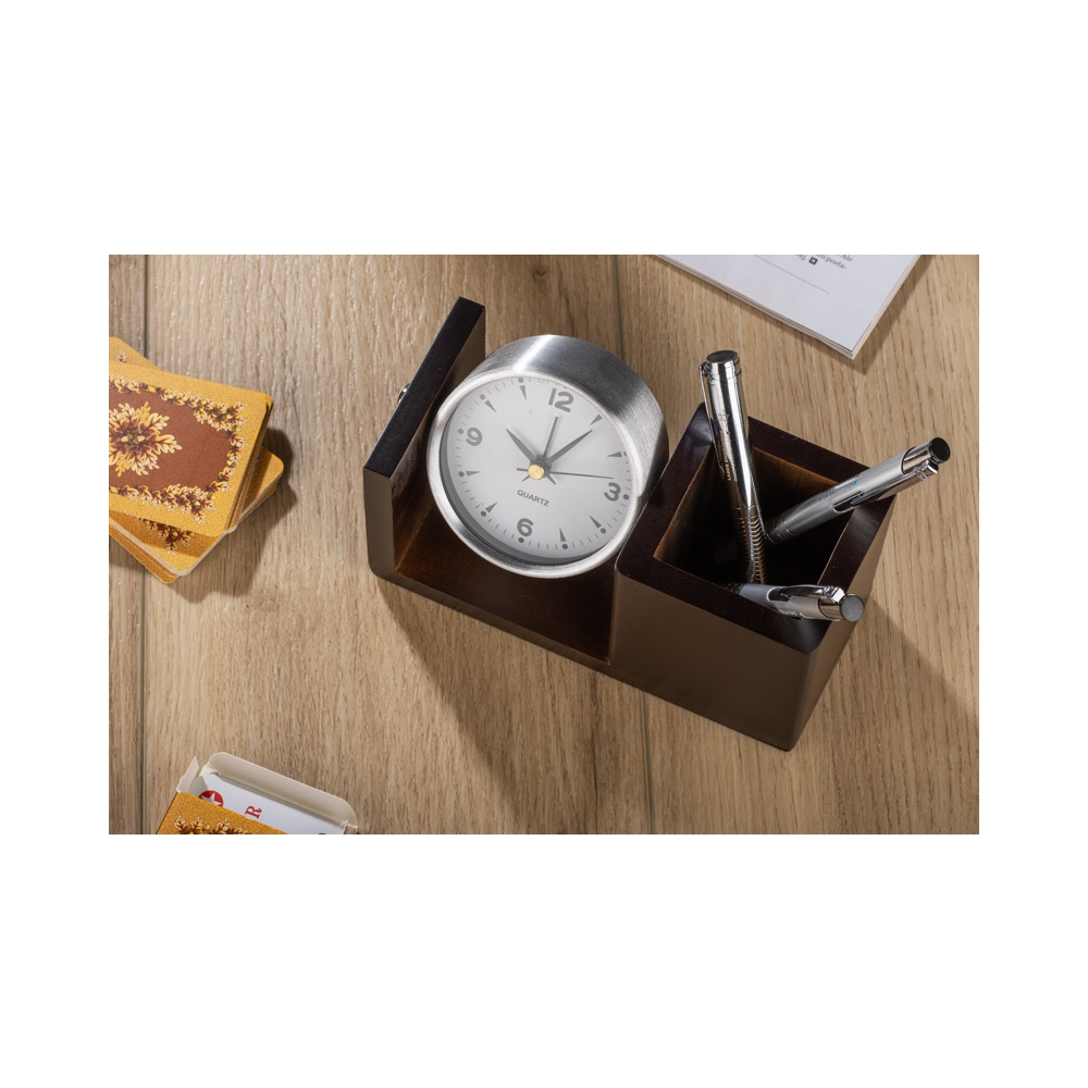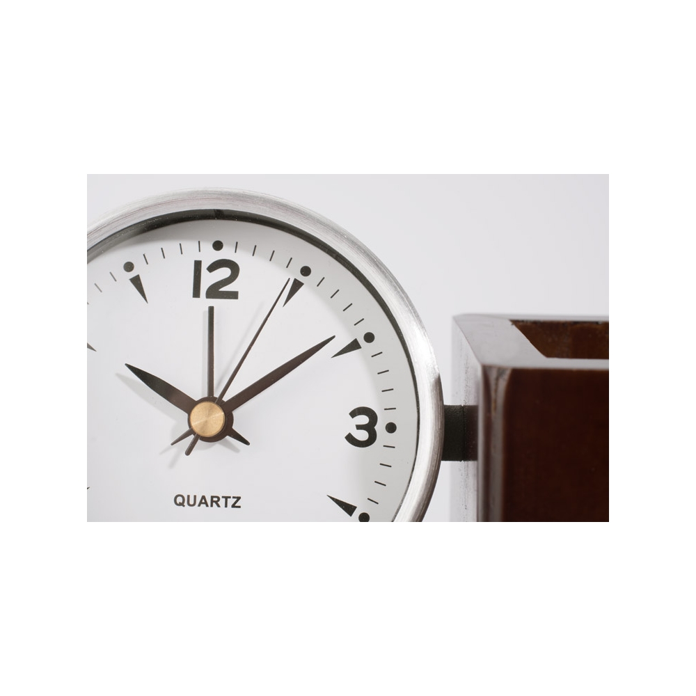 Die Metalluhr mit großem weißem Zifferblatt ist auf einem eleganten Holzständer aus massives holz befestigt. Dieses Set ist mit einem Behälter für Büroartikel ausgestattet. Die Uhr lässt sich nach oben und unten drehen. Diese Uhr ist eine wertvolle Bereicherung für jeden Schreibtisch aufgrund der Kombination aus Ästhetik und Funktionalität. Die Anbringung von Beschriftungen ist auf dem Holzteil für Büroartikel möglich.
