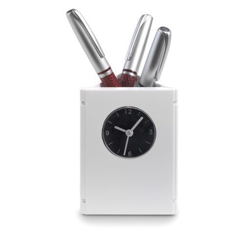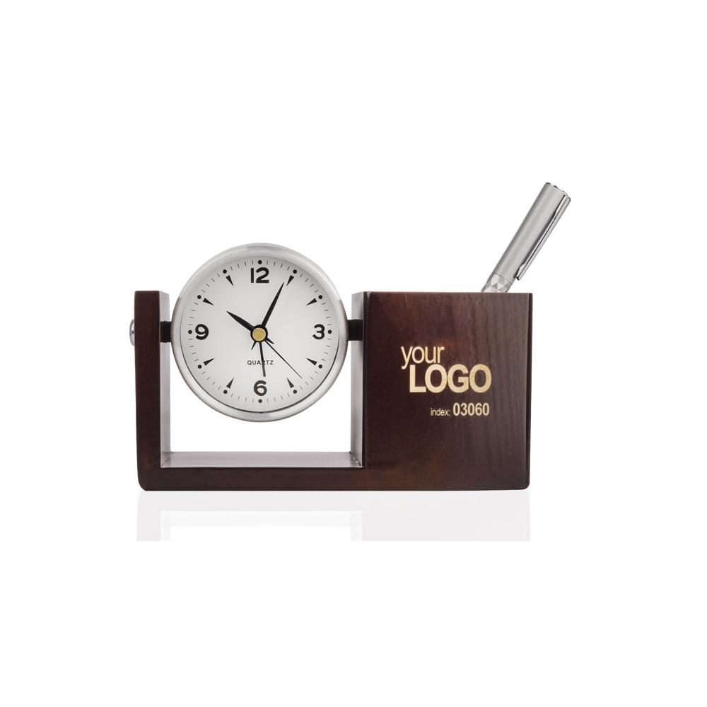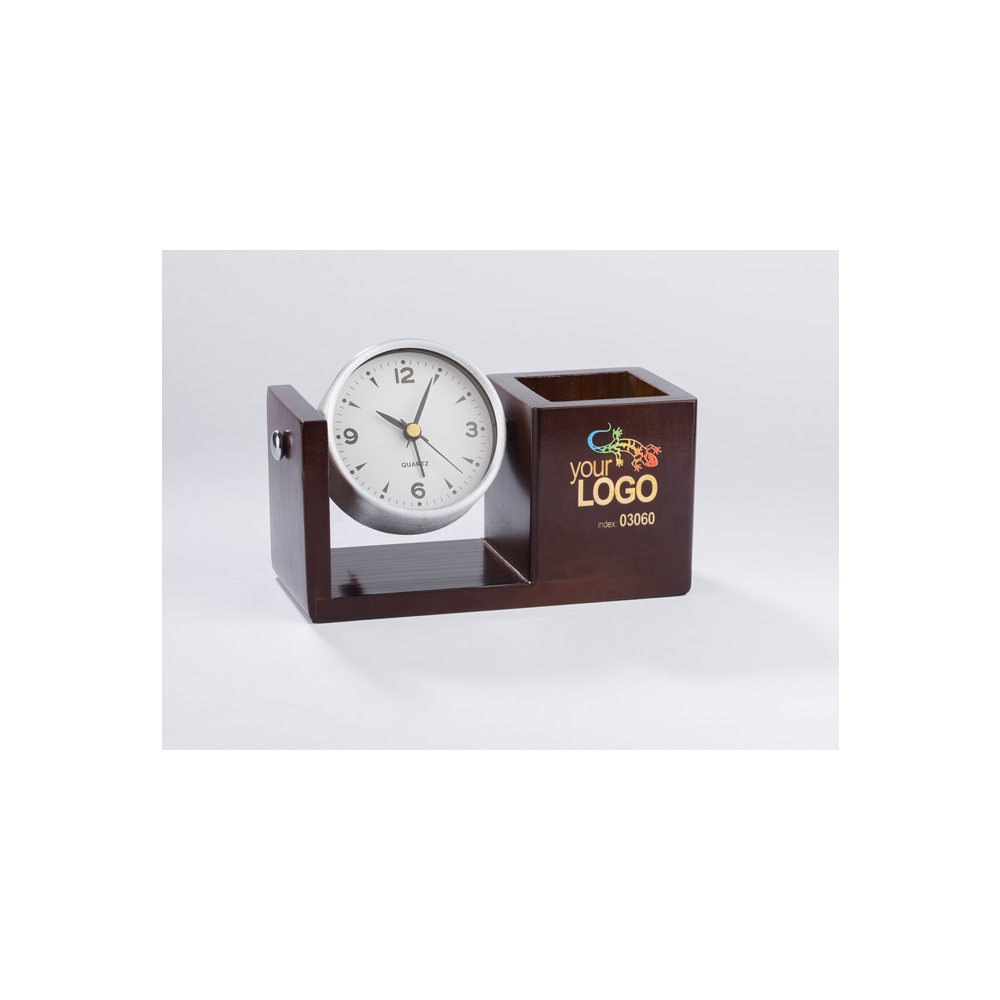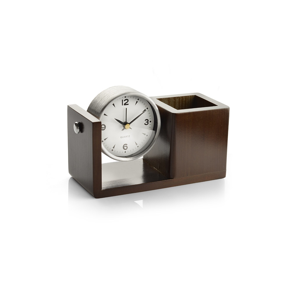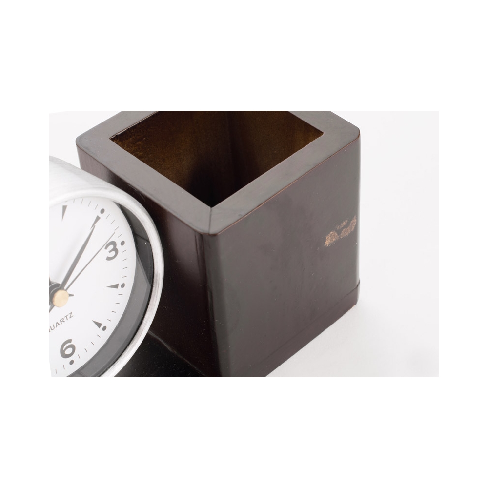 Die Metalluhr mit großem weißem Zifferblatt ist auf einem eleganten Holzständer aus massives holz befestigt. Dieses Set ist mit einem Behälter für Büroartikel ausgestattet. Die Uhr lässt sich nach oben und unten drehen. Diese Uhr ist eine wertvolle Bereicherung für jeden Schreibtisch aufgrund der Kombination aus Ästhetik und Funktionalität. Die Anbringung von Beschriftungen ist auf dem Holzteil für Büroartikel möglich.
