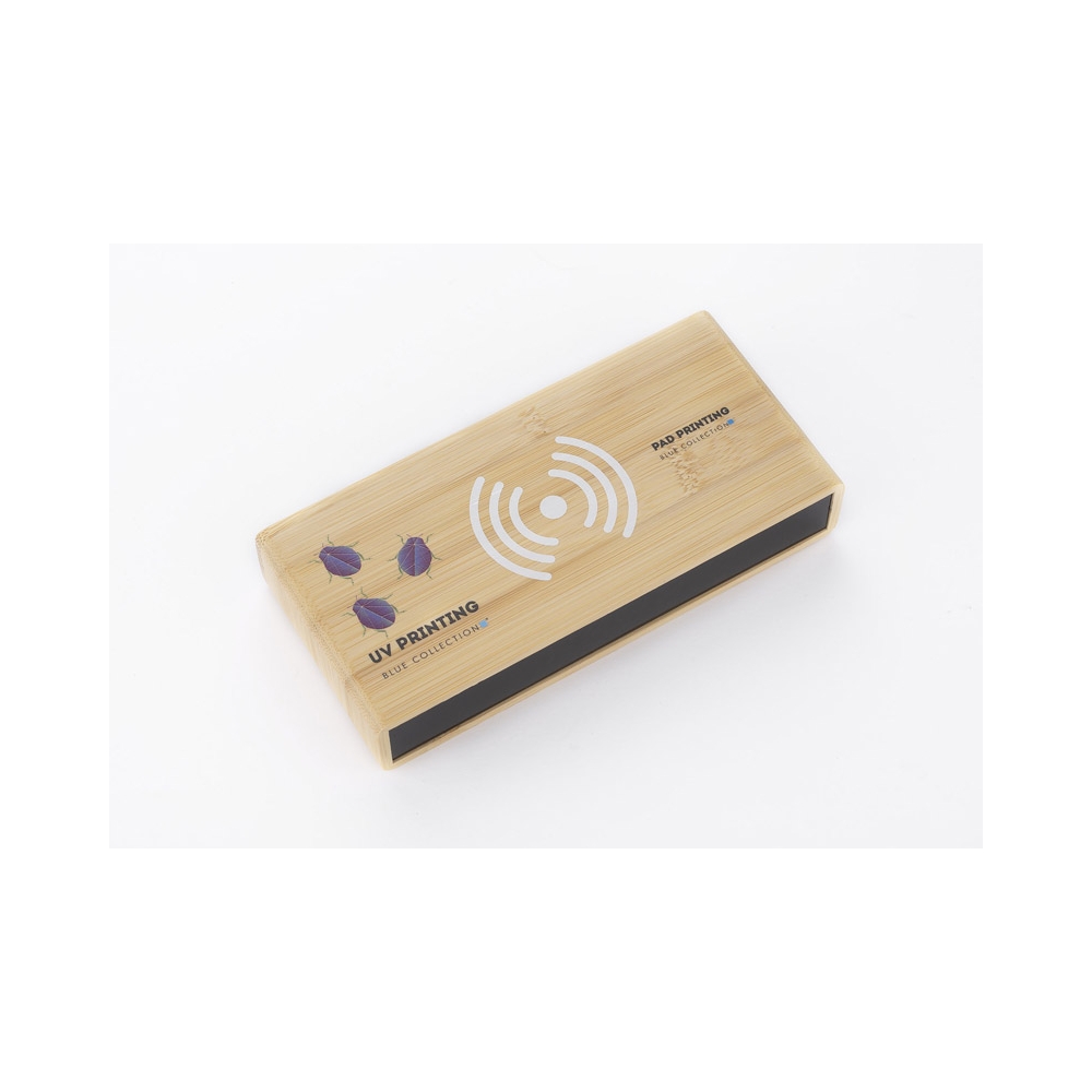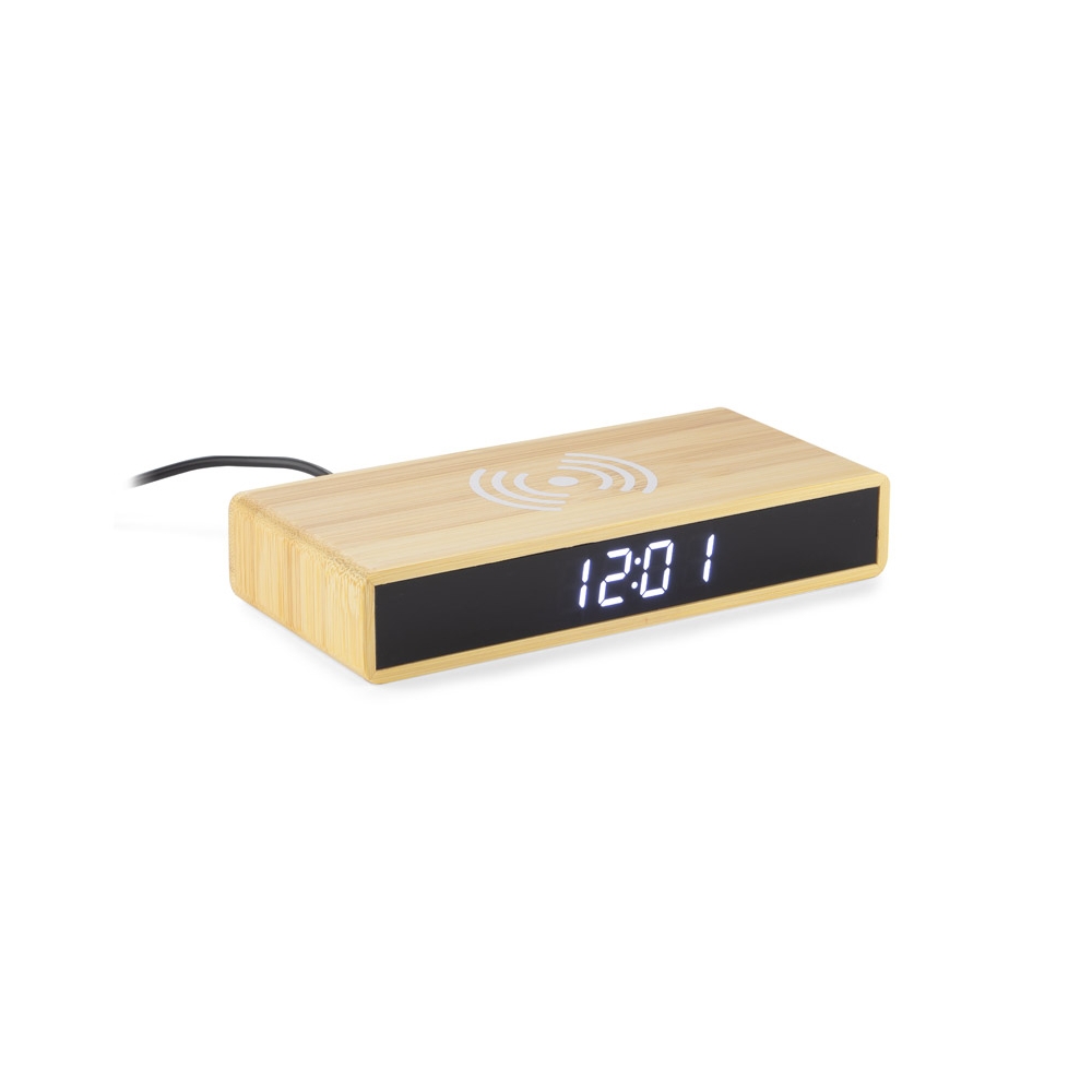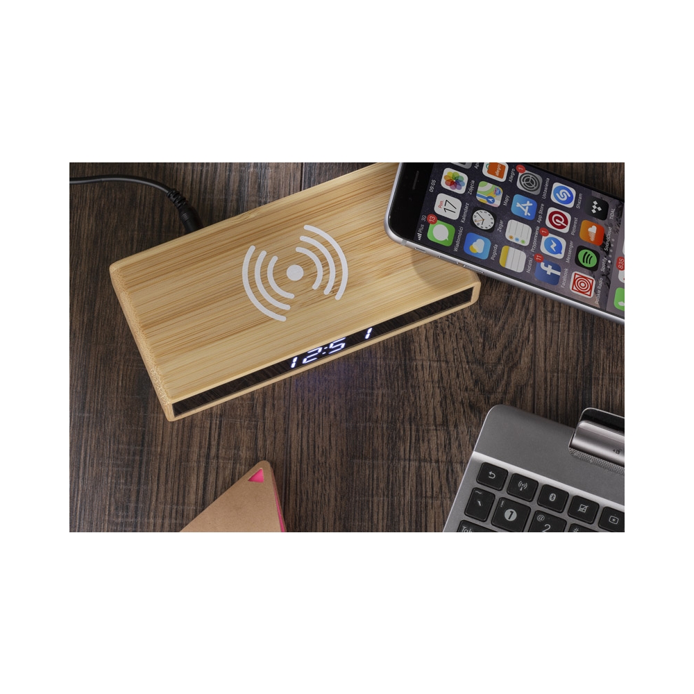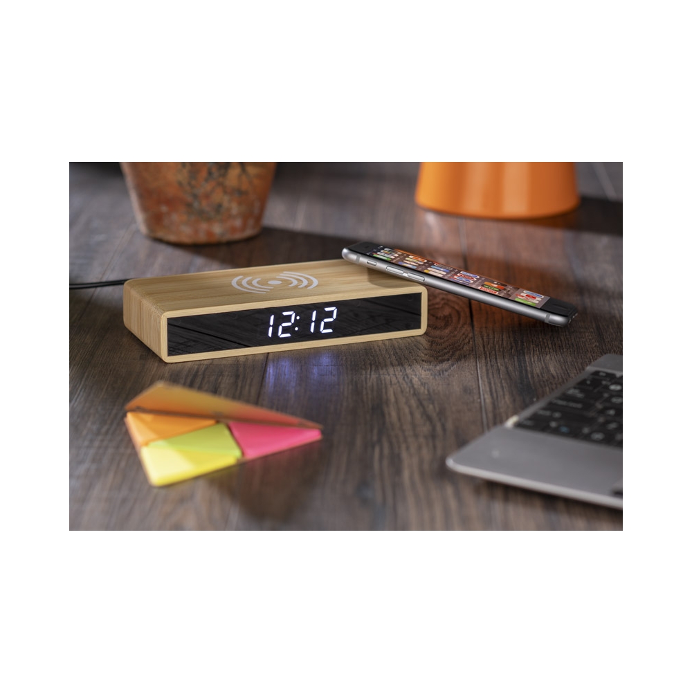 Tischuhr mit kabellosem 5-W-Ladegerät aus Bambus. Funktionen: Uhrzeit, Datum, Alarm und Temperatur. Typ-C-Anschluss. Kabel im Lieferumfang enthalten. Präsentation in einer Ökodesign-Box.