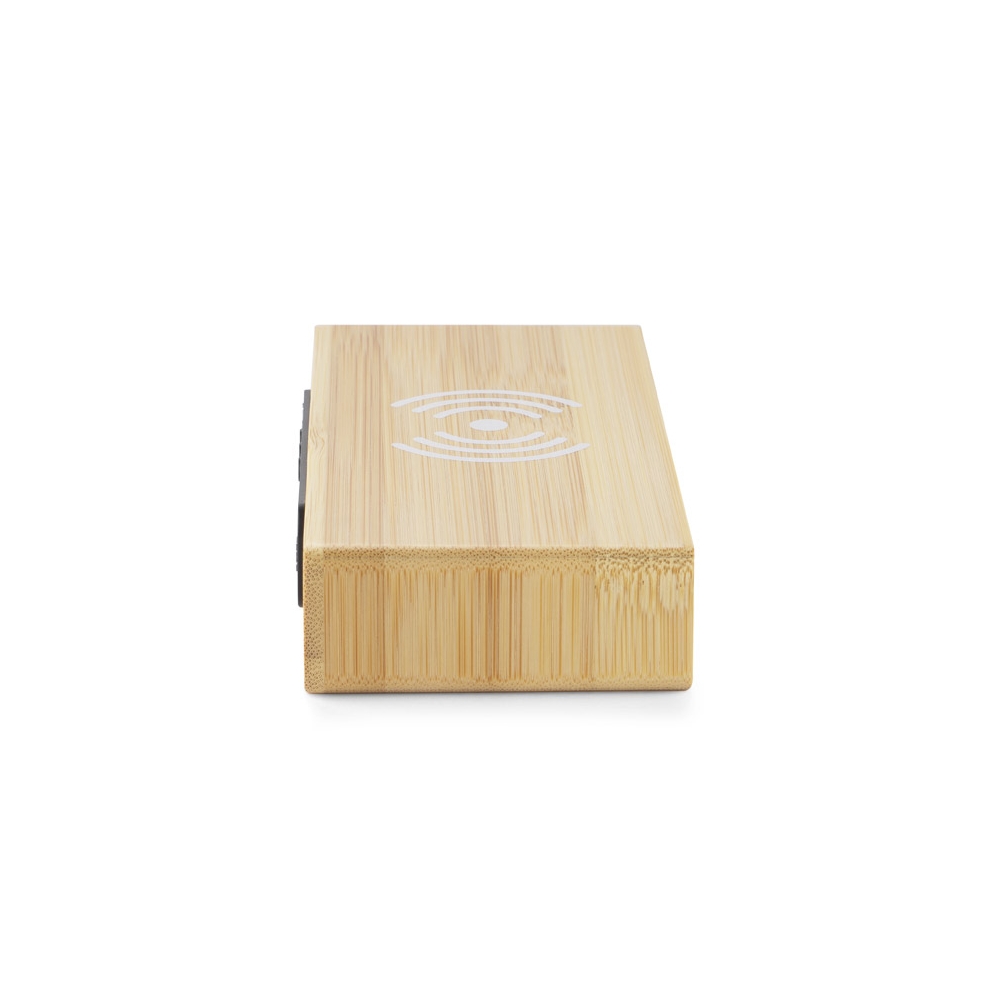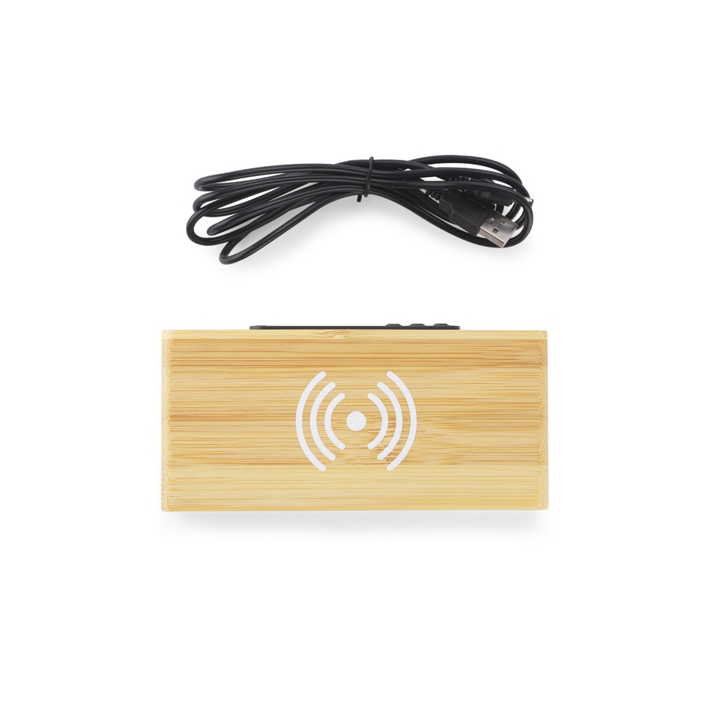 Multifunktionsuhr mit hintergrundbeleuchtetem Touchscreen und integriertem 15-W-Wireless-Ladegerät, mit USB-Ausgang (5 V DC 2 A). Zusammenklappbar und aus Bambus gefertigt, mit Datums- / Uhrzeit- und Alarmfunktionen. Lampe mit 16 LEDs und 3 Leuchtpositionen, mit einstellbarer Lichtintensität. Ladekabel vom Typ C im Lieferumfang enthalten und kompatibel mit Geräten, die mit der kabellosen Qi-Ladetechnologie ausgestattet sind. Präsentiert in einer individuellen Kraftpapier-Designbox, mit Bedienungsanleitung in Englisch und Spanisch. Hergestellt nach RoHS-Standards und unter Einhaltung der folgenden Sicherheitsanforderungen: Überhitzungsschutzsystem. Überlad ...
