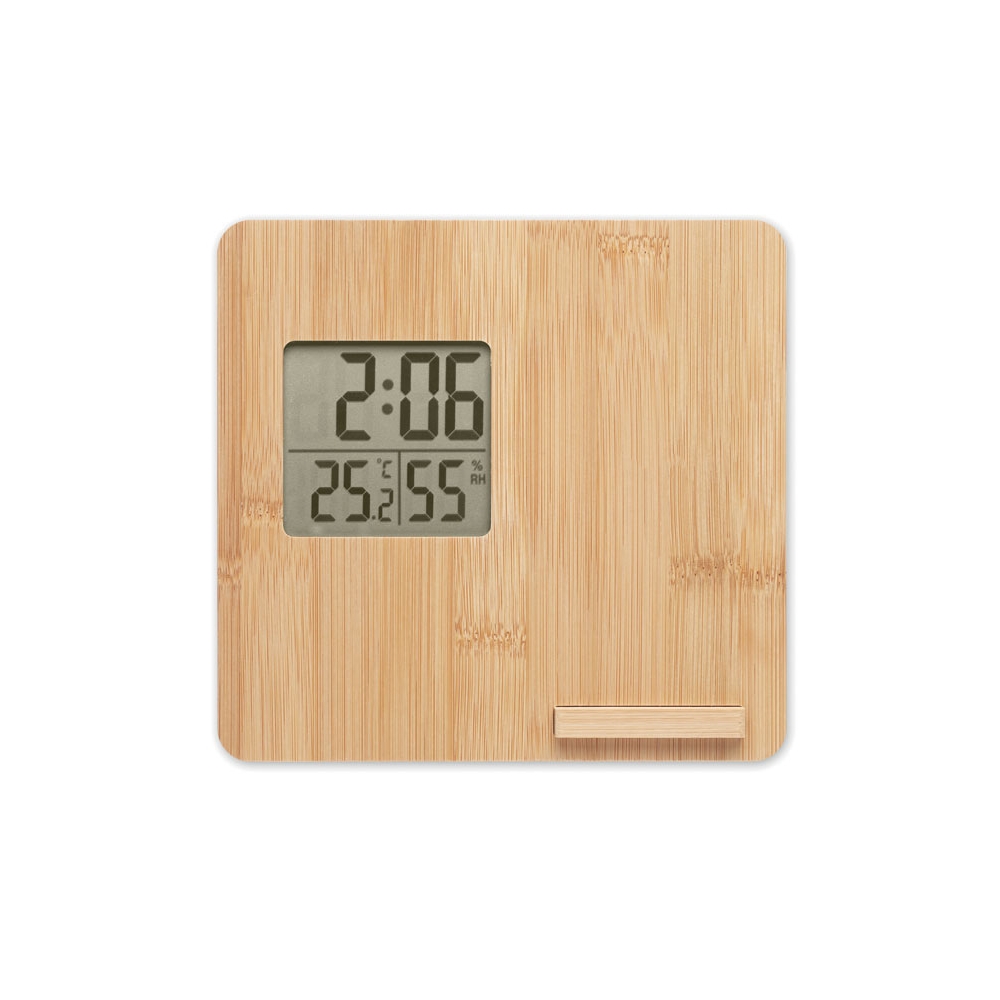 Tischuhr mit Bambusummantelung, schwarzem Display und blauer LED-Anzeige, die Zeit, Datum und Temperatur im Wechsel anzeigt. Ihre Werbung wird auf die Ummantelung graviert.