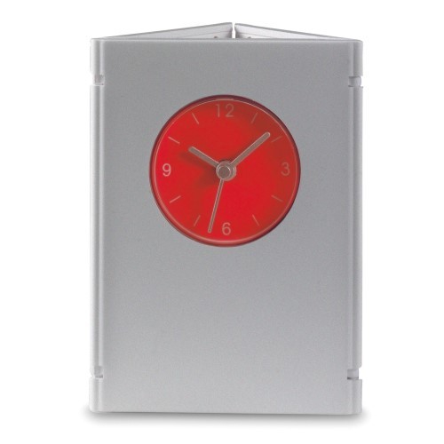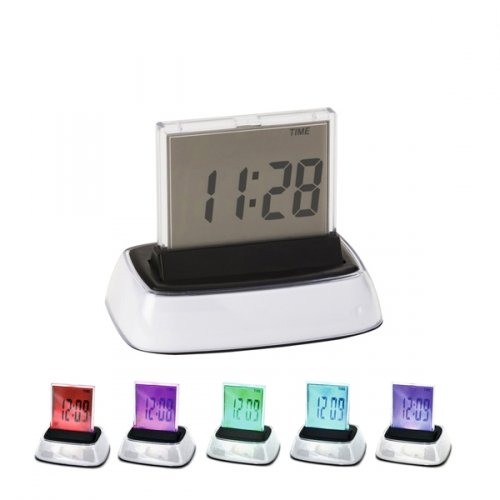 Tischuhr aus Kunststoff mit Visitenkarten-Halter und mit einem Magnet für Büroklammer. Funktionen: 12/24 Regime, Wecker, Kalender, Thermometer, Zeitzähler. Inkl. Knopfbatterien (2x).