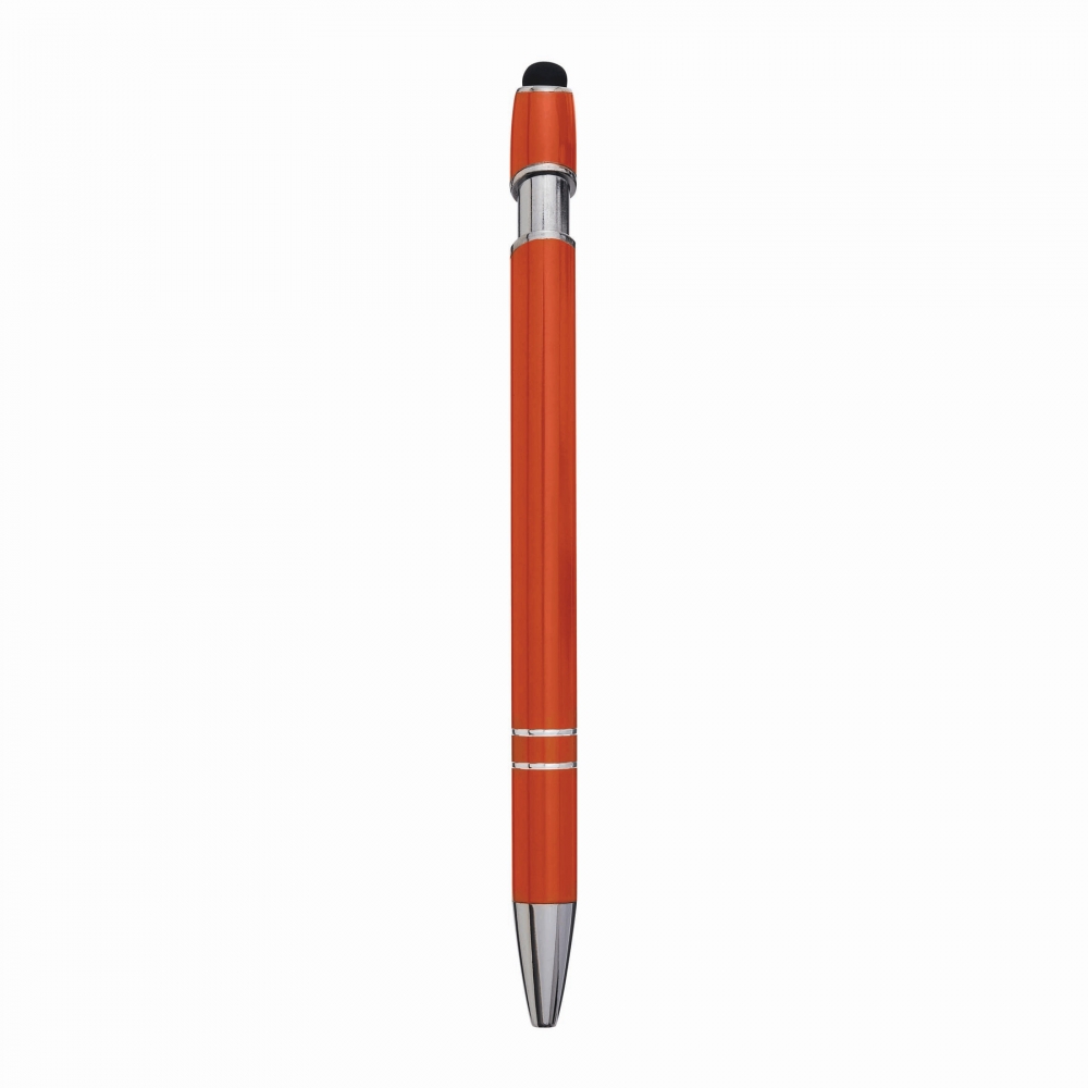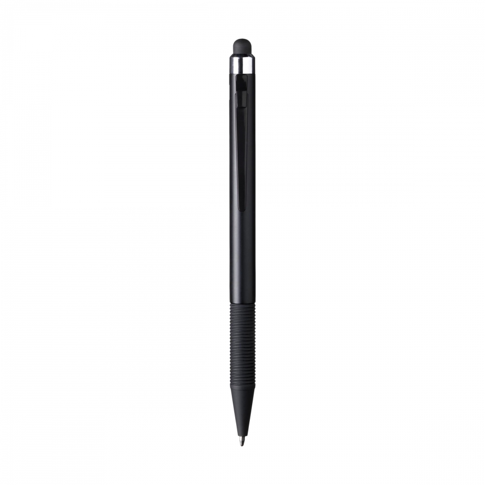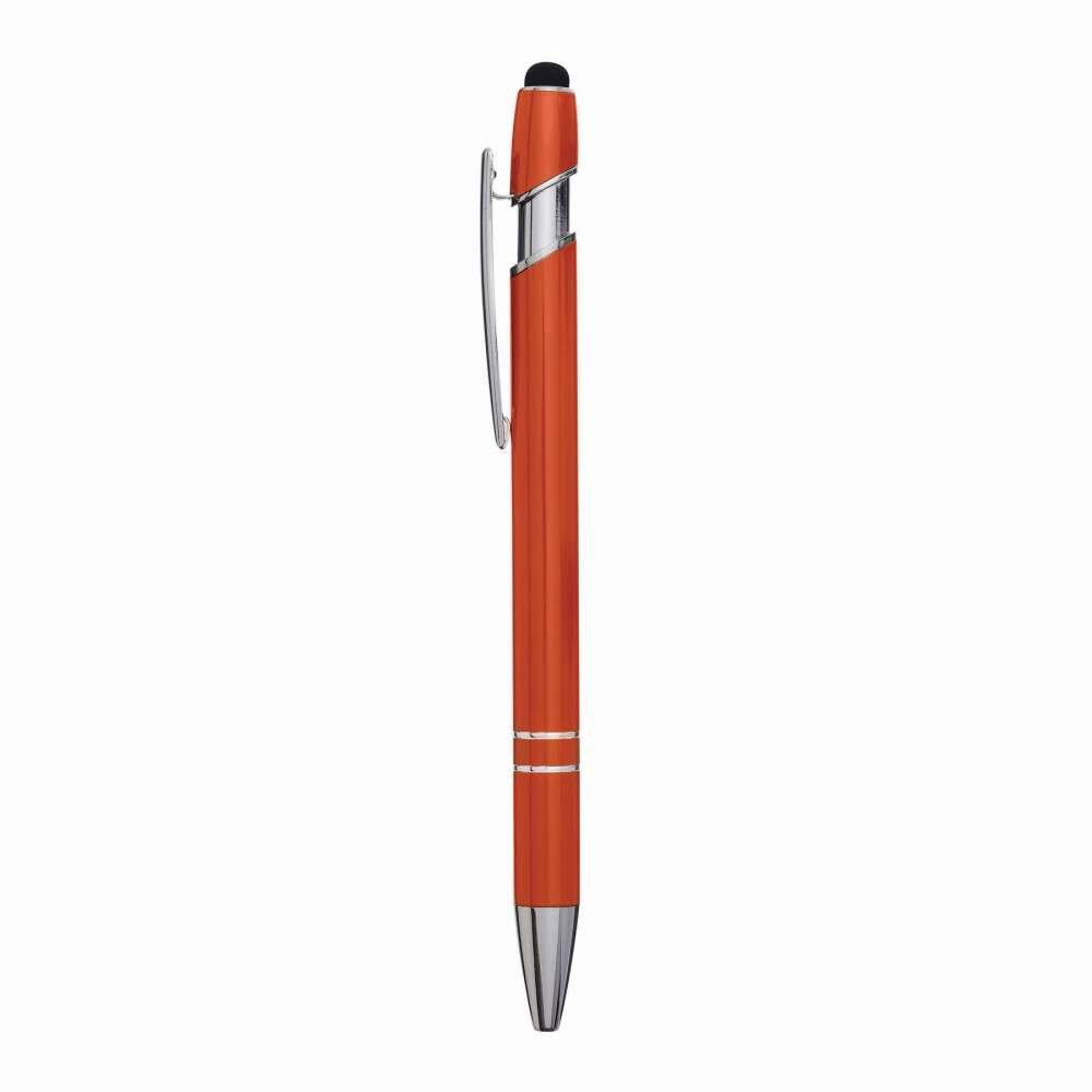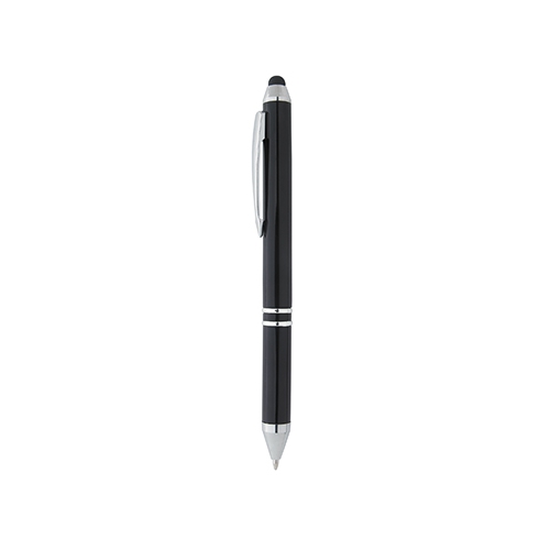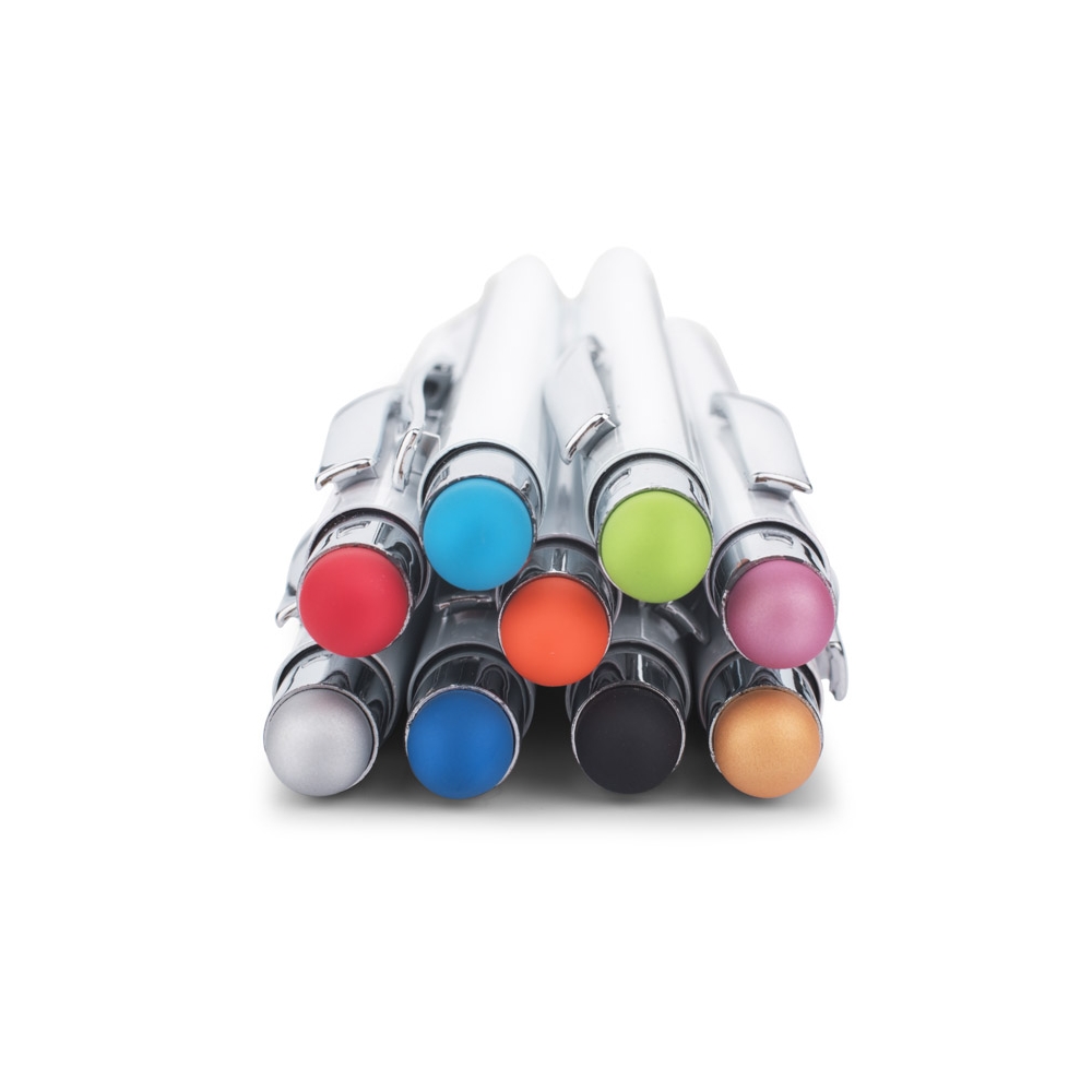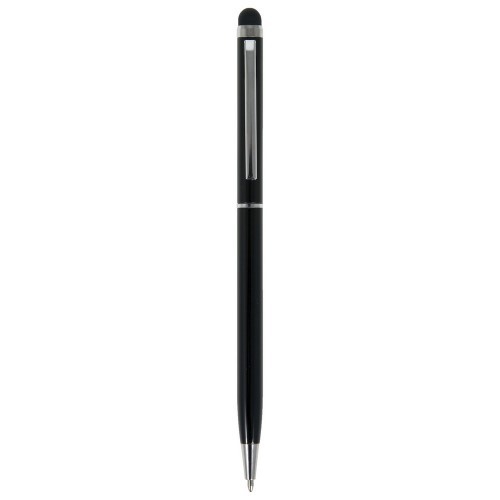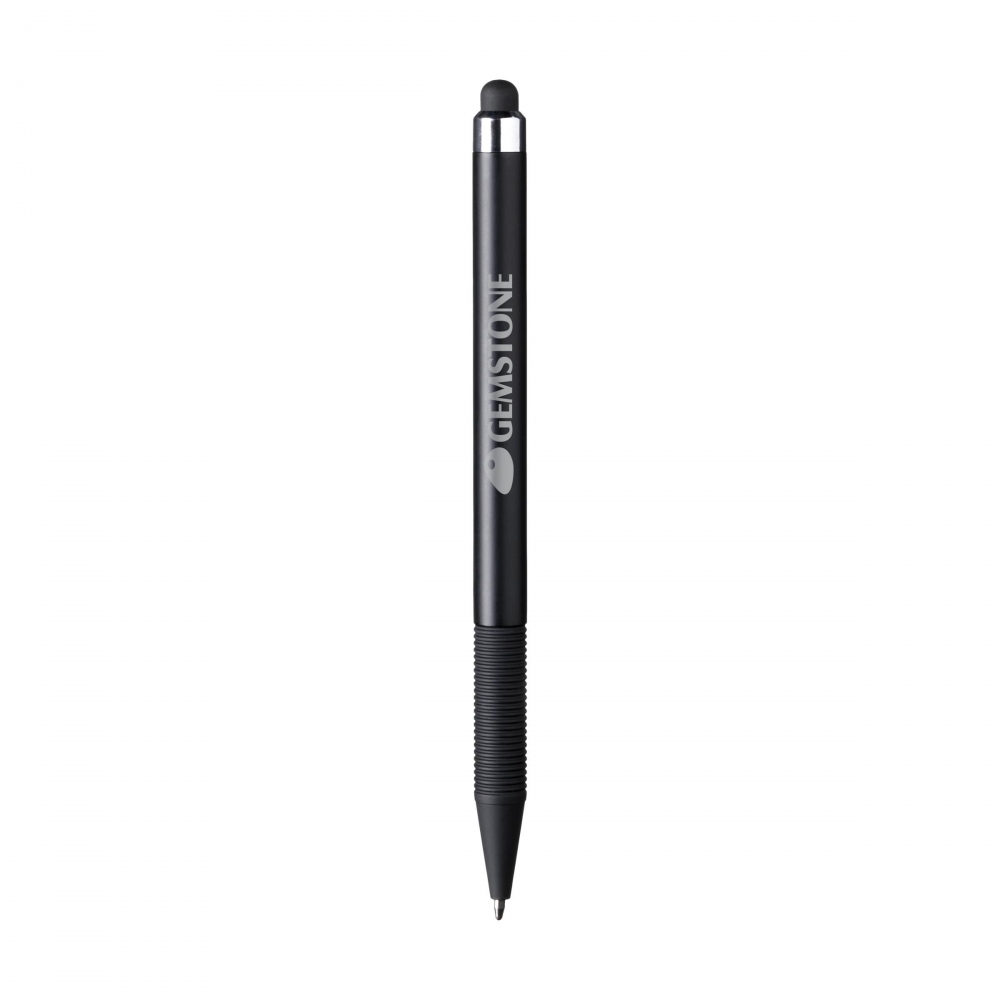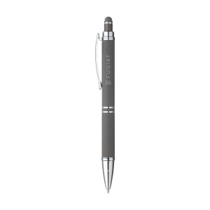 Multifunktions-Kugelschreiber mit schlankem Profil und Stylus am oberen Ende für kapazitive Touchscreen-Geräte. Gehäuse mit Glanzoberfläche und Metallverzierung.