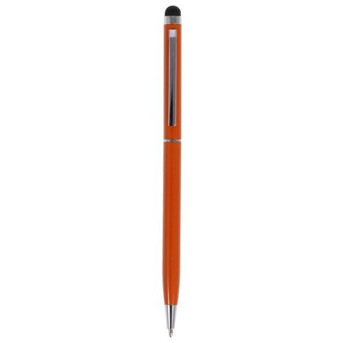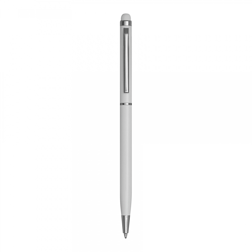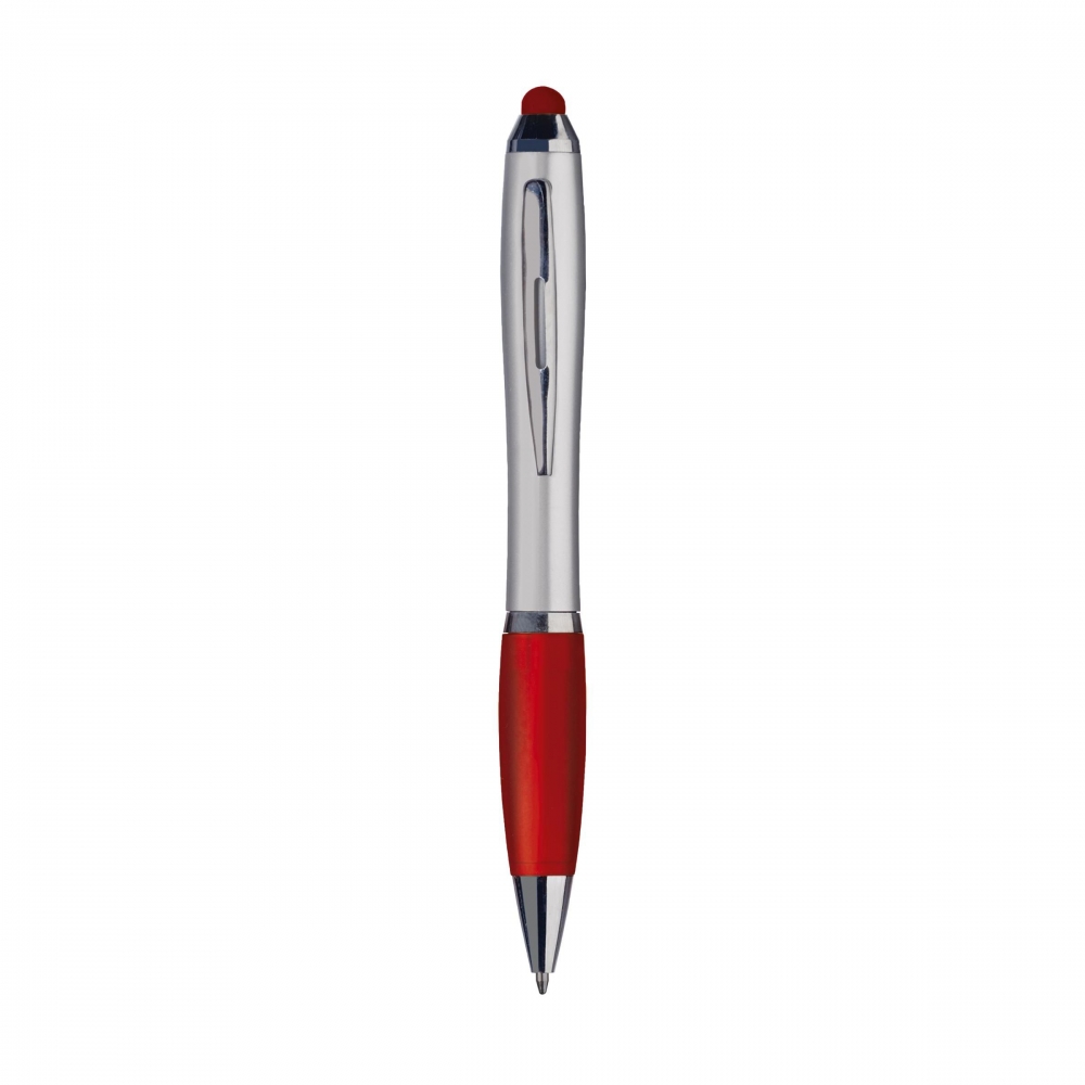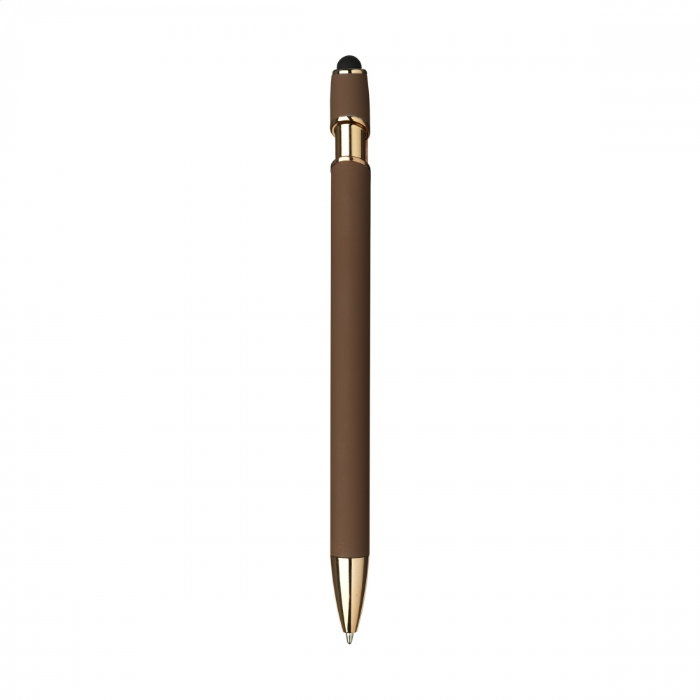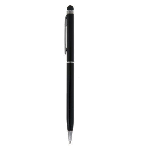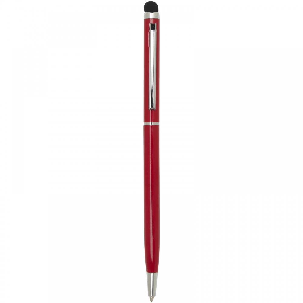 Multifunktions-Kugelschreiber mit schlankem Profil und Stylus am oberen Ende für kapazitive Touchscreen-Geräte. Gehäuse mit Glanzoberfläche und Metallverzierung.