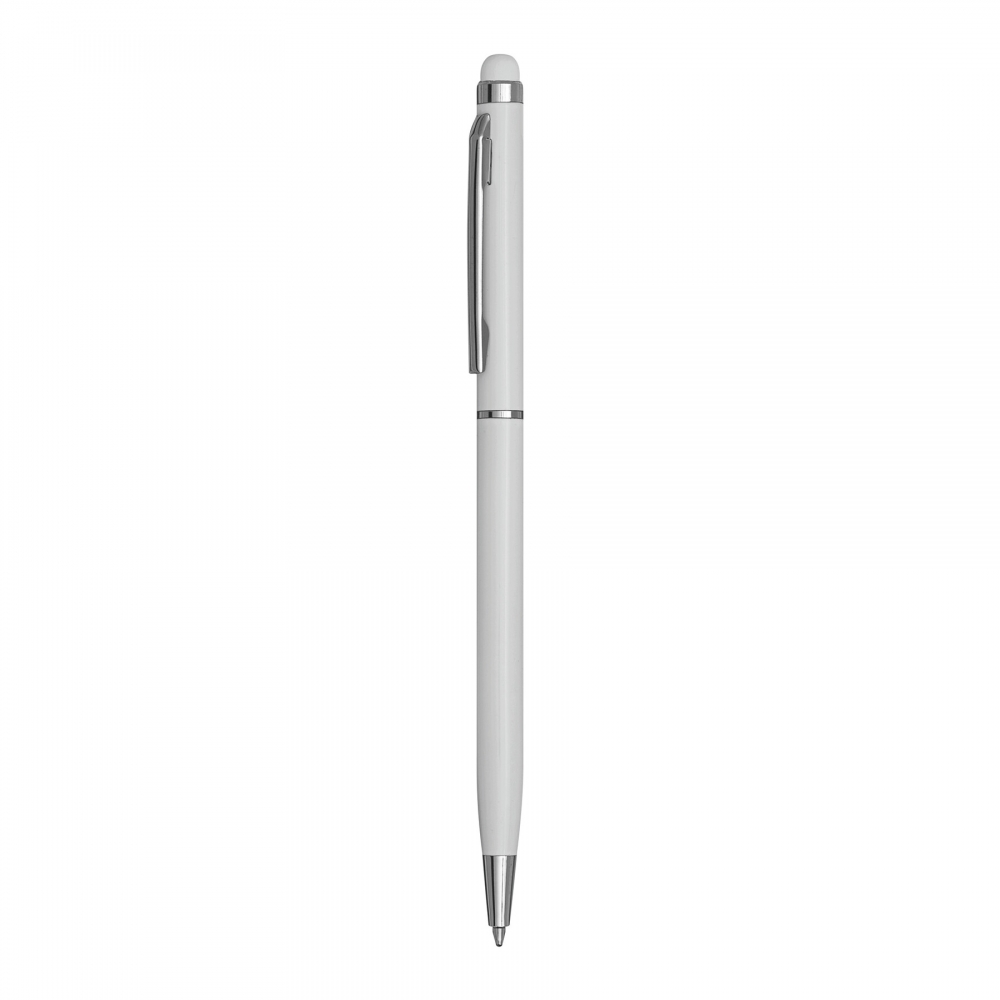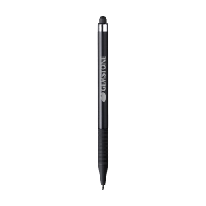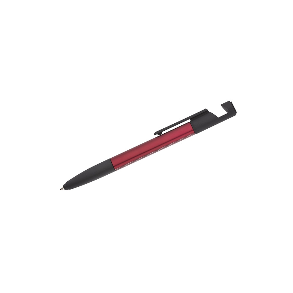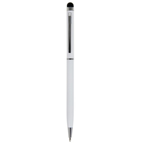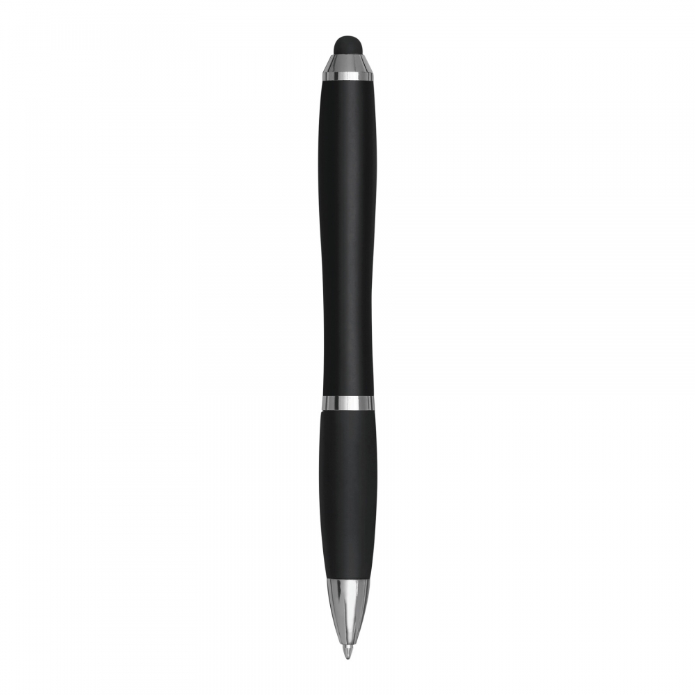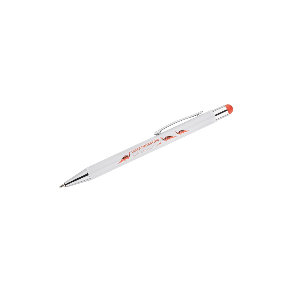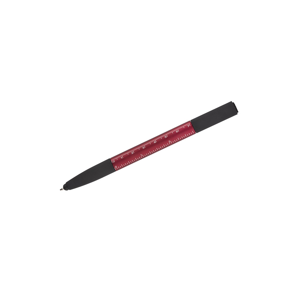 Multifunktions-Kugelschreiber mit schlankem Profil und Stylus am oberen Ende für kapazitive Touchscreen-Geräte. Gehäuse mit Glanzoberfläche und Metallverzierung.