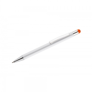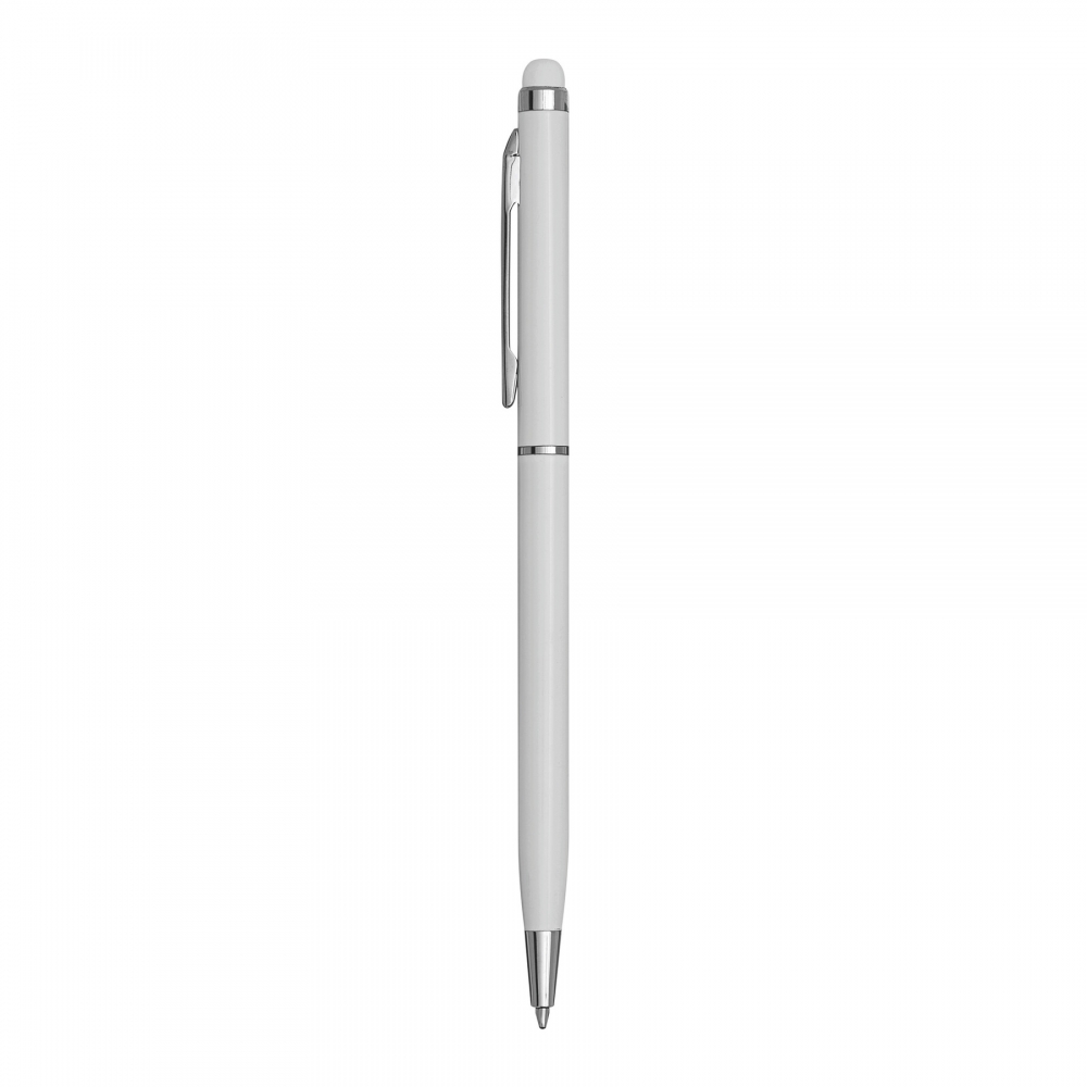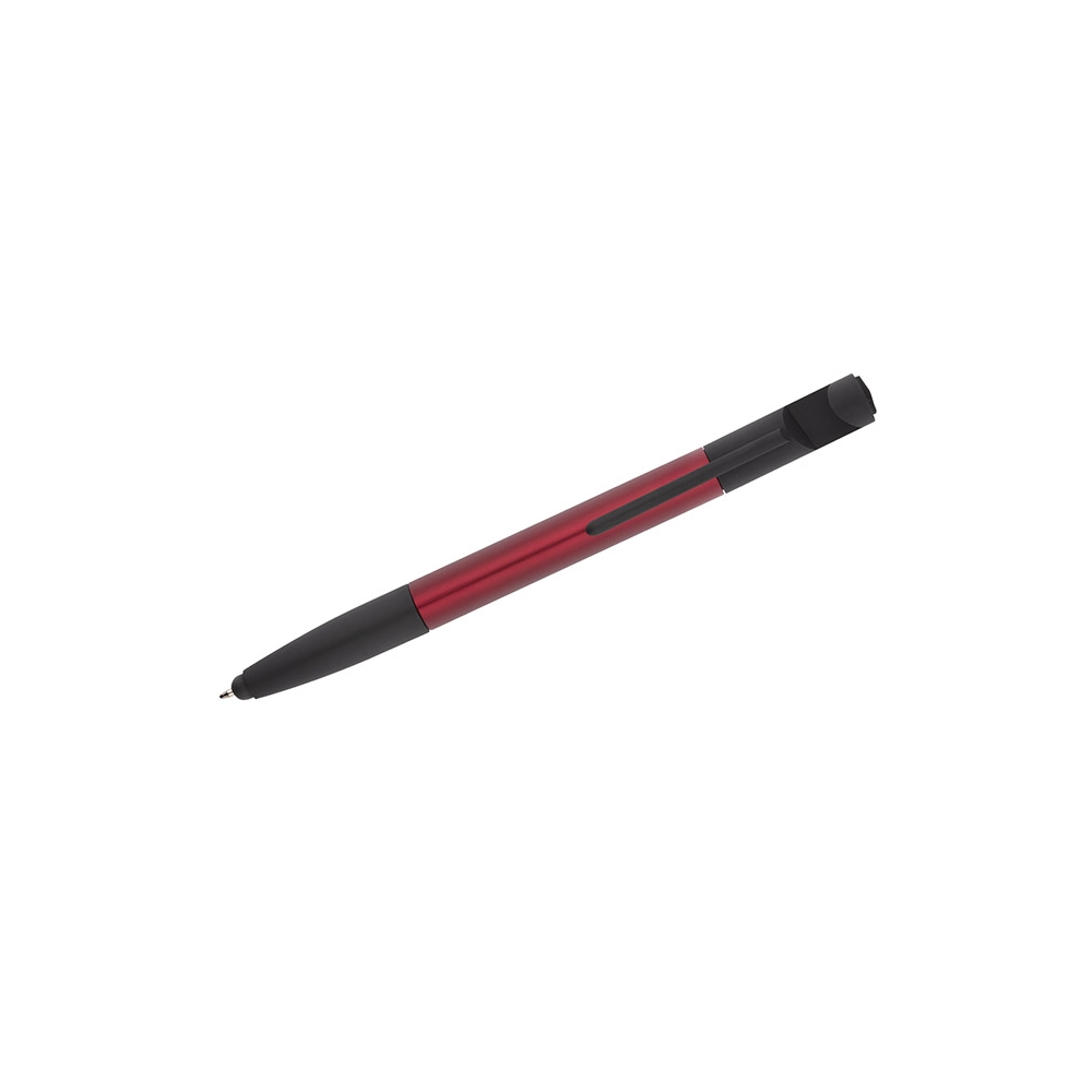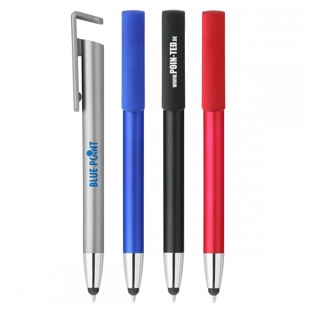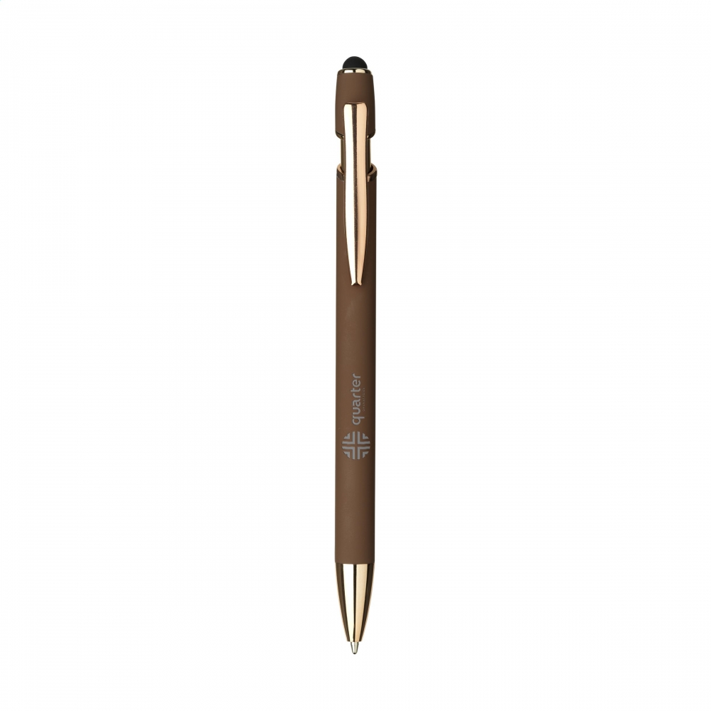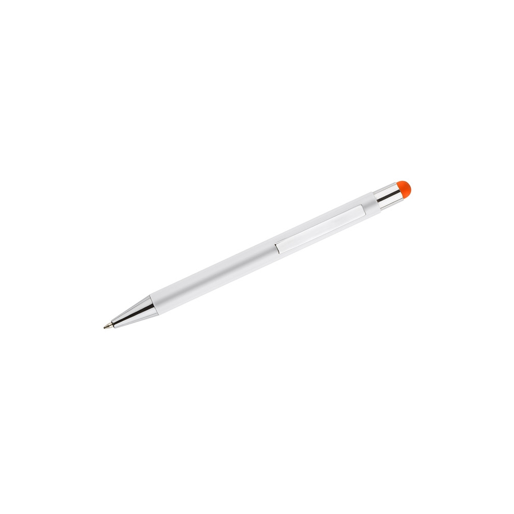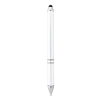 Multifunktions-Kugelschreiber mit schlankem Profil und Stylus am oberen Ende für kapazitive Touchscreen-Geräte. Gehäuse mit Glanzoberfläche und Metallverzierung.