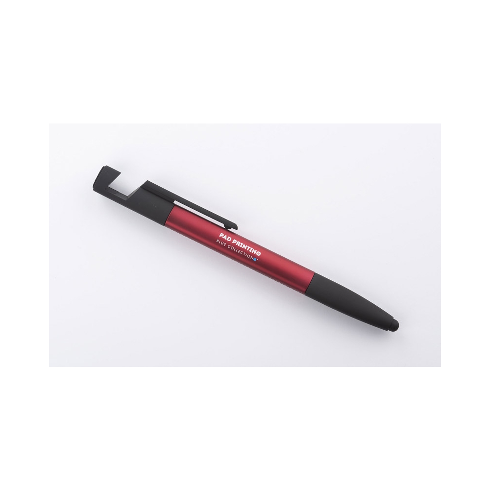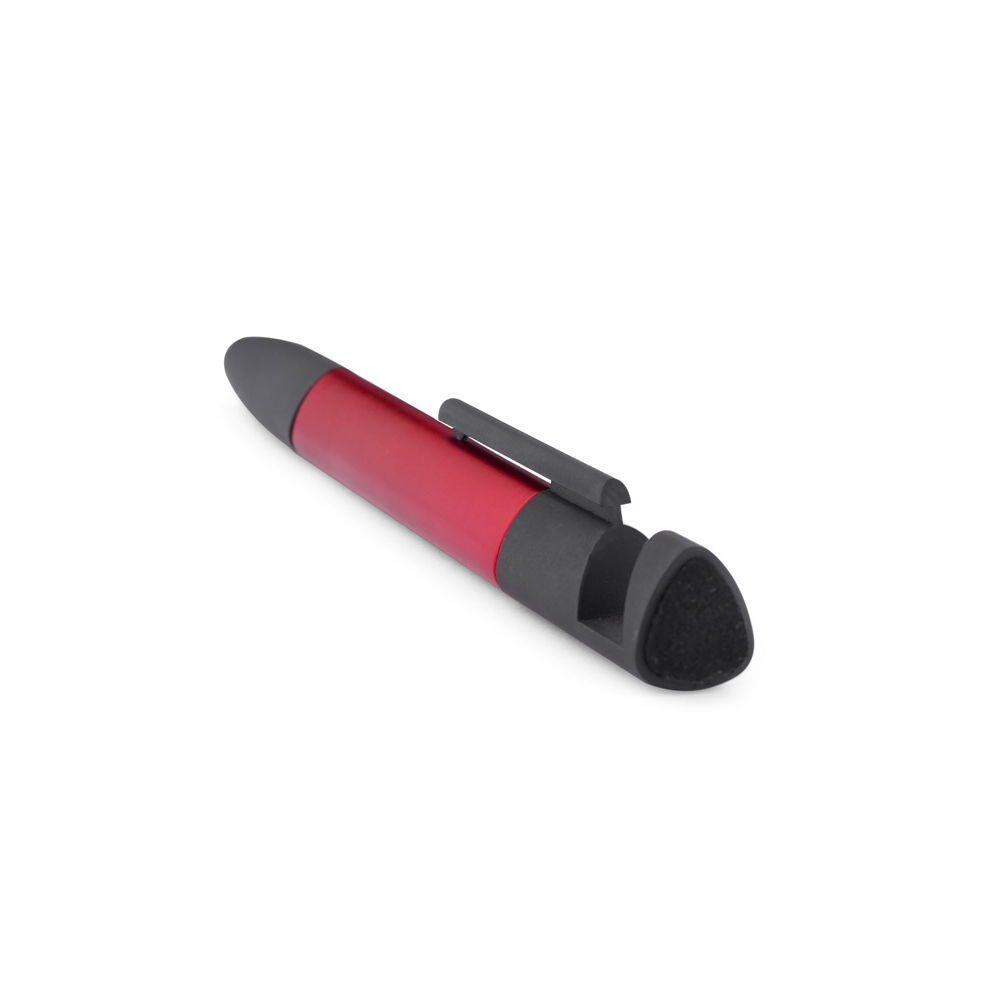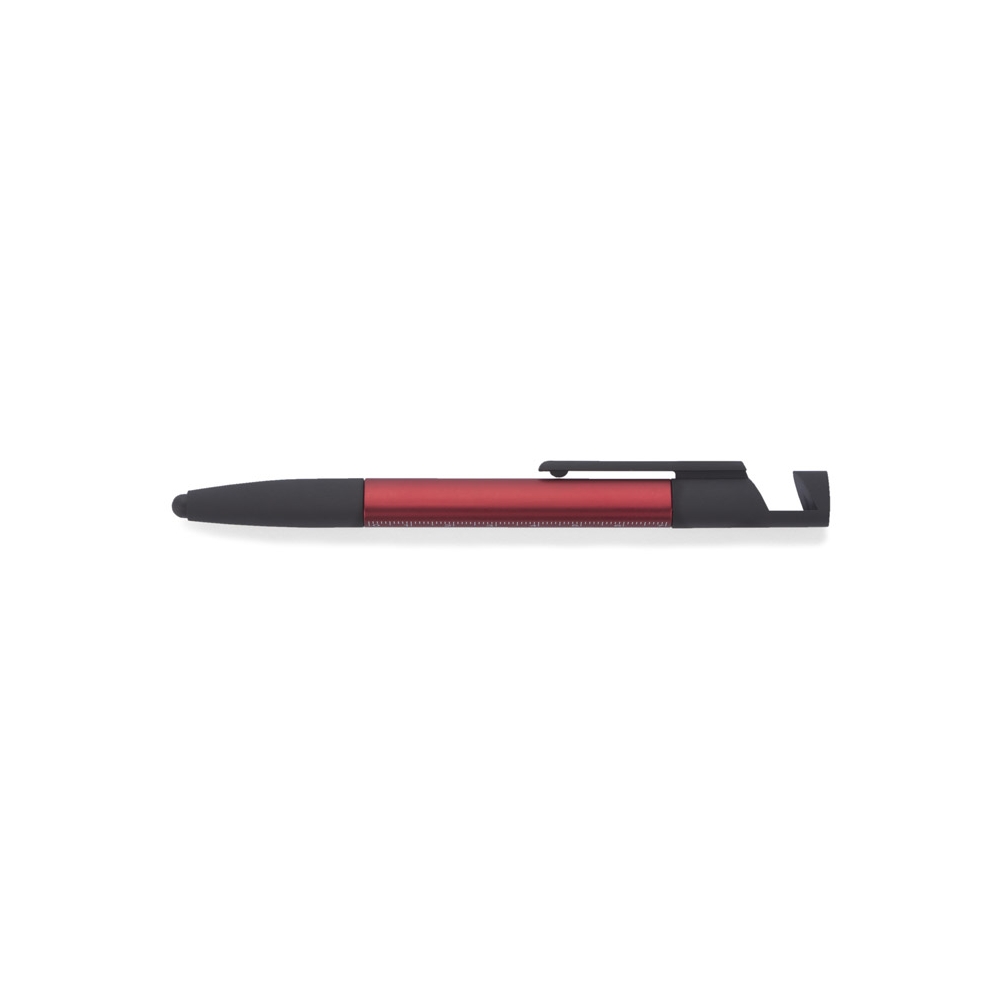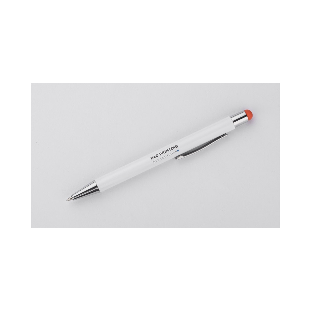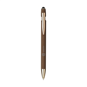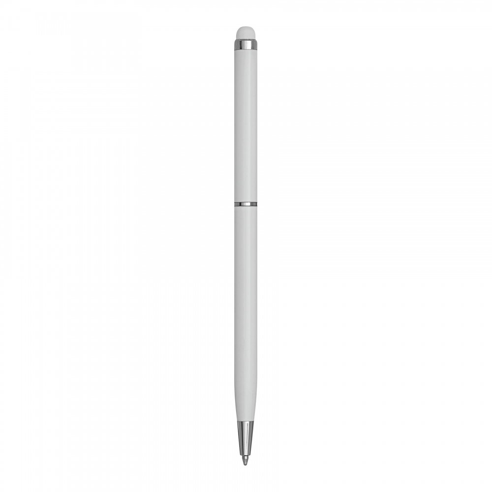 Multifunktions-Kugelschreiber mit schlankem Profil und Stylus am oberen Ende für kapazitive Touchscreen-Geräte. Gehäuse mit Glanzoberfläche und Metallverzierung.
