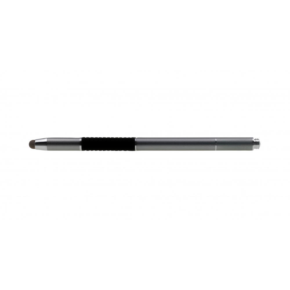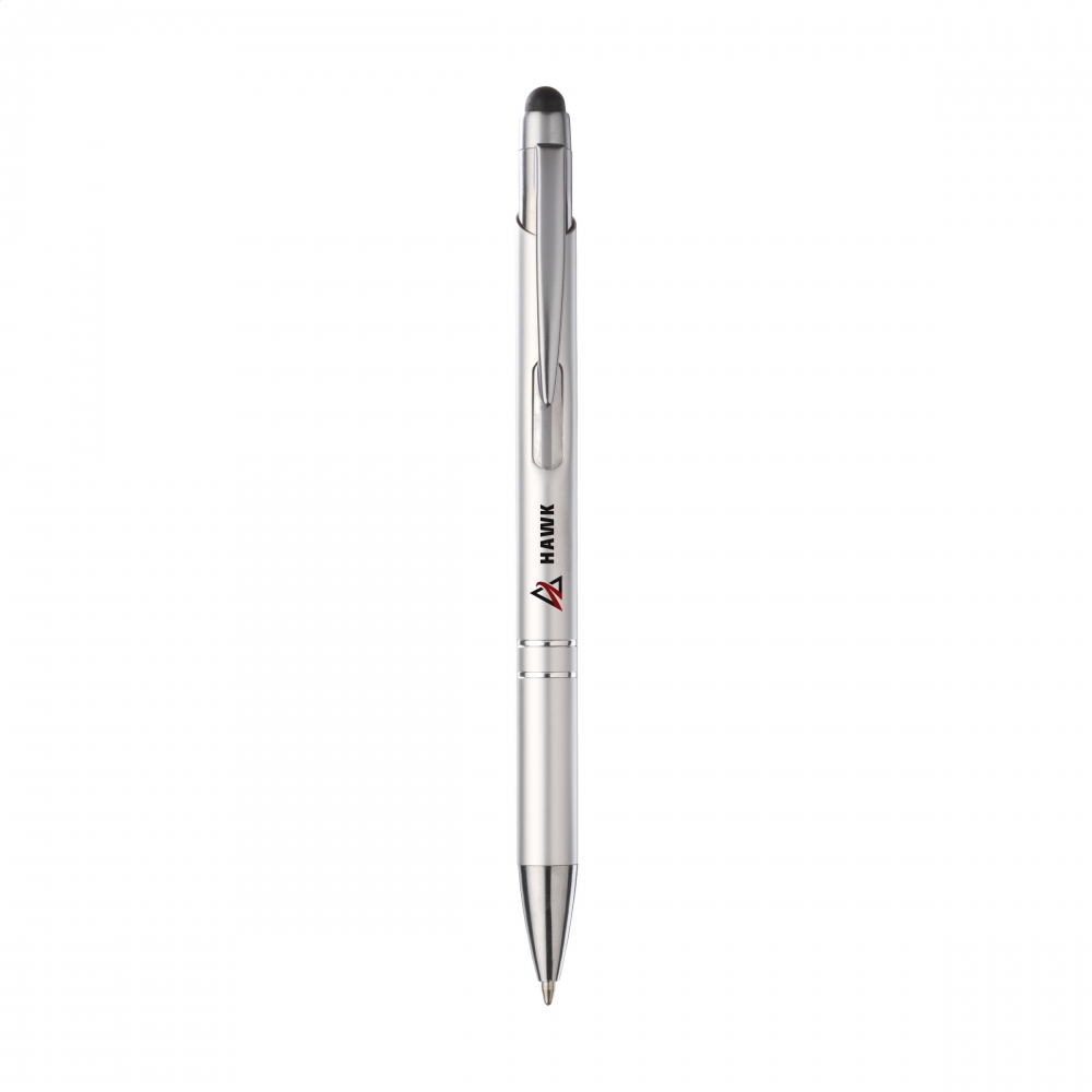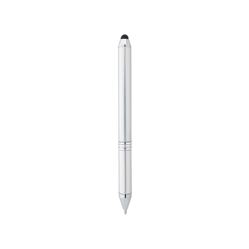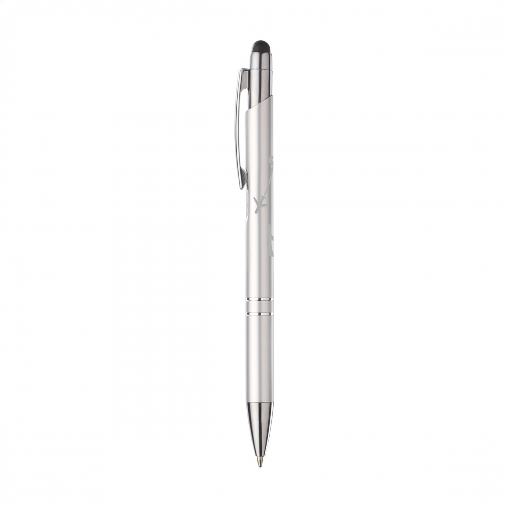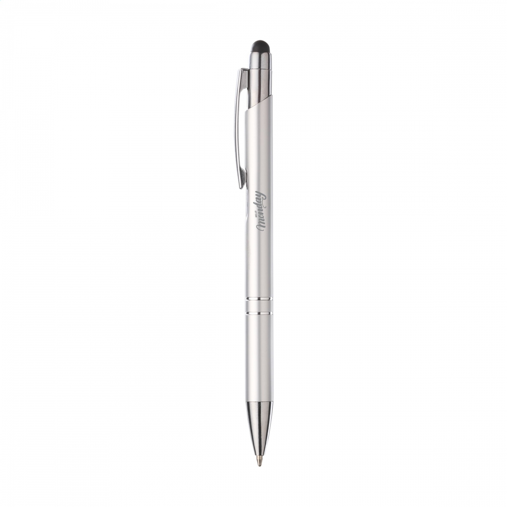 Druckkugelschreiber mit gummierter Spitze für die Touchscreensteuerung und integrierter Kugelschreibermine. Das Gehäuse ist silber matt, Spitze und Drücker in silber glänzend.