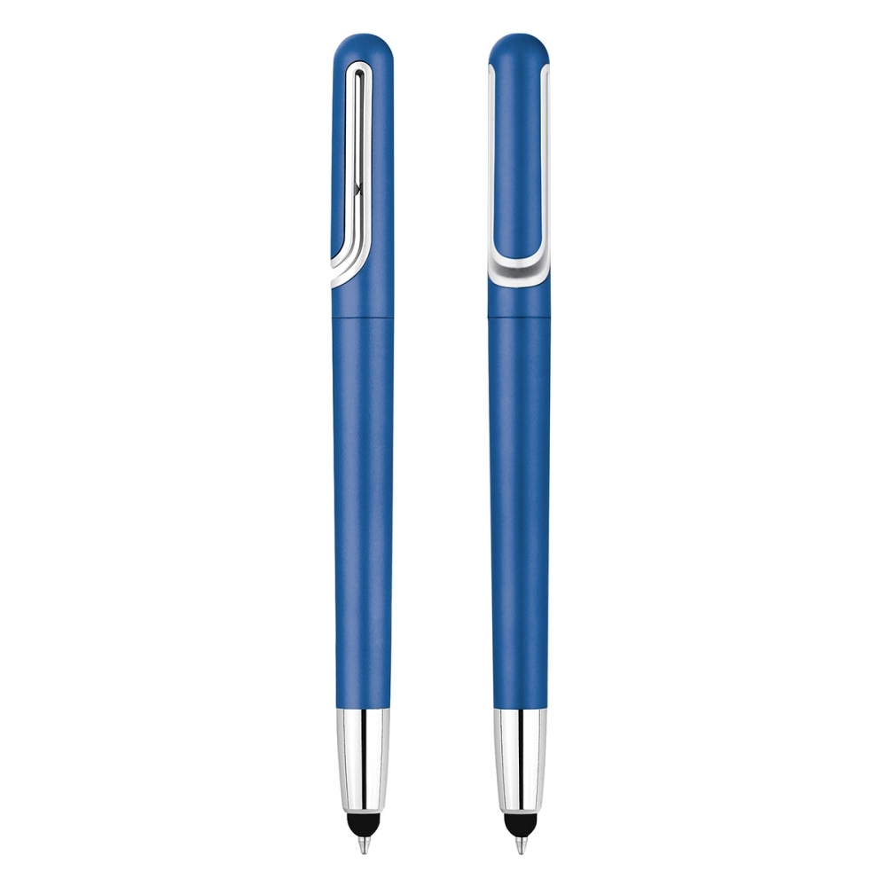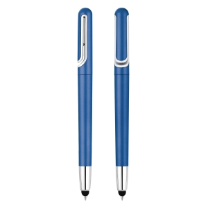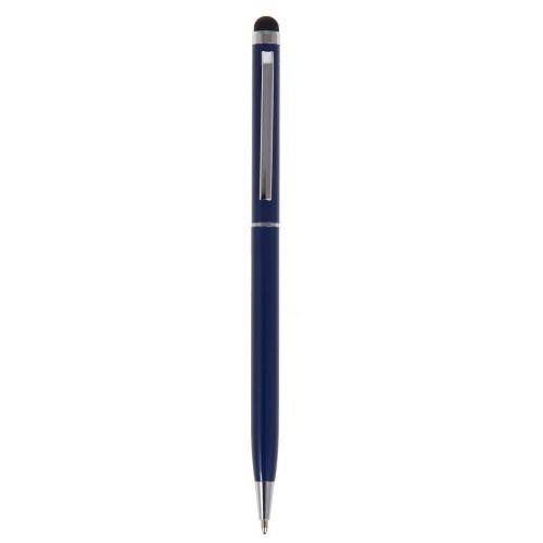 Blauschreibender Aluminium-Kugelschreiber mit griffestem Vorderteil, silbernen Akzenten und metallenem Clip. Mit gummierte Spitze zum Bedienen von Touchscreens (wie iPhone / iPad).