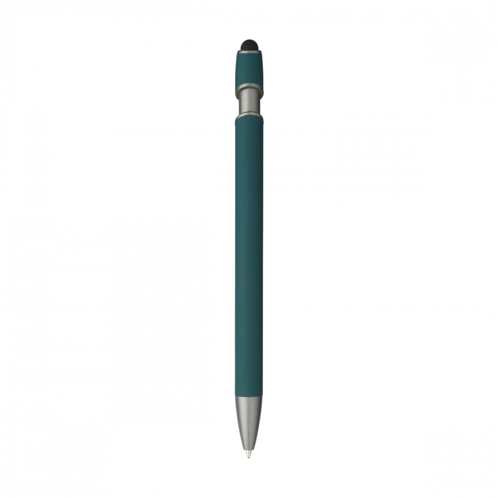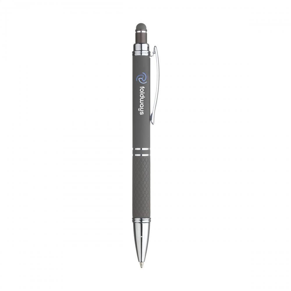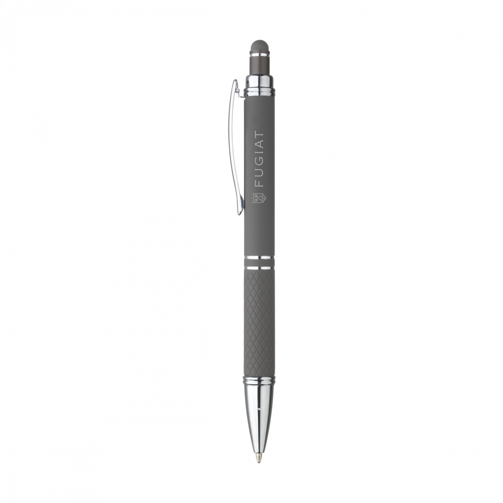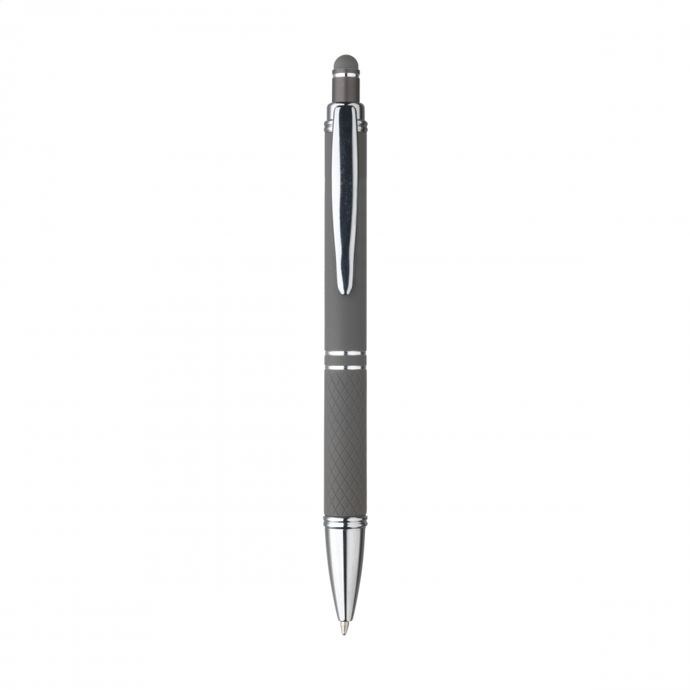 Multifunktions-Kugelschreiber mit Soft-Touch-Oberfläche und abgeflachtem, versenkbarem Clip sowie einem Stylus am oberen Ende für kapazitiveTouchscreen-Geräte. Chromfarbene Verzierung und Gummigriffzone.