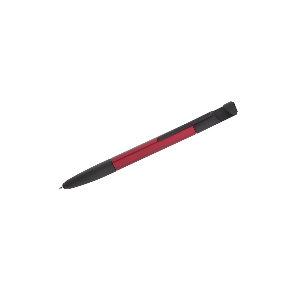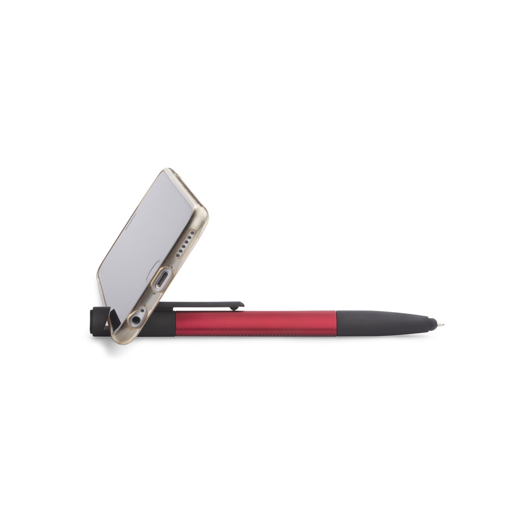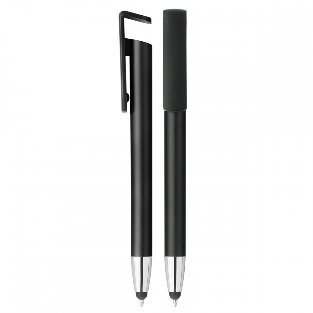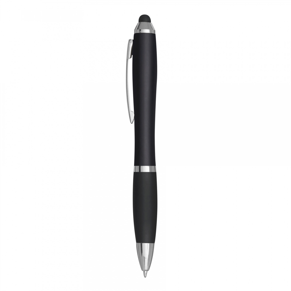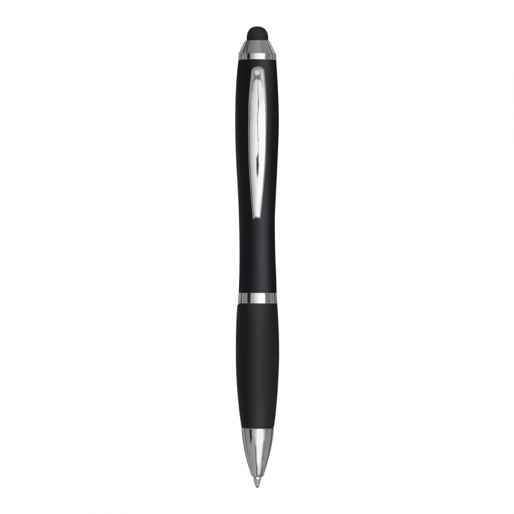 Multifunktions-Kugelschreiber mit Soft-Touch-Oberfläche und abgeflachtem, versenkbarem Clip sowie einem Stylus am oberen Ende für kapazitiveTouchscreen-Geräte. Chromfarbene Verzierung und Gummigriffzone.