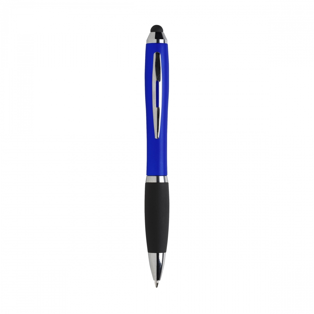 Blauschreibender Kugelschreiber mit gummiertem, grifffesten Vorderteil, hochglänzenden Akzenten, Aussparungen im Metallclip, gummierter Spitze / Pointer zum Bedienen von Touchscreens (wie iPhone / iPad).