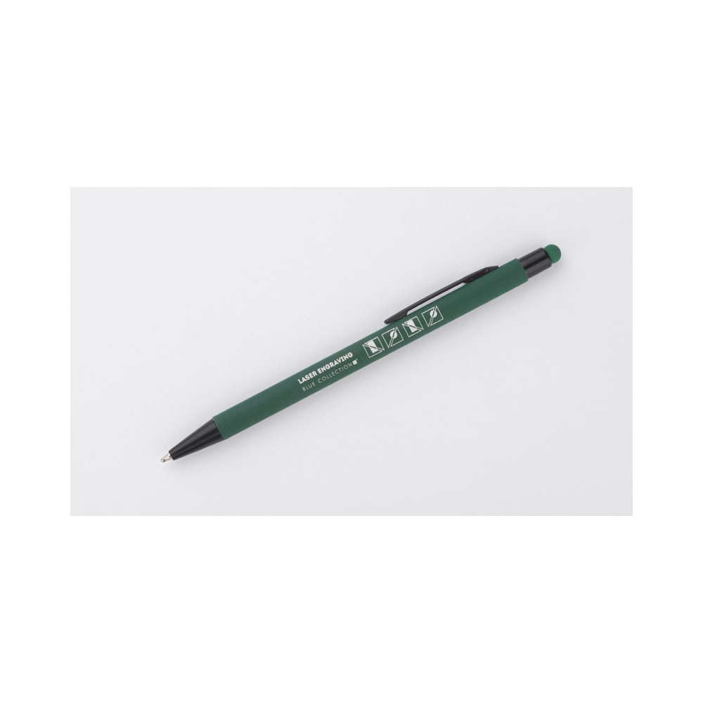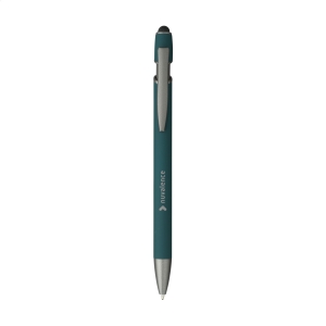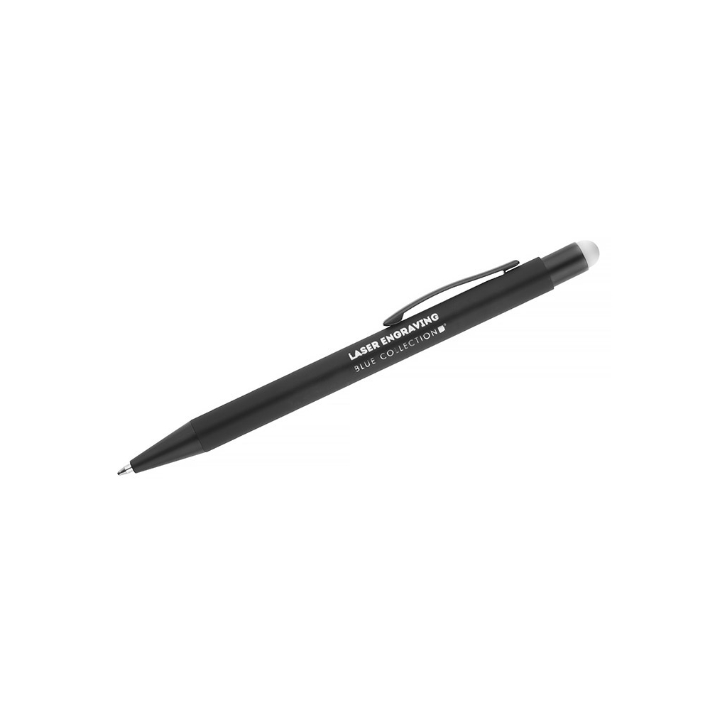 Blauschreibender Aluminium-Kugelschreiber mit Metallclip und gummierter Spitze für das Bedienen von Touchscreens (wie iPhone / iPad). Der Halter ist mit einer schönen gummierte Soft-Touch-Oberfläche versehen. Auf dem Vorderteil ist ein spielerisches Relief angebracht, das für einen festen Griff sorgt. Bei diesem Stift wurde viel Wert auf kleine zusätzliche Details gelegt. Das macht sein Design auffallend attraktiv.