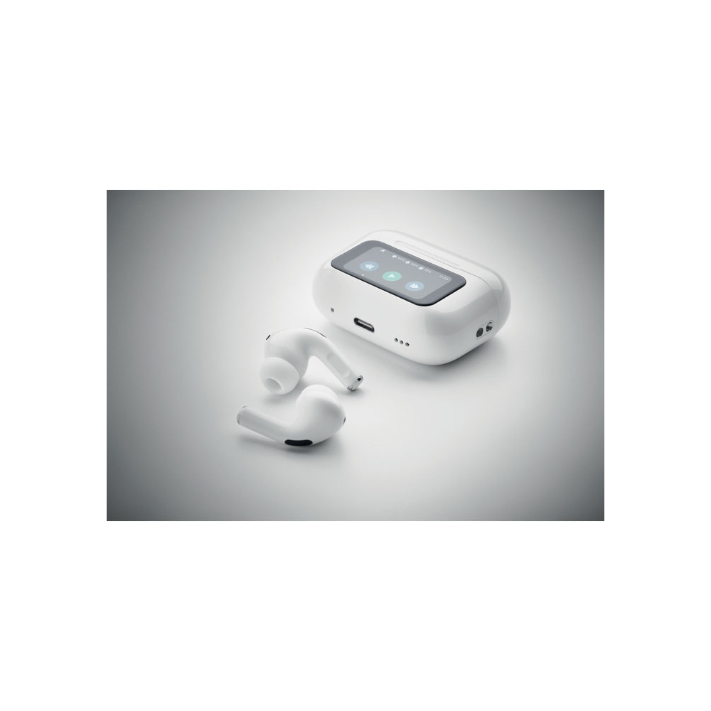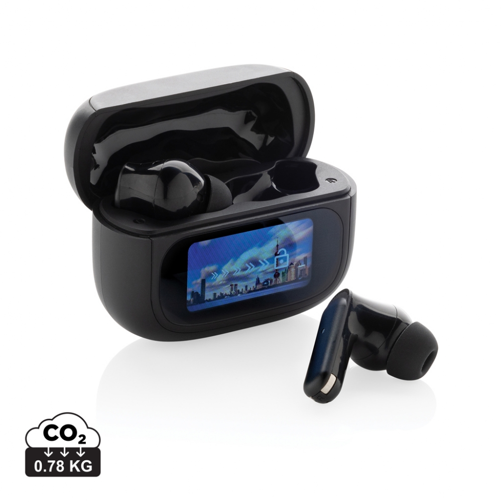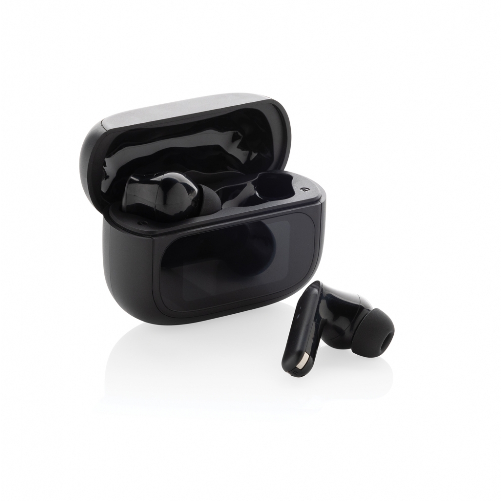 5.0 TWS True Wireless Stereo Ohrhörer-Set mit Mikrofon. ABS. Inkl. eingebauter 30 mAh Batterie. Mit ANC (Active Noise Cancellation) und ENC (Environmental Noise Cancellation) sowie Touchscreen Control & Display. Inkl. 230 mAh-Ladebox.