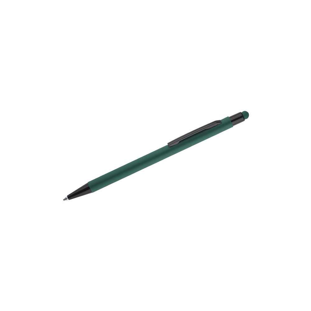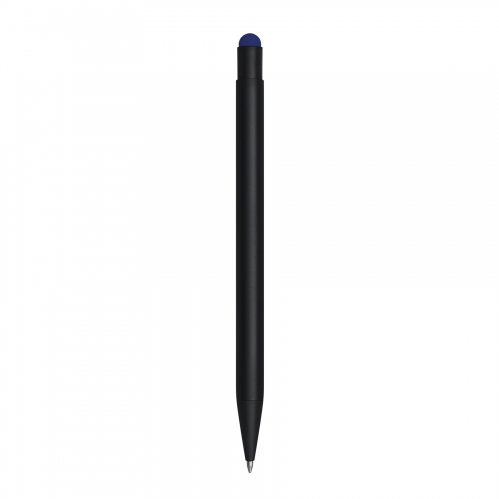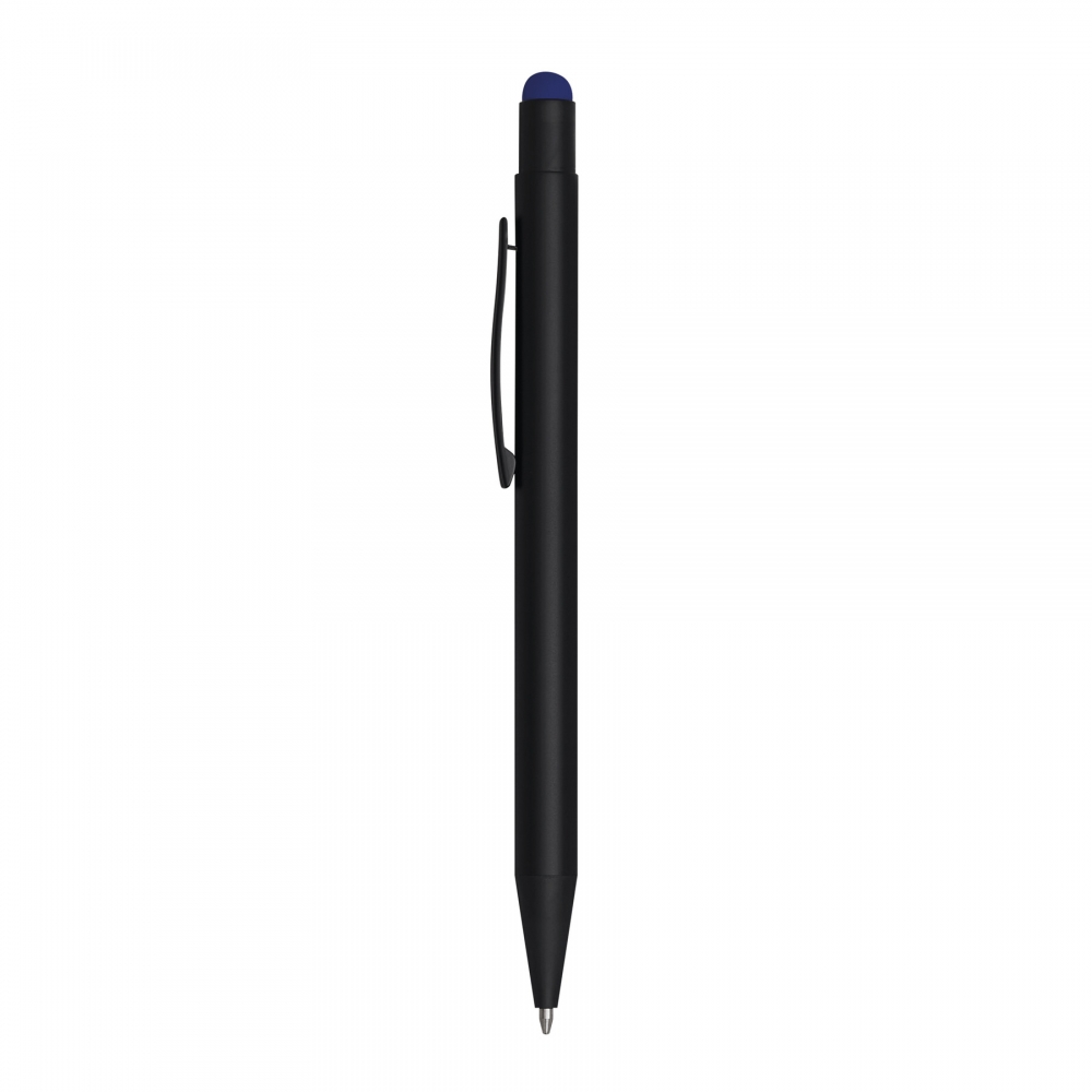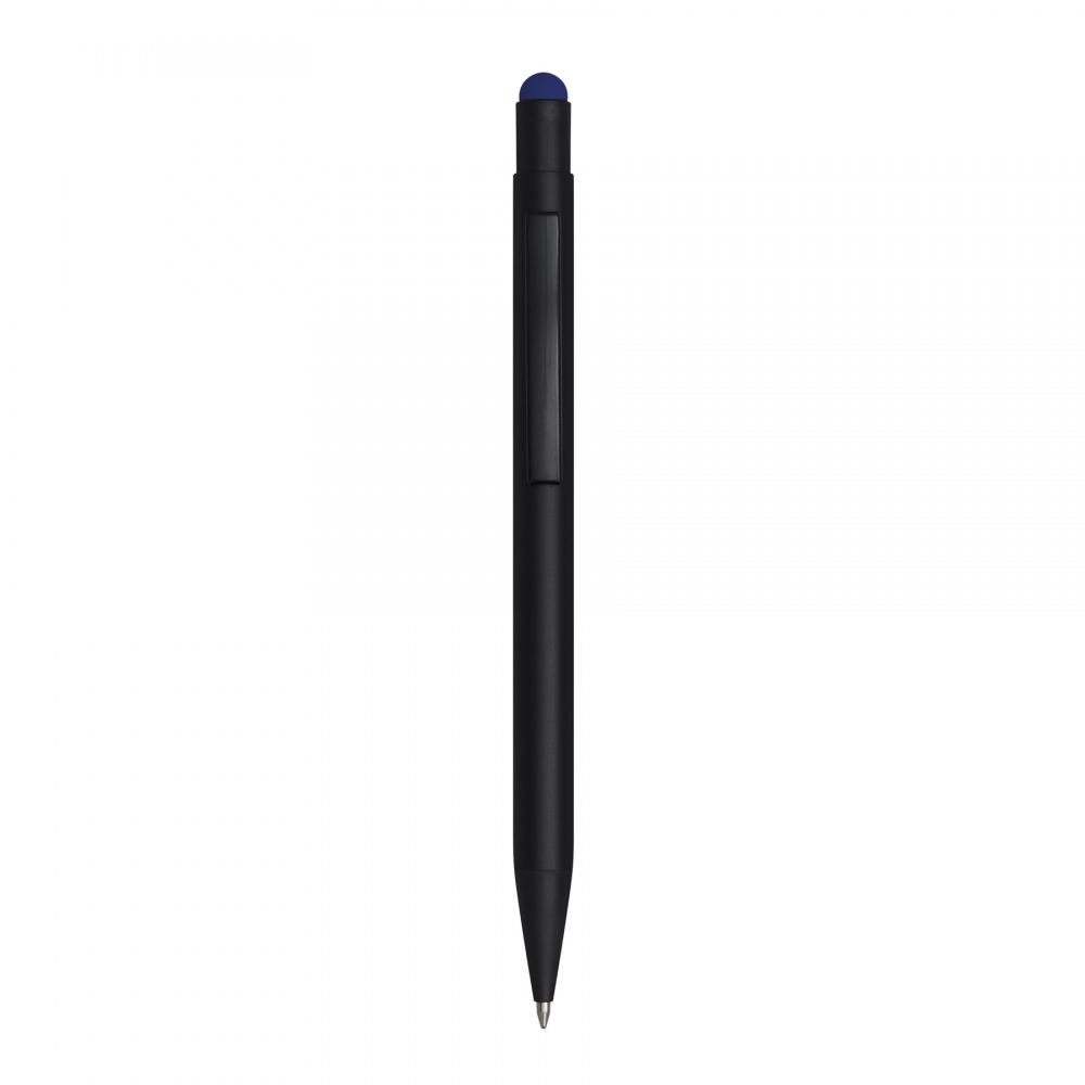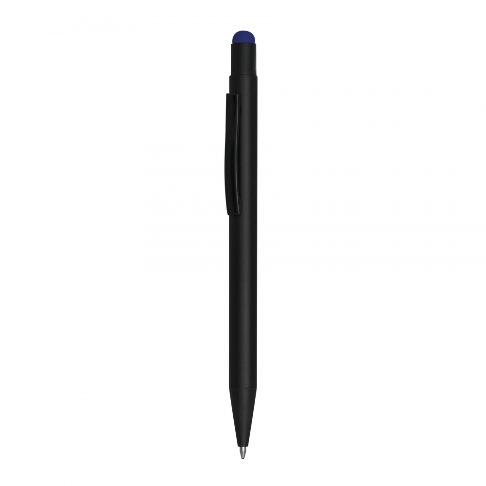Blauschreibender Kugelschreiber mit Aluminiumgehäuse, gummierte Spitze zum Bedienen von Touchscreens (wie iPhone / iPad), mattfarbenes Metallgehäuse und Metallclip/-druckknopf.