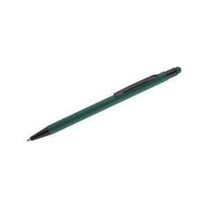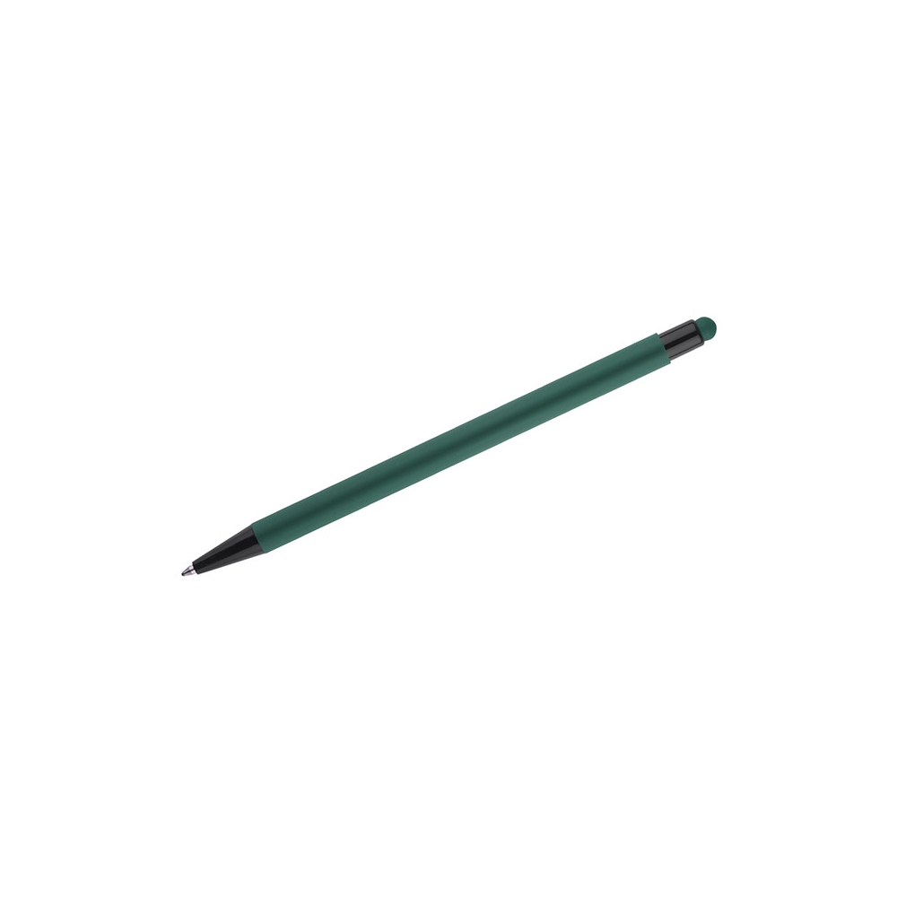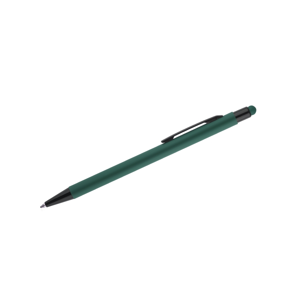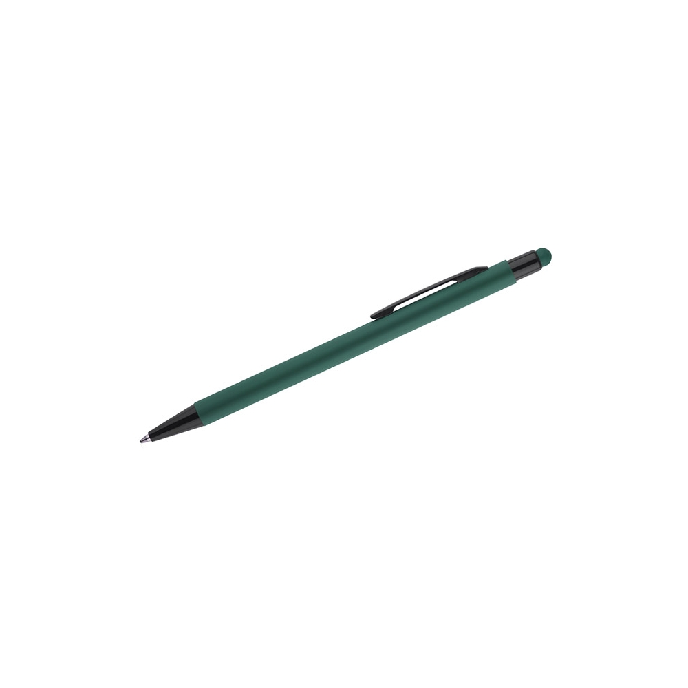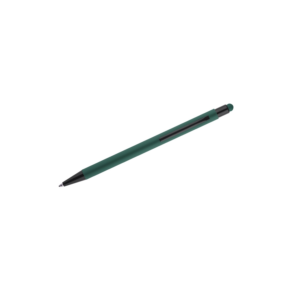 Blauschreibender Kugelschreiber mit Aluminiumgehäuse, gummierte Spitze zum Bedienen von Touchscreens (wie iPhone / iPad), mattfarbenes Metallgehäuse und Metallclip/-druckknopf.