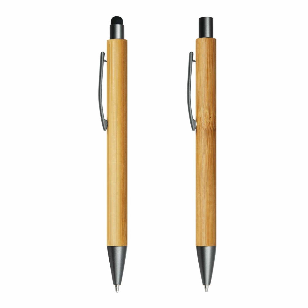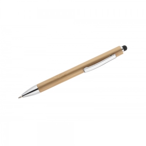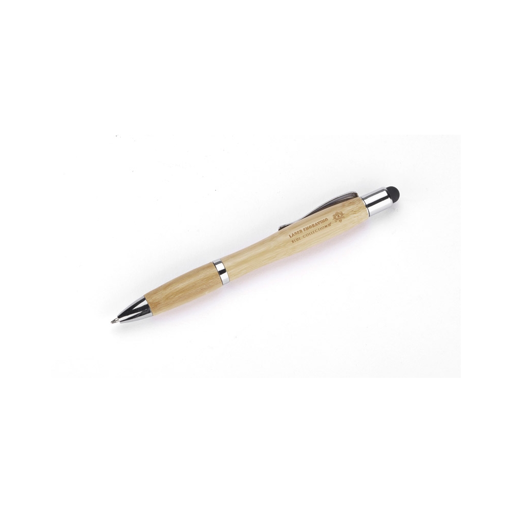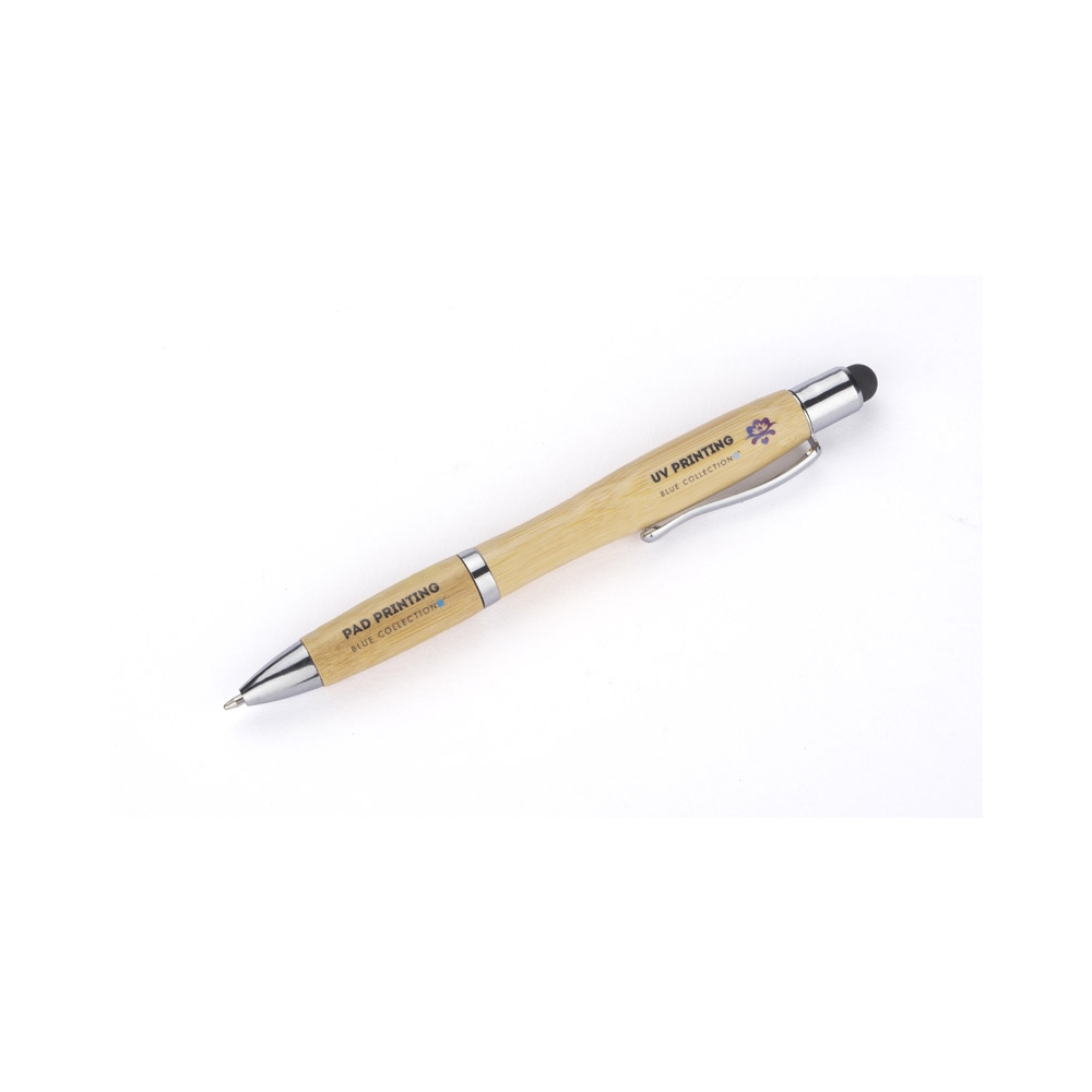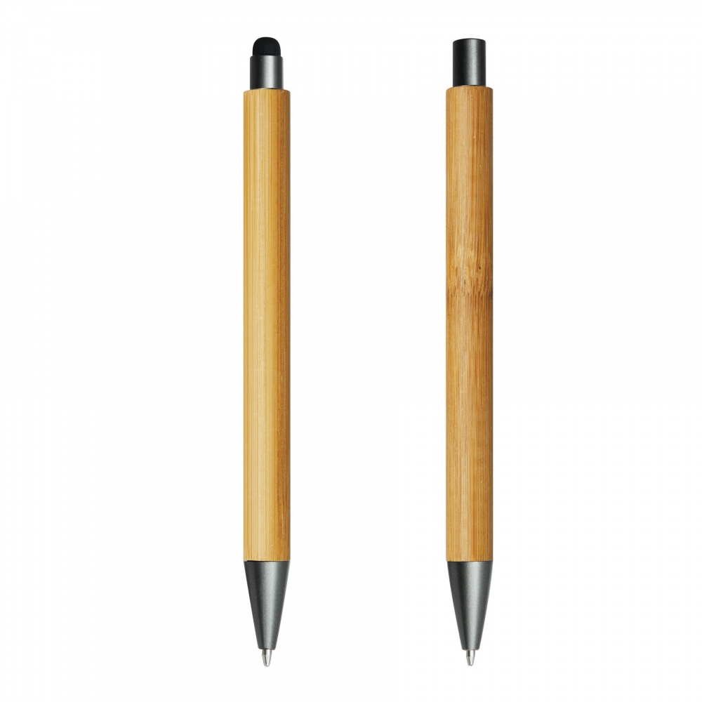 TUSO ist ein Stift, dessen Körper vollständig aus Bambus besteht. Verziert mit Chromelementen. Der farbenfrohe Tipp für Touchscreens ist eine interessante Dekoration. Automatischer Kugelschreiber. Ersatzmine Typ G2 in blau.