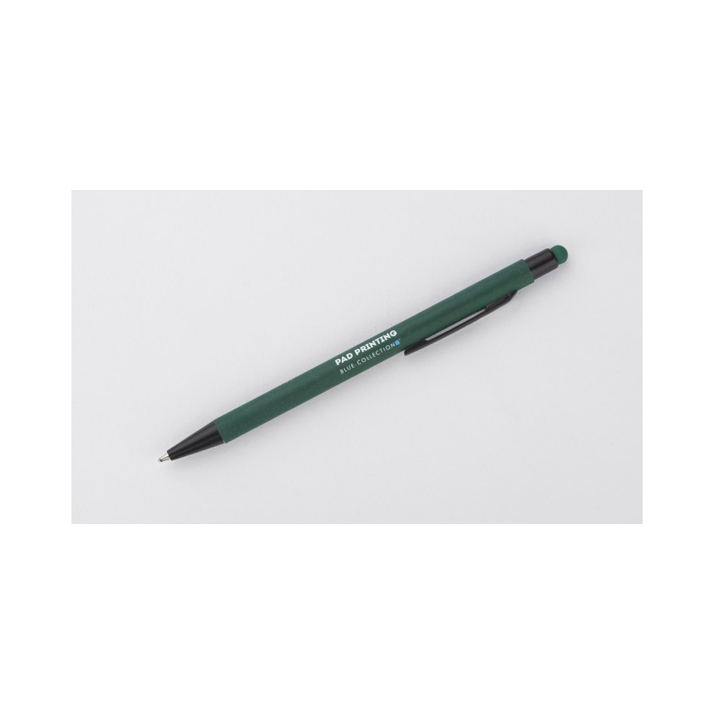 WoW! Blauschreibender Kugelschreiber mit Recyclingkartongehäuse, gummierter Spitze zum Bedienen von Touchscreens und Kunststoffakzenten.