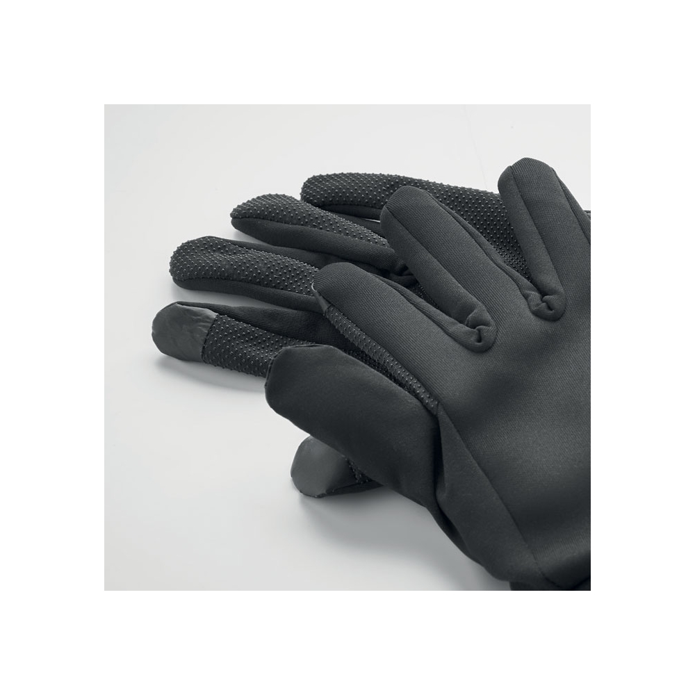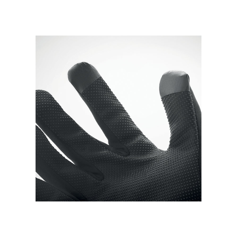 Touchscreen Sporthandschuhe aus Polyester. Zwei Fingerspitzen sind speziell gearbeitet, so dass Sie Touchscreens problemlos bedienen können. Handfläche mit Anti-Rutsch-Noppen.
