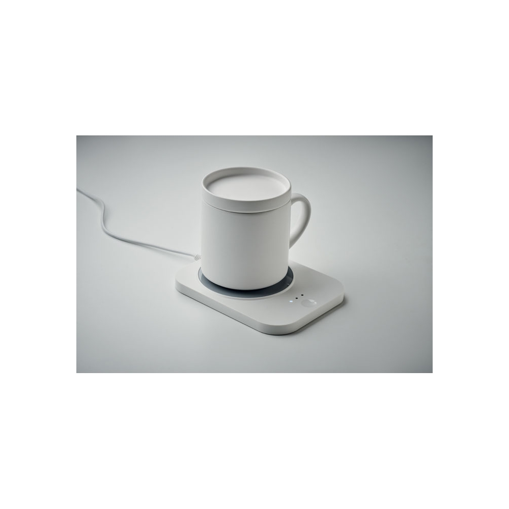 2 in 1 kabellose Ladestation 15W und Tassenwärmer aus ABS. Mit Becher und Deckel aus Keramik. Füllmenge: 250 ml. Hält Getränke bis max. 50 °C warm. Touchscreen mit 3 Temperatureinstellungen. USB-Kabel. Ausgang: DC 9 V/1,67 A (15 W).