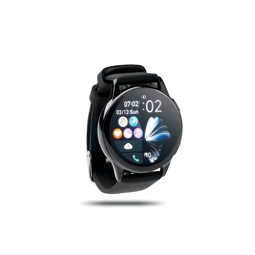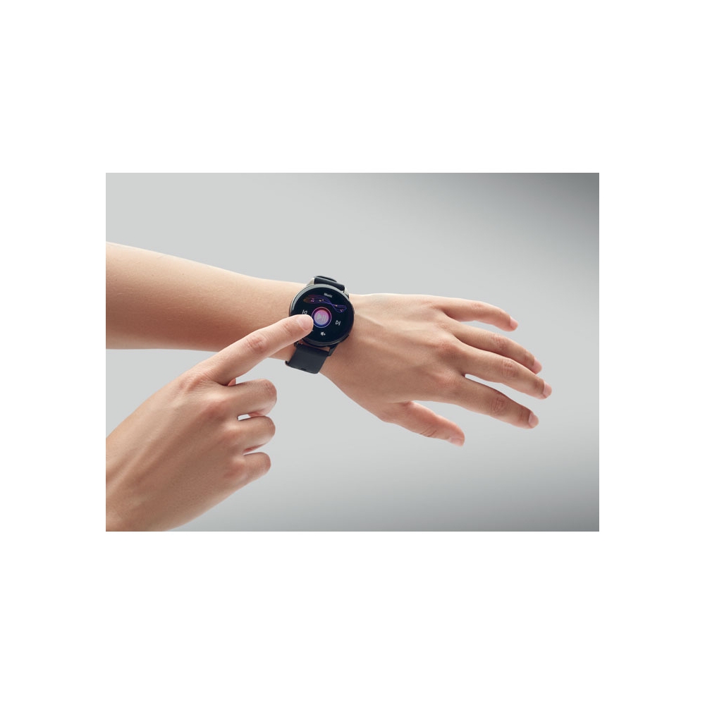 Multifunktions-Smartwatch im lässigen Design, mit Bluetooth®-Verbindung. Rundes Designgehäuse und passendes TPU-Armband. 1,30-Zoll-TFT-Touchscreen und 180-mAh-Akku machen es zum perfekten Gadget für alle Arten von Sport, Freizeit und Alltagsaktivitäten. Zahlreiche Funktionen verfügbar, mehrsprachige Benutzeroberfläche und spritzwassergeschützt, mit APP für iOS und Android verfügbar. Präsentiert in einer individuellen Designbox, mit Bedienungsanleitung in Englisch und Spanisch.
